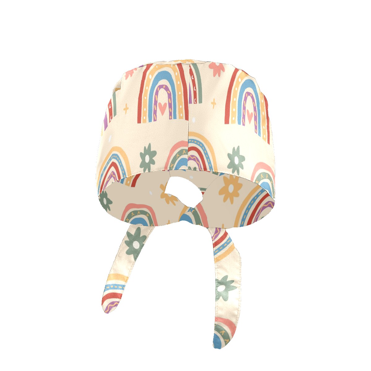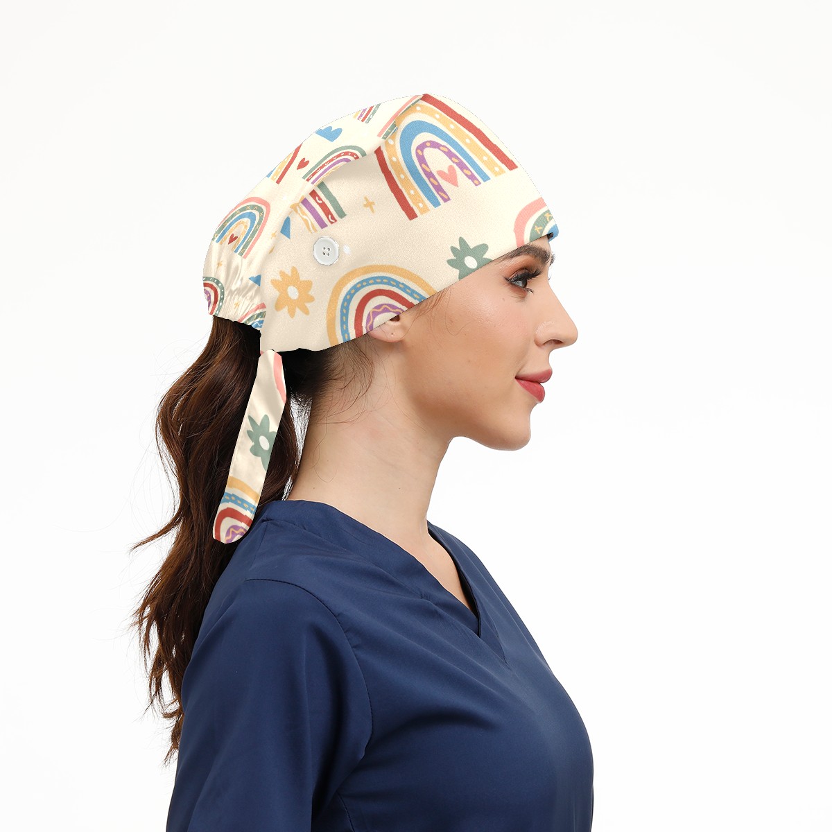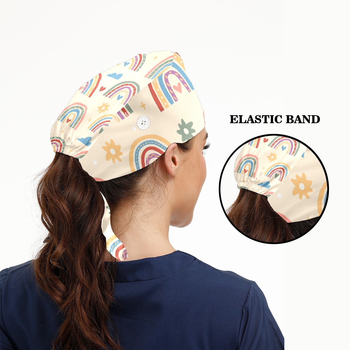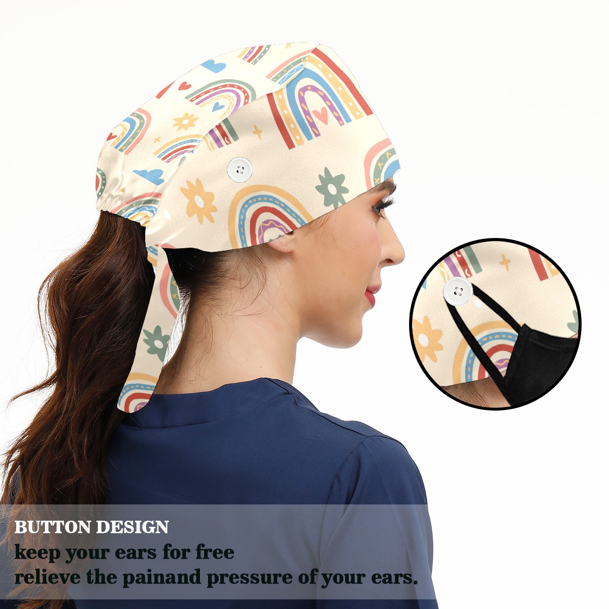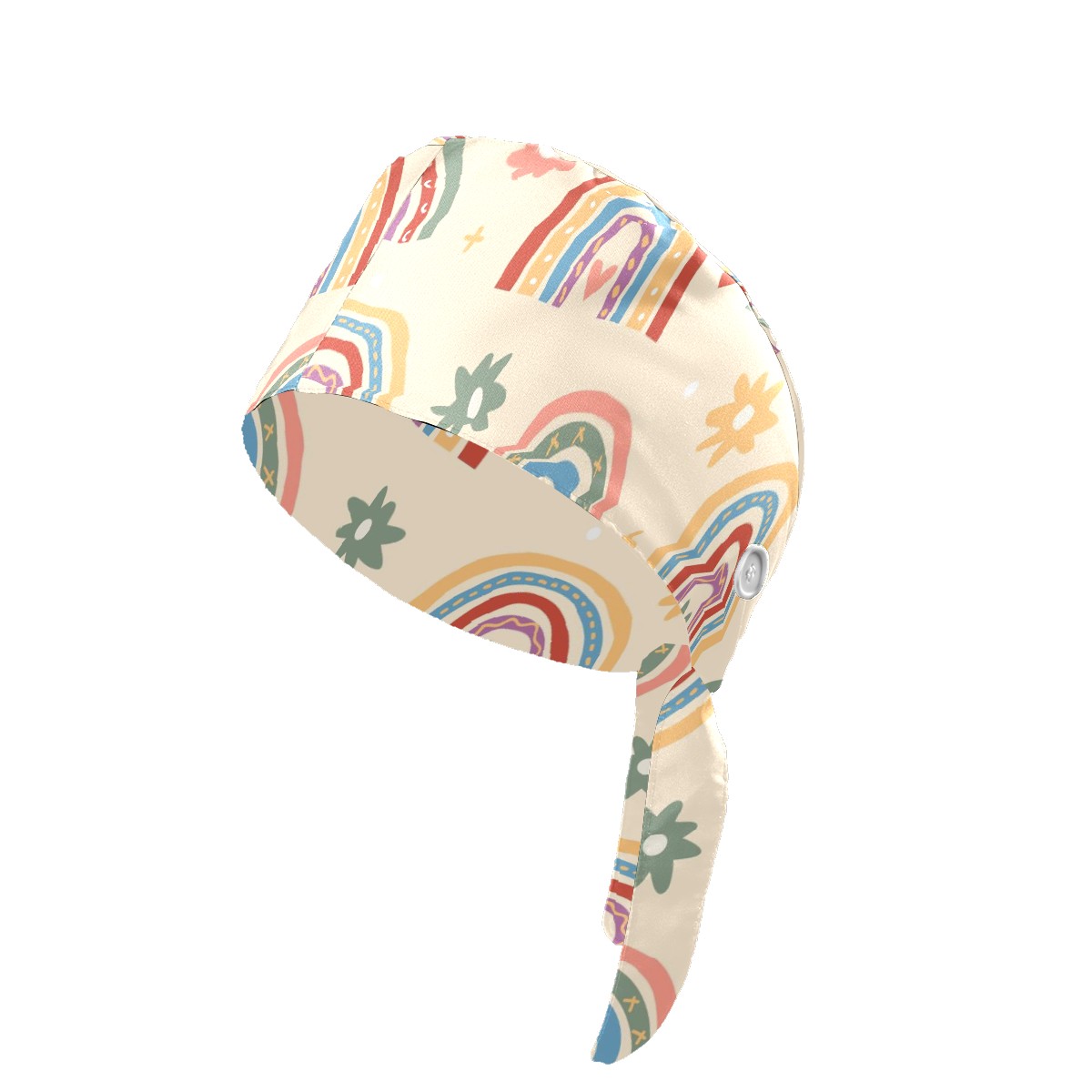Working Caps with Button & Sweatband Satin Lined Cotton Adjustable Nurse Hats Elastic Band Scrub Cap Surgeon Hat Boho Rainbow Cloud Heart