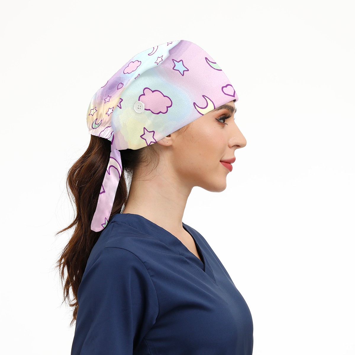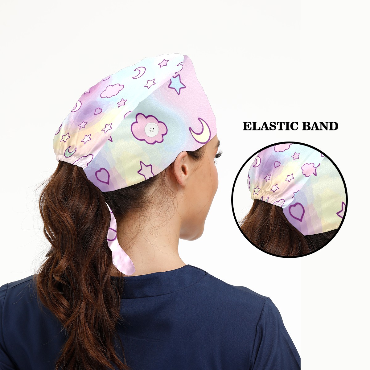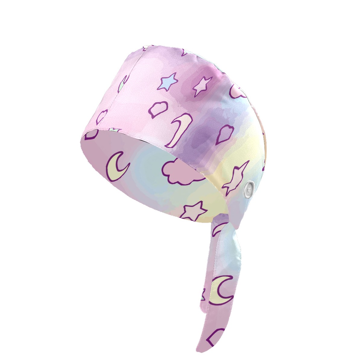 Working Caps with Button & Sweatband Satin Lined Cotton Adjustable Nurse Hats Elastic Band Scrub Cap Surgeon Hat Fantasy Cloud Moon Stars