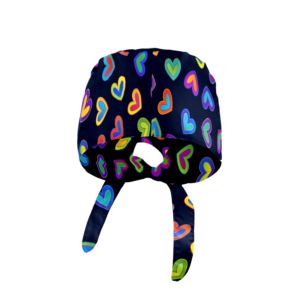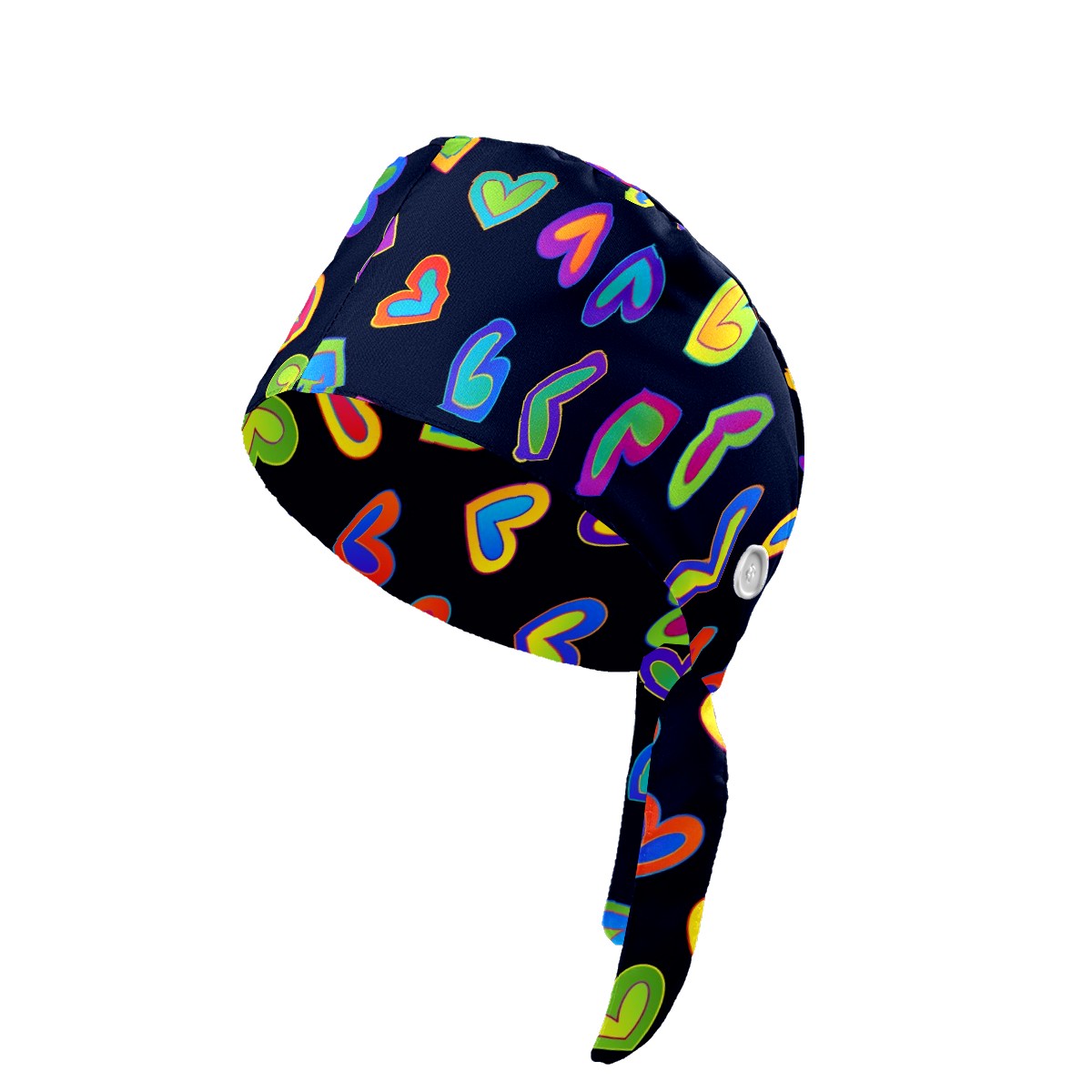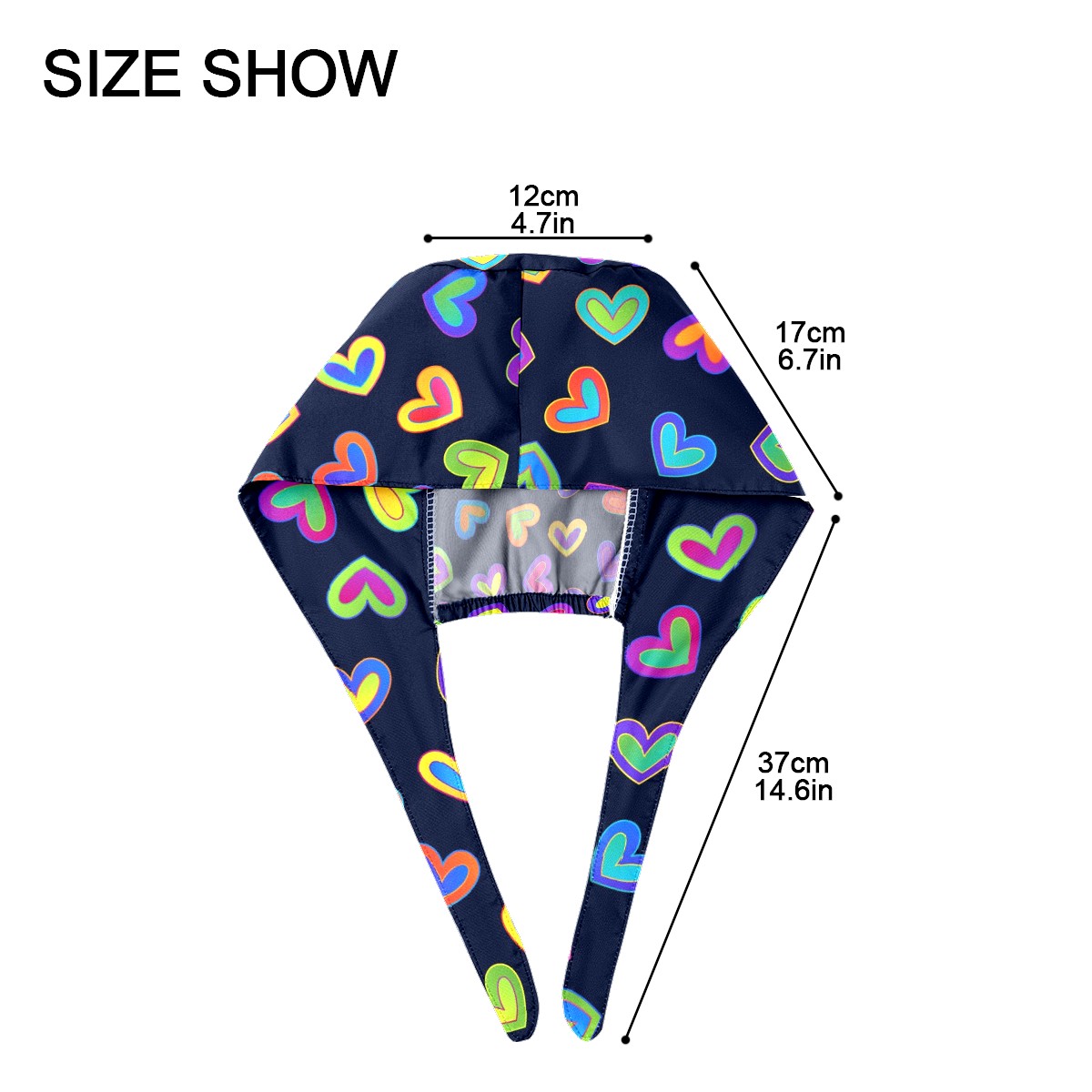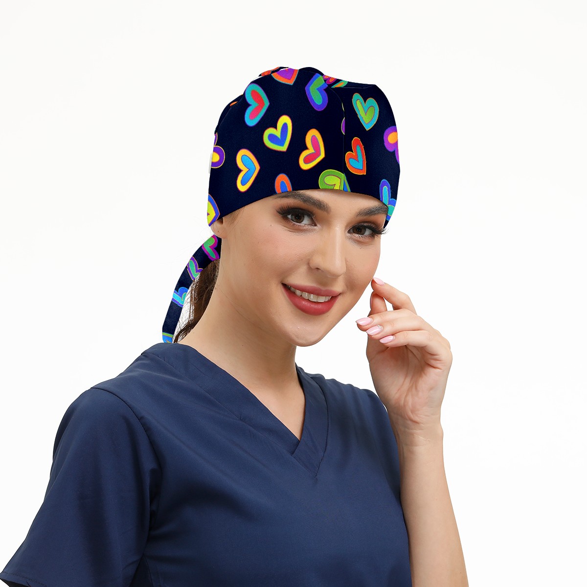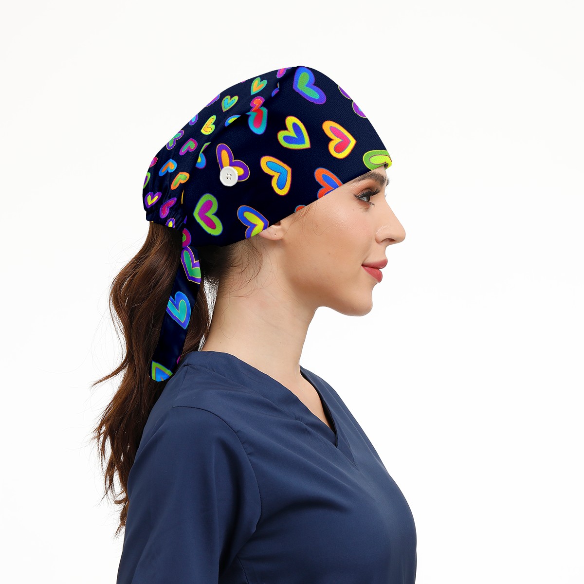 Working Caps with Button & Sweatband Satin Lined Cotton Adjustable Nurse Hats Elastic Band Scrub Cap Surgeon Hat Colorful Hearts On Dark Background