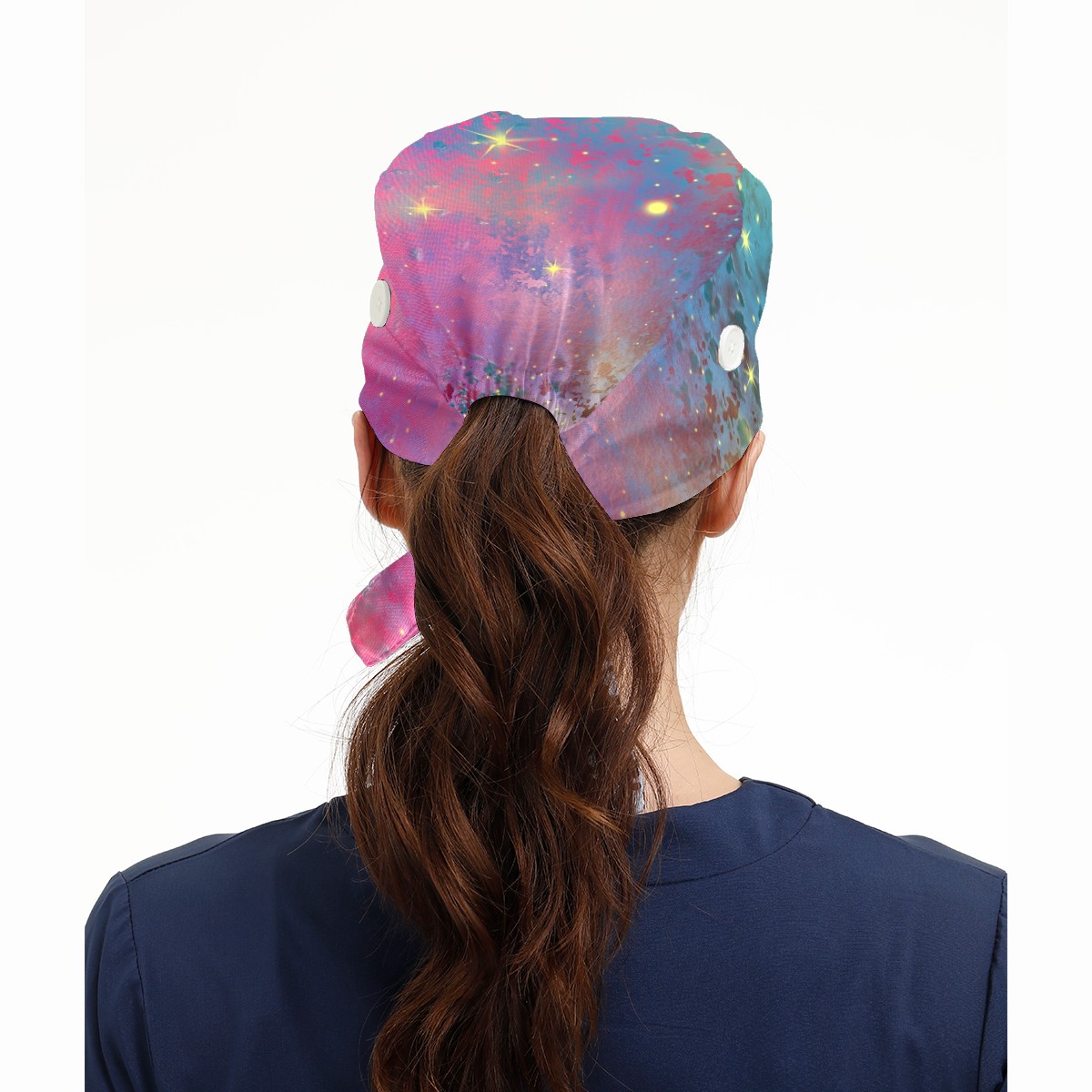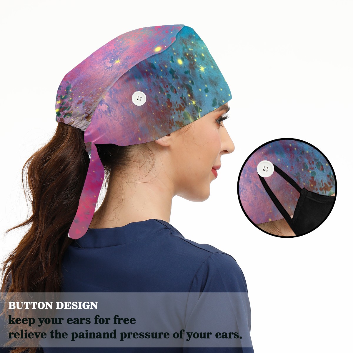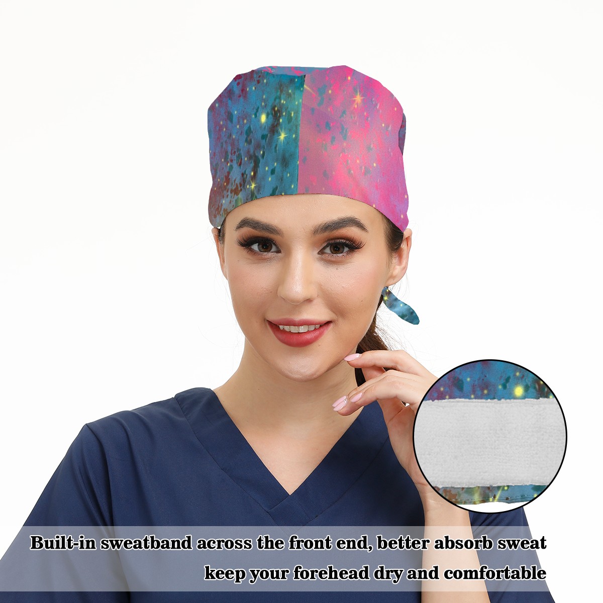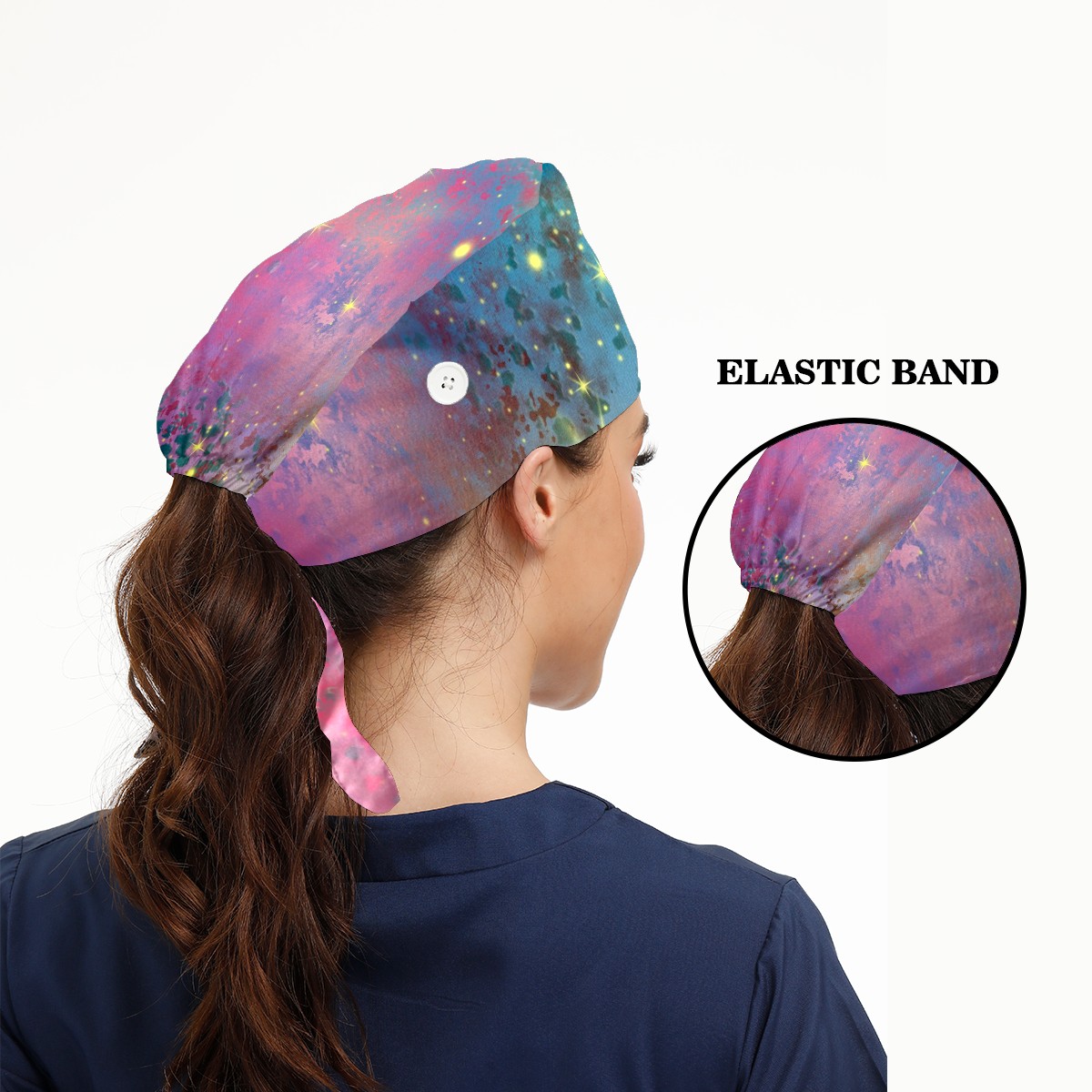 Working Caps with Button & Sweatband Satin Lined Cotton Adjustable Nurse Hats Elastic Band Scrub Cap Surgeon Hat Pink Galaxy Sky Stars