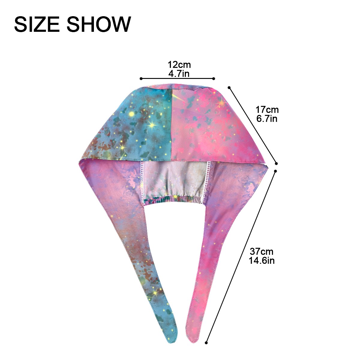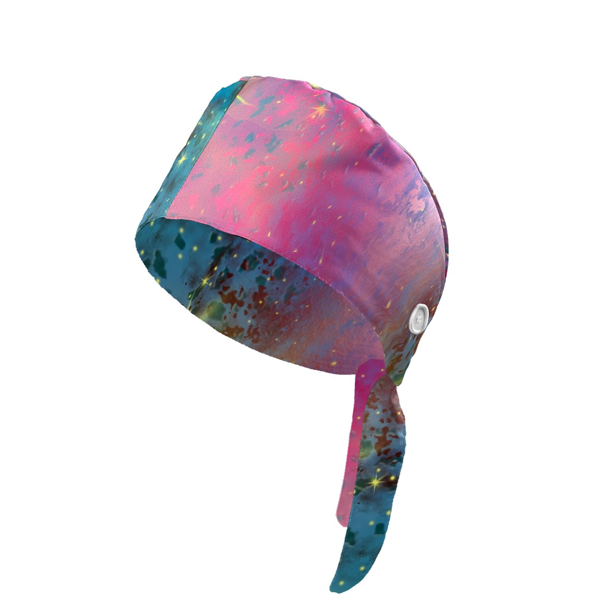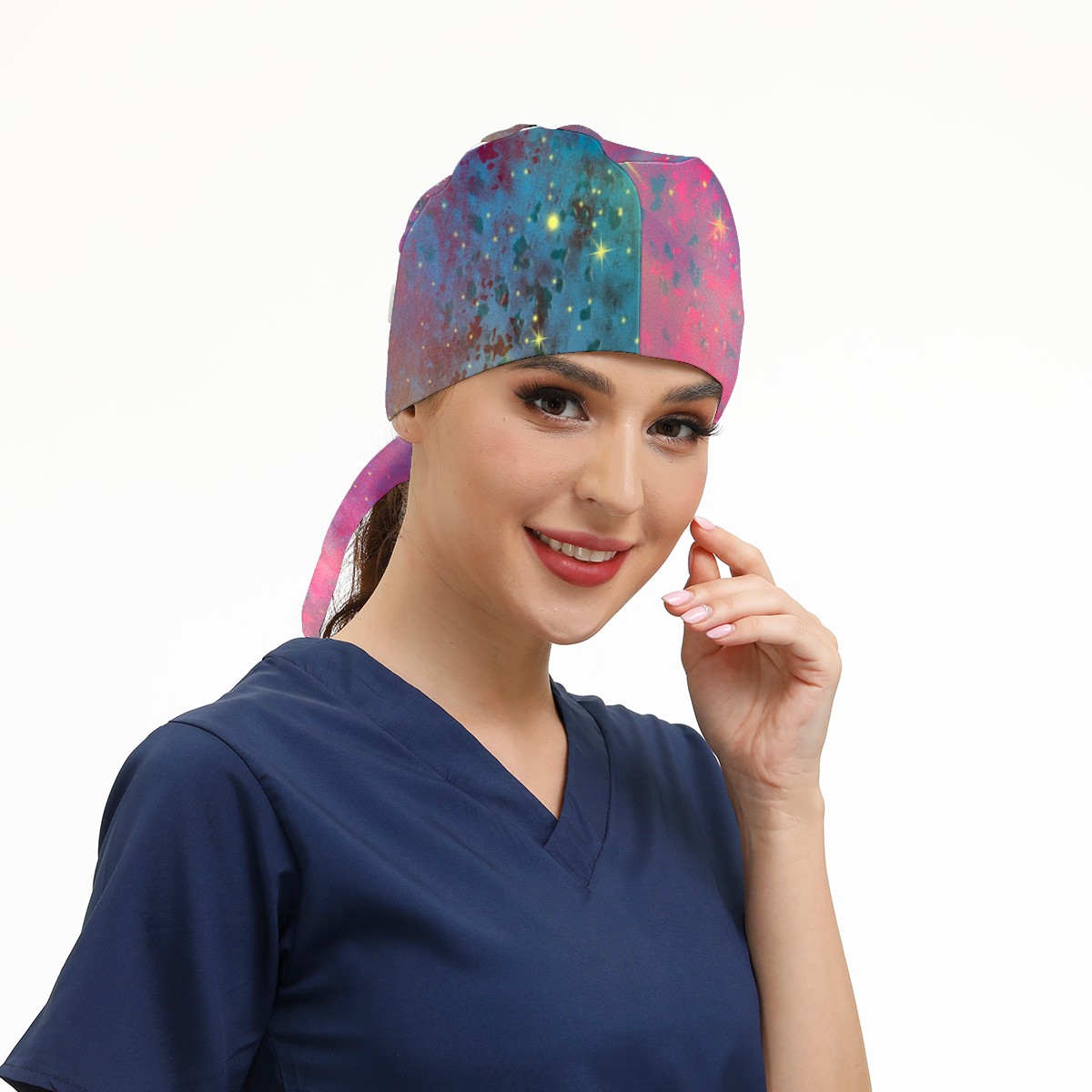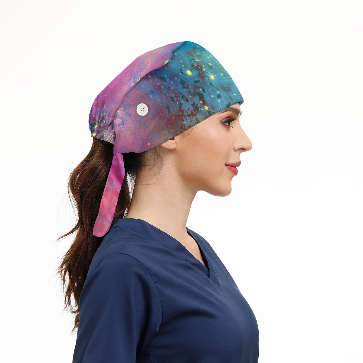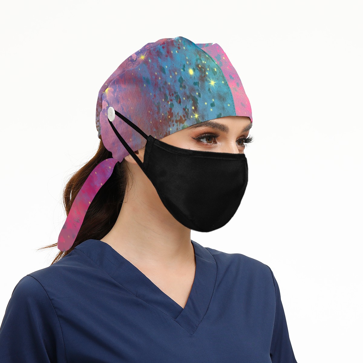 Working Caps with Button & Sweatband Satin Lined Cotton Adjustable Nurse Hats Elastic Band Scrub Cap Surgeon Hat Pink Galaxy Sky Stars