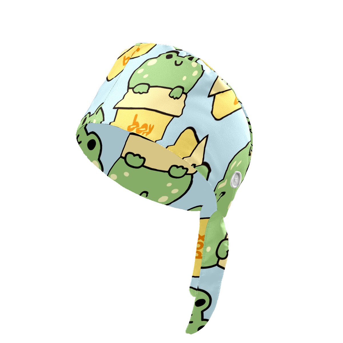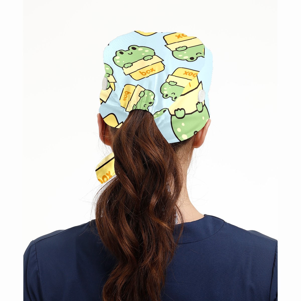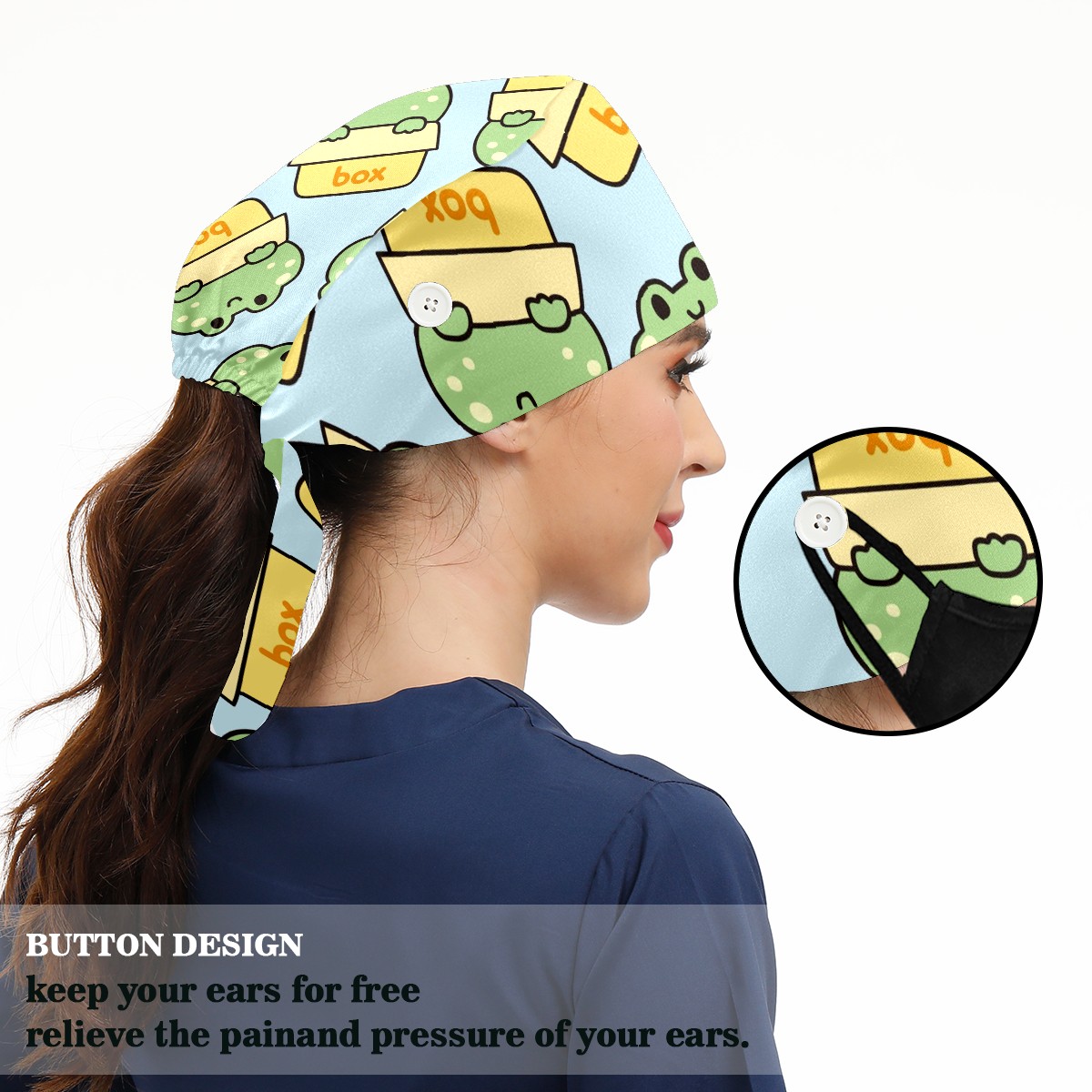 Working Caps with Button & Sweatband Satin Lined Cotton Adjustable Nurse Hats Elastic Band Scrub Cap Surgeon Hat Cute Frog Stay In Box On Blue Background