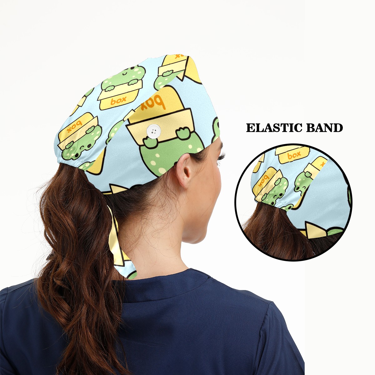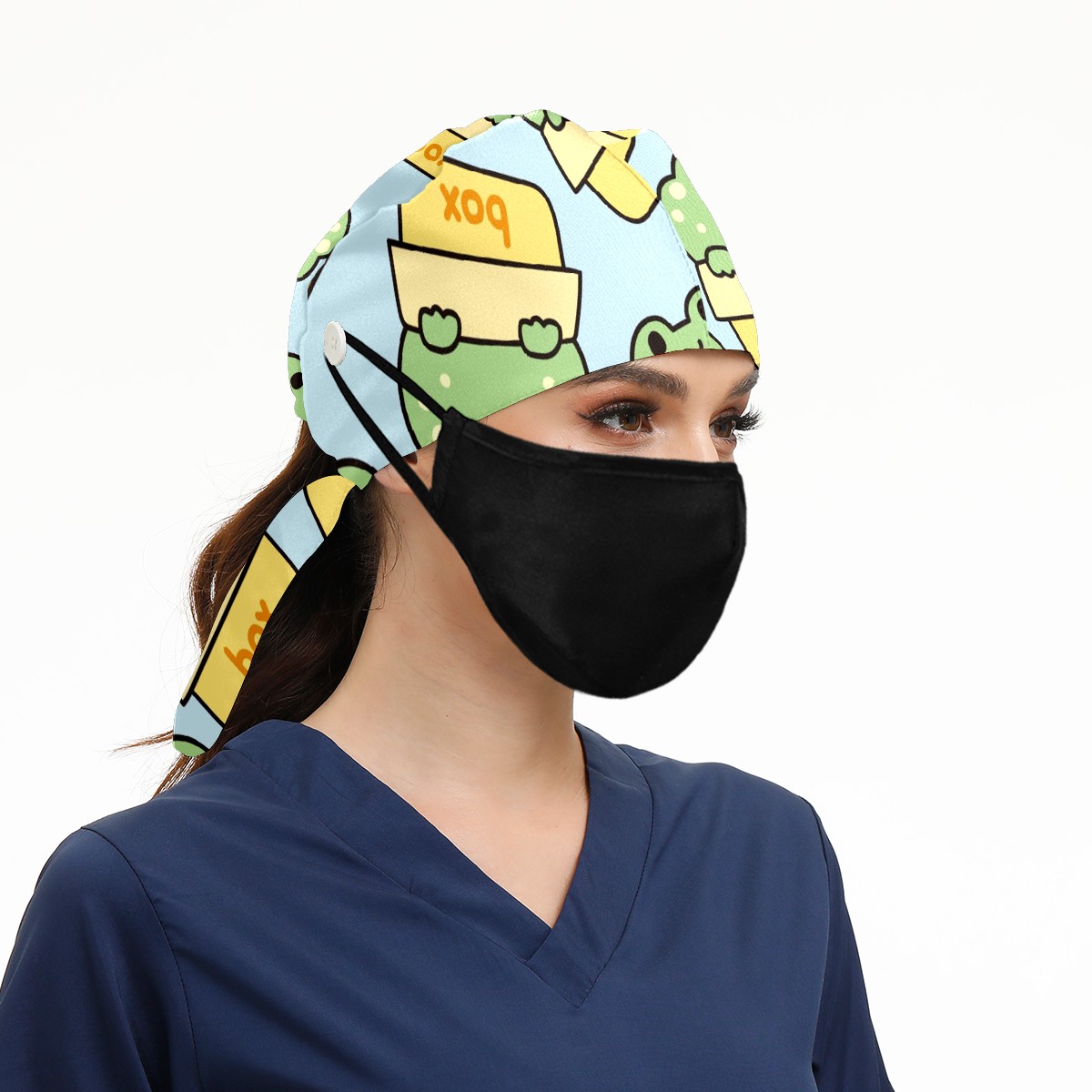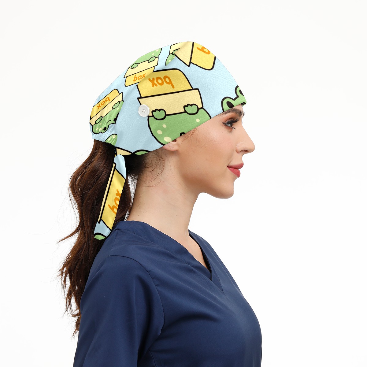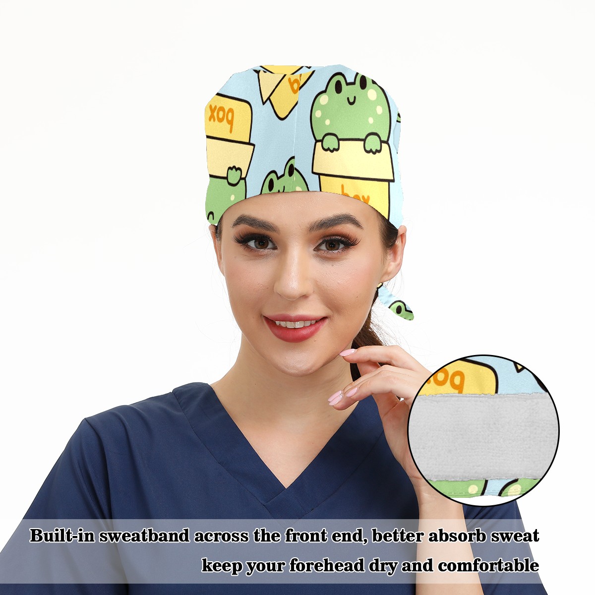 Working Caps with Button & Sweatband Satin Lined Cotton Adjustable Nurse Hats Elastic Band Scrub Cap Surgeon Hat Cute Frog Stay In Box On Blue Background