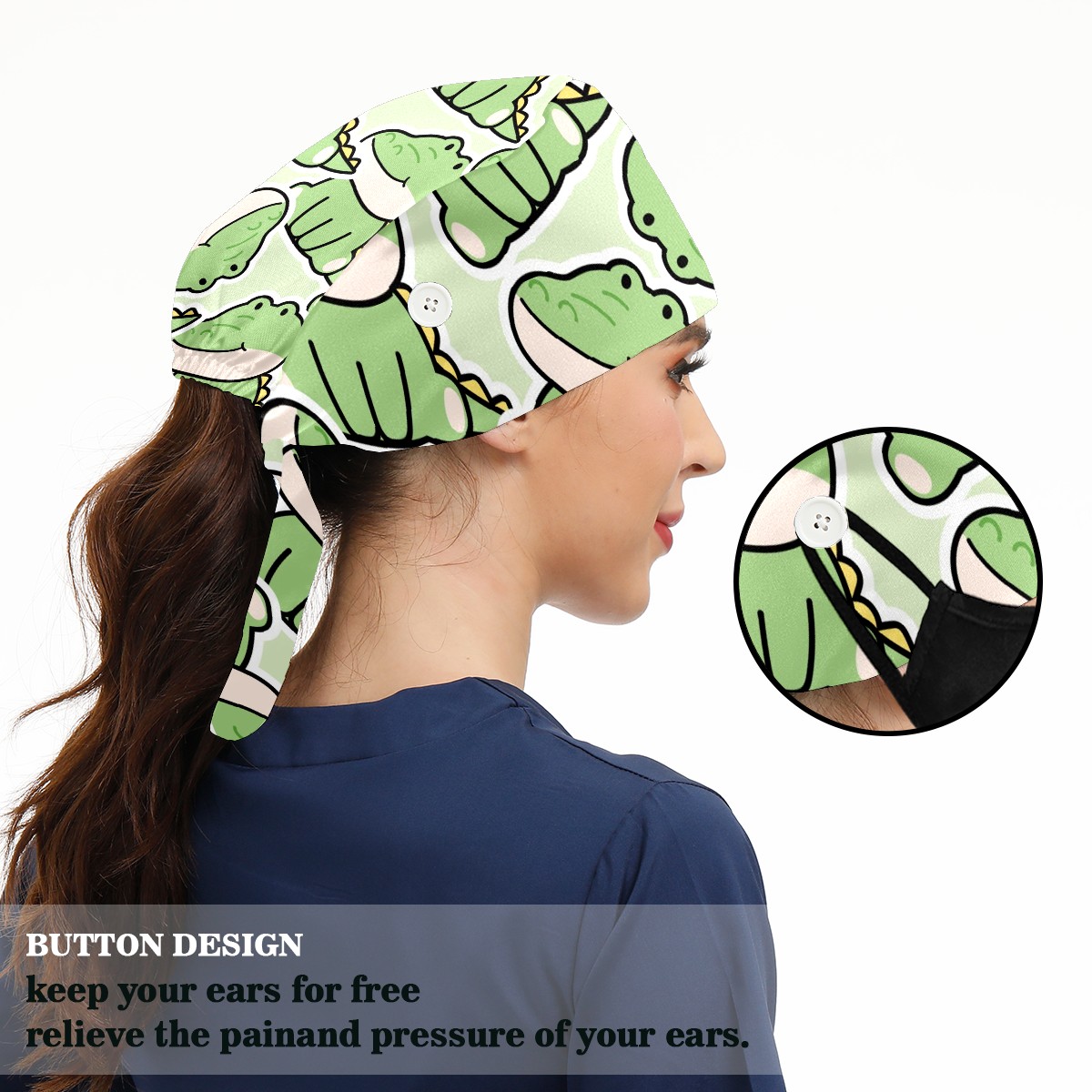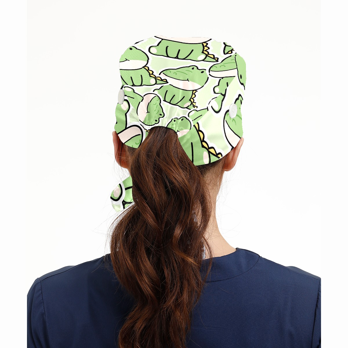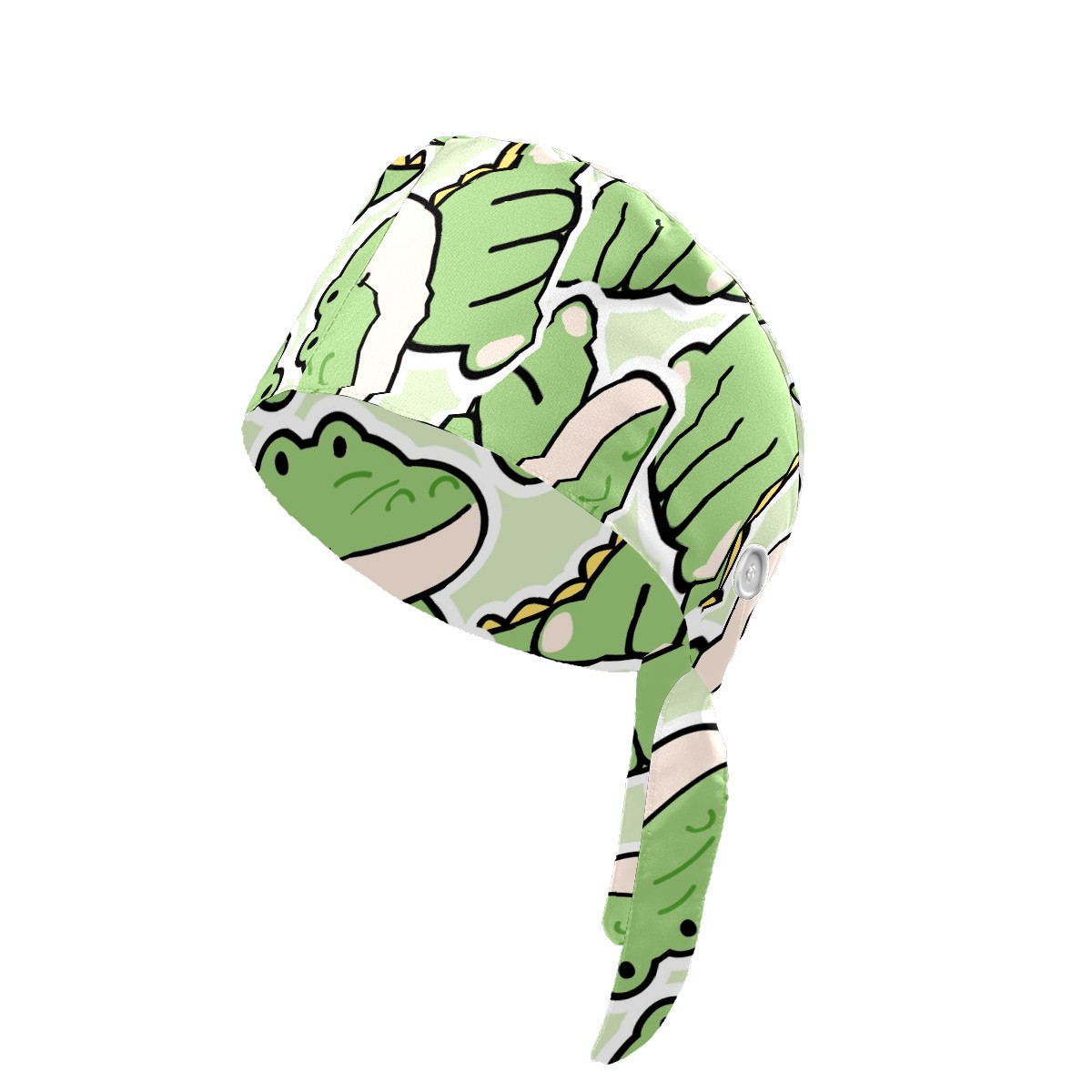Working Caps with Button & Sweatband Satin Lined Cotton Adjustable Nurse Hats Elastic Band Scrub Cap Surgeon Hat Cute Crocodile Sit On Green Background