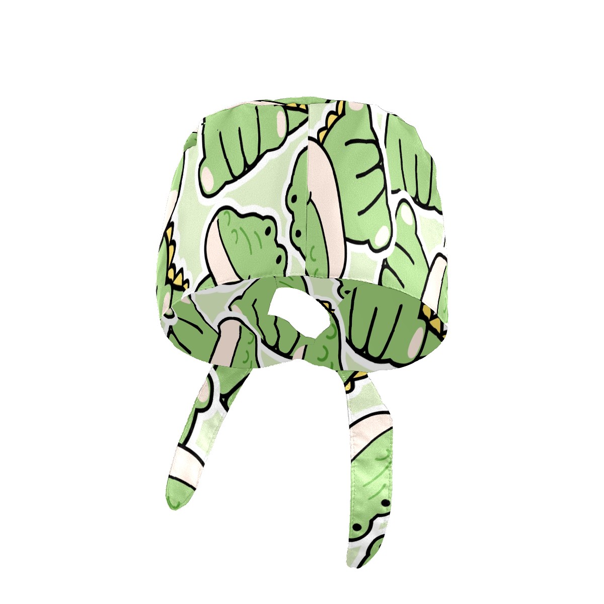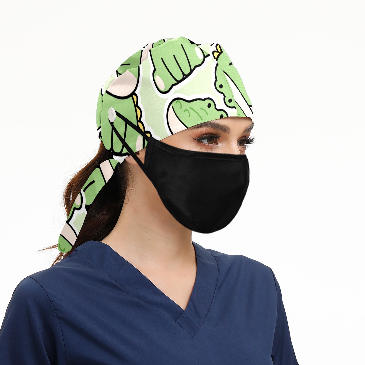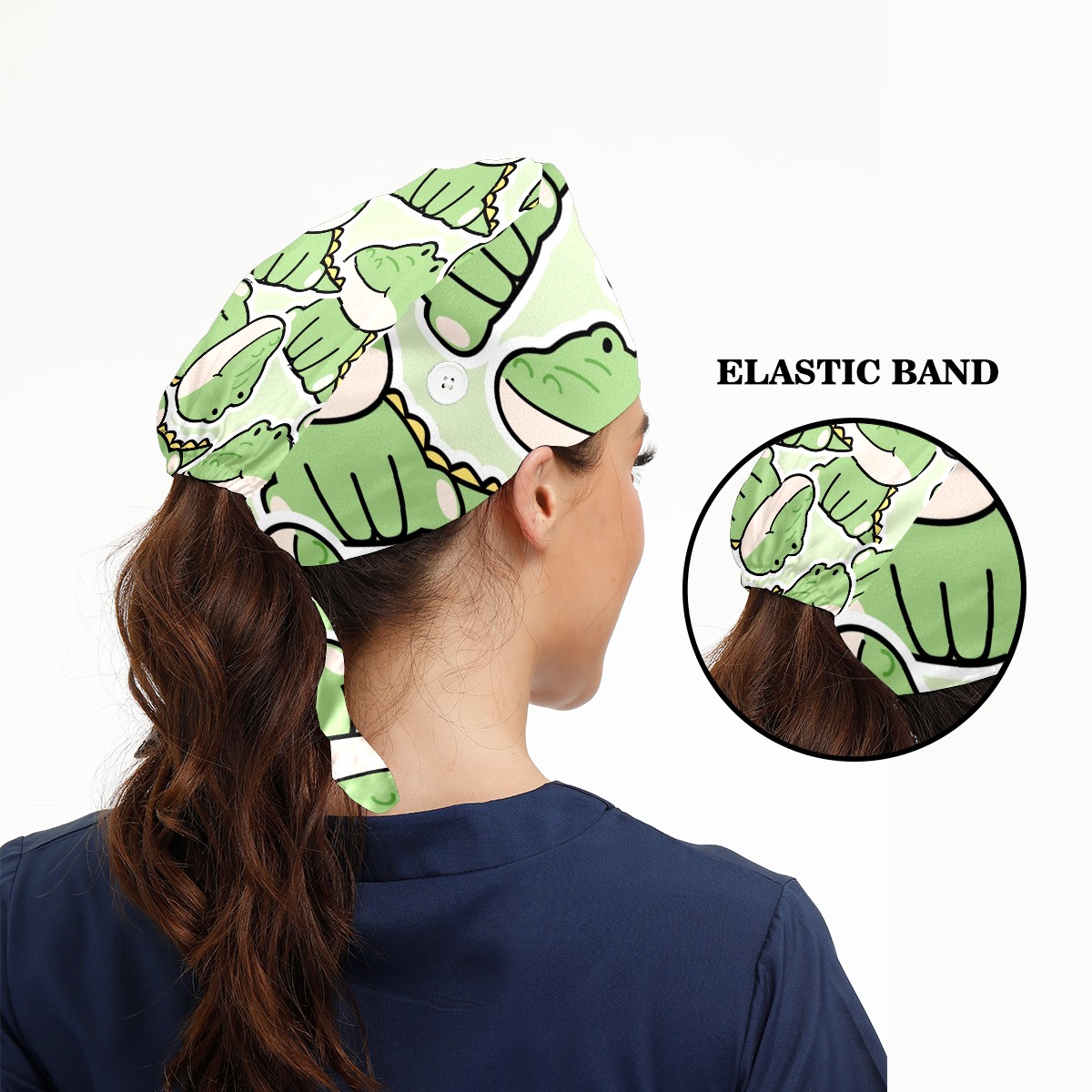 Working Caps with Button & Sweatband Satin Lined Cotton Adjustable Nurse Hats Elastic Band Scrub Cap Surgeon Hat Cute Crocodile Sit On Green Background