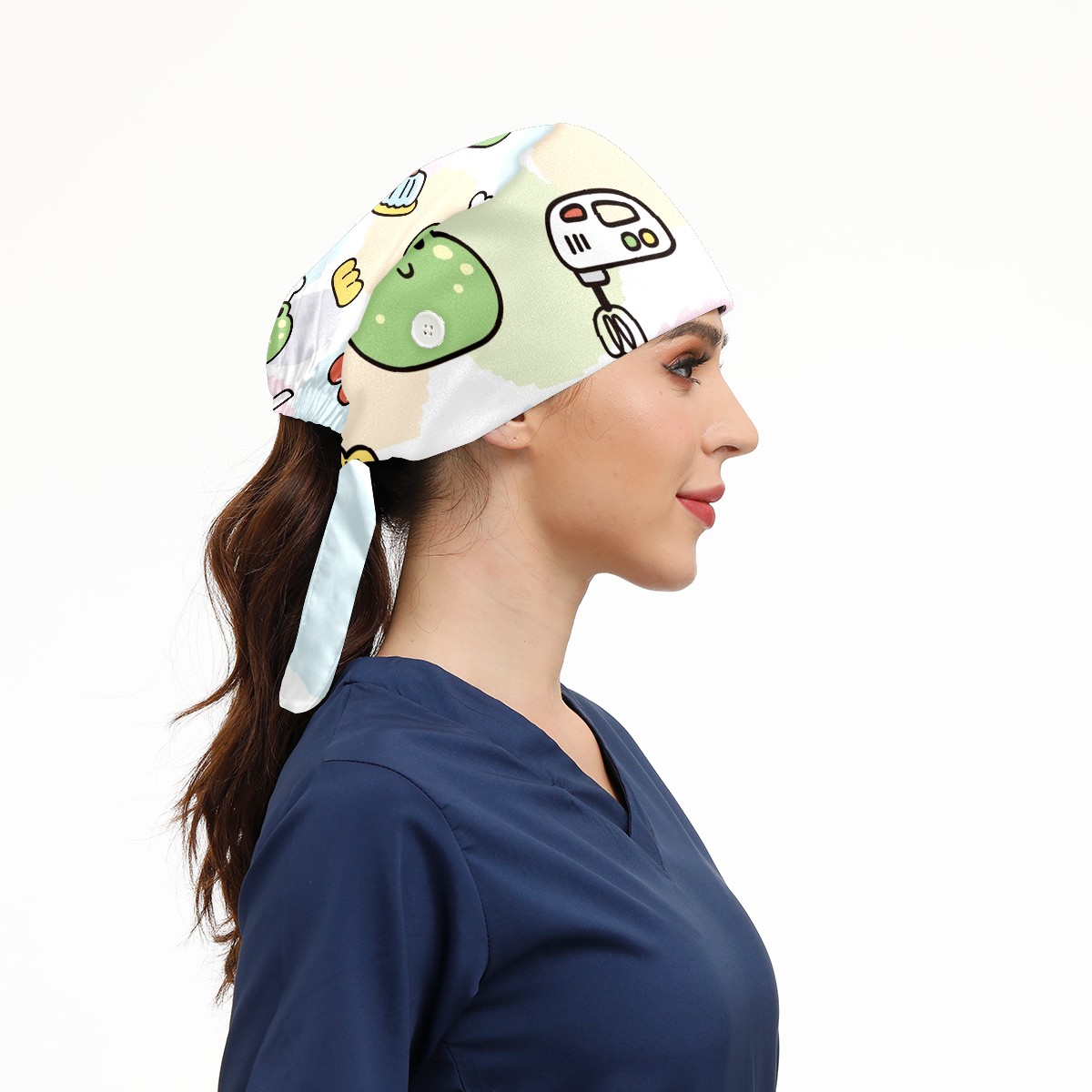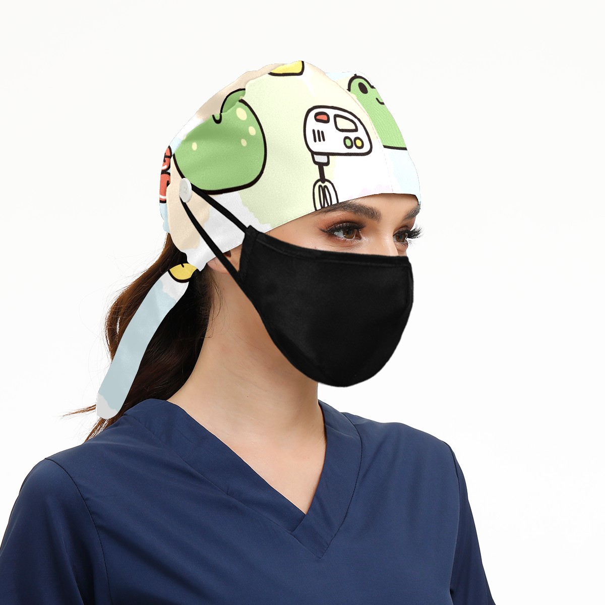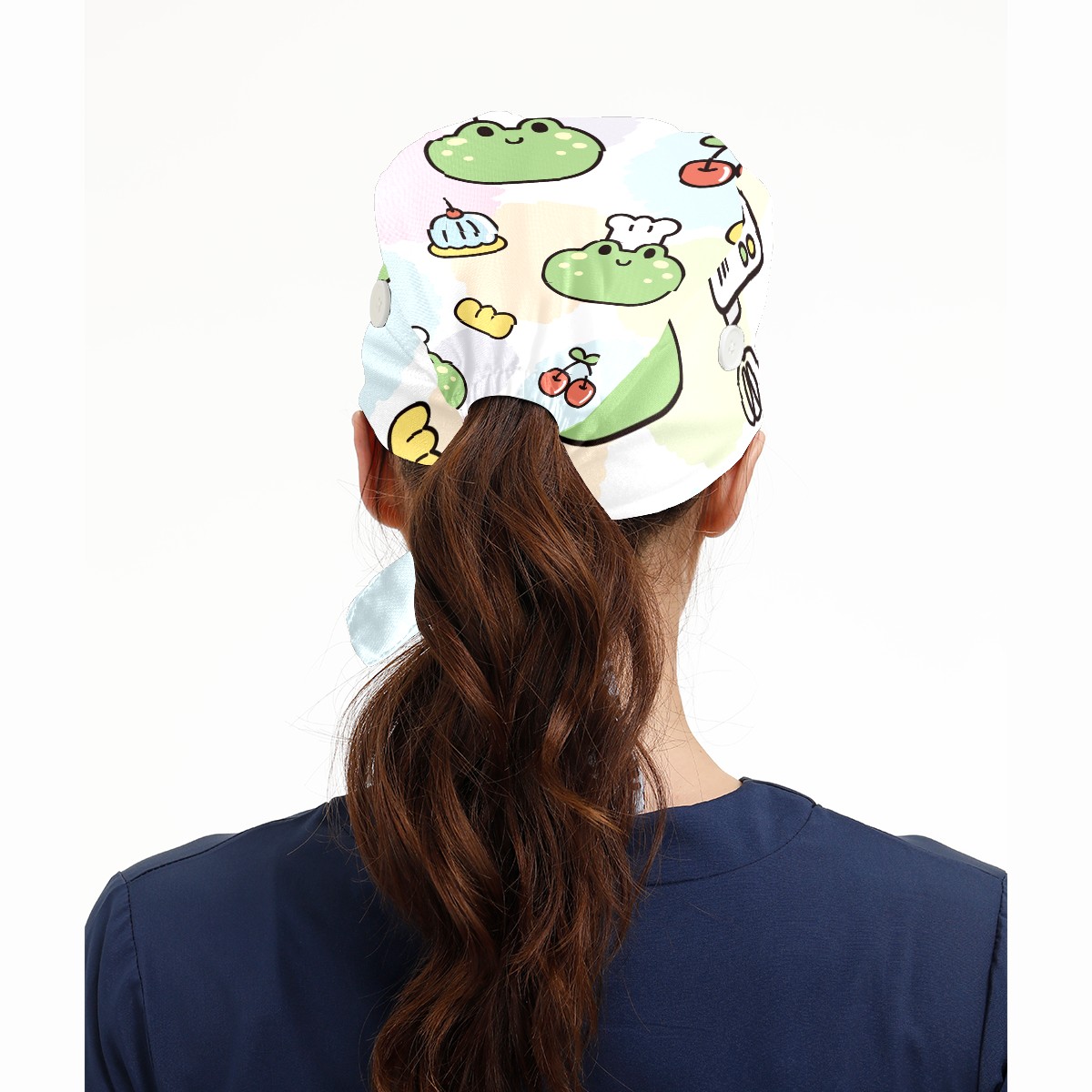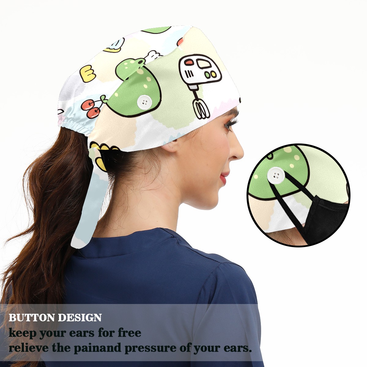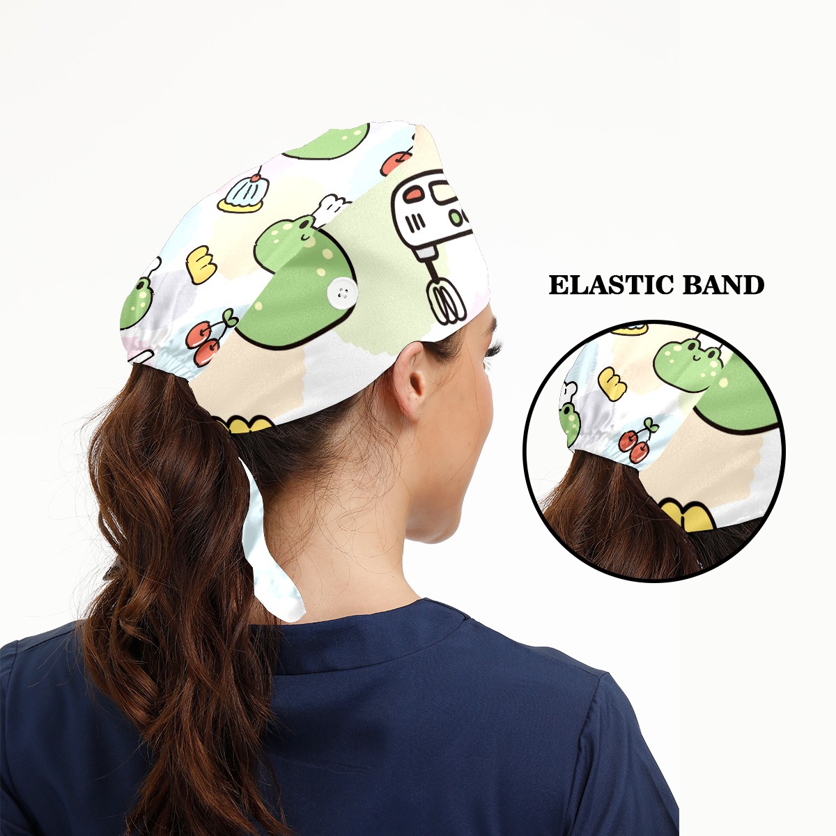 Working Caps with Button & Sweatband Satin Lined Cotton Adjustable Nurse Hats Elastic Band Scrub Cap Surgeon Hat Cute Face Frog Cake Cherry