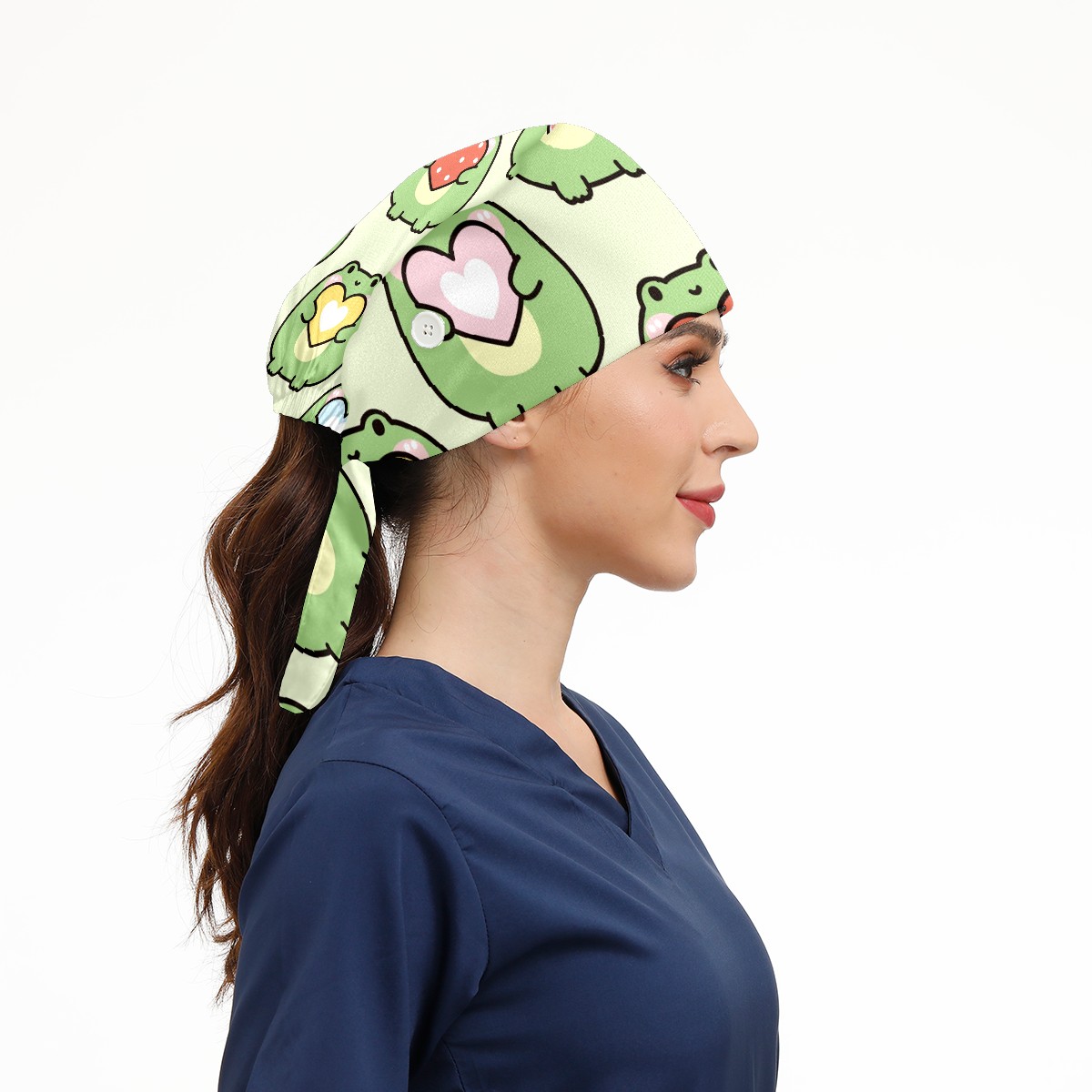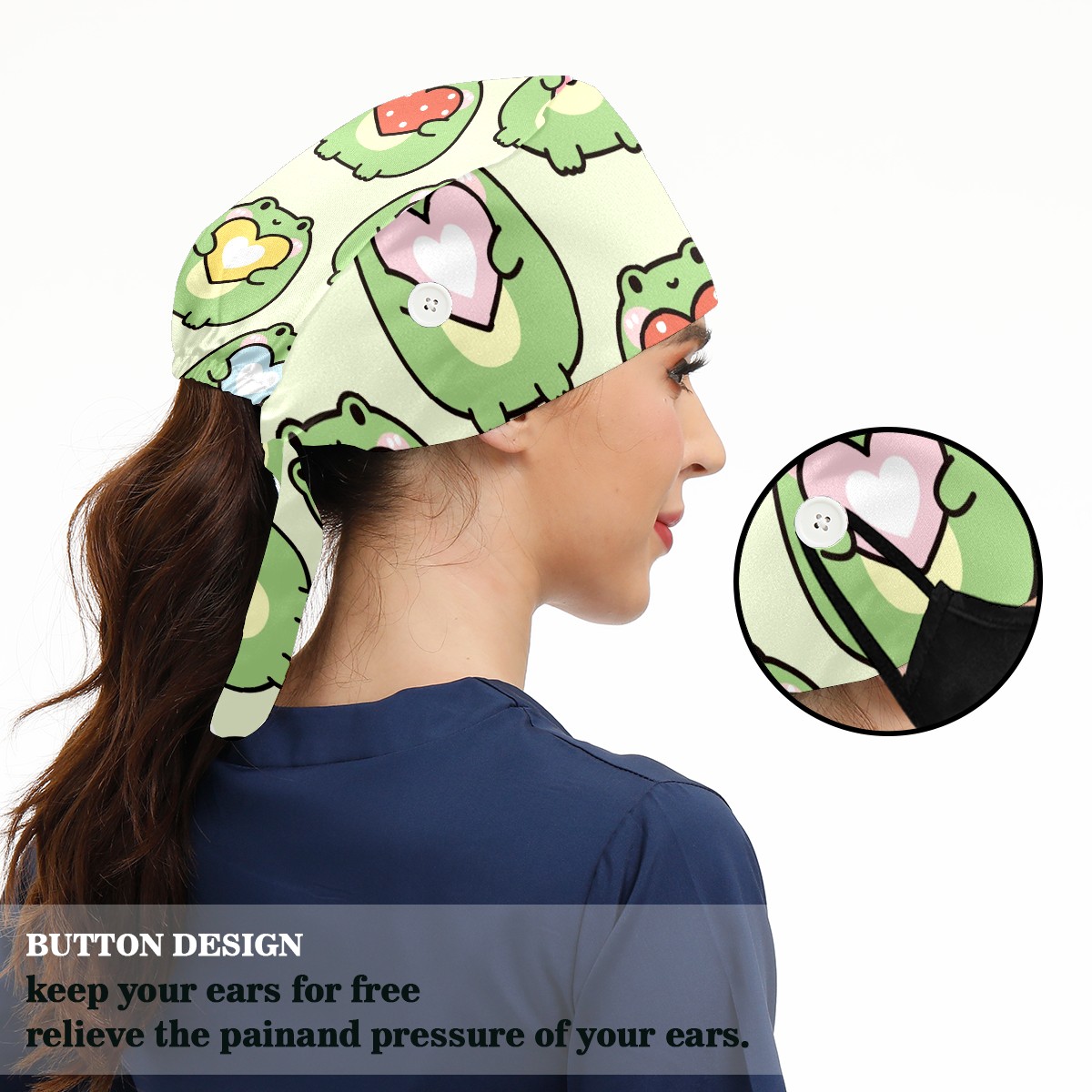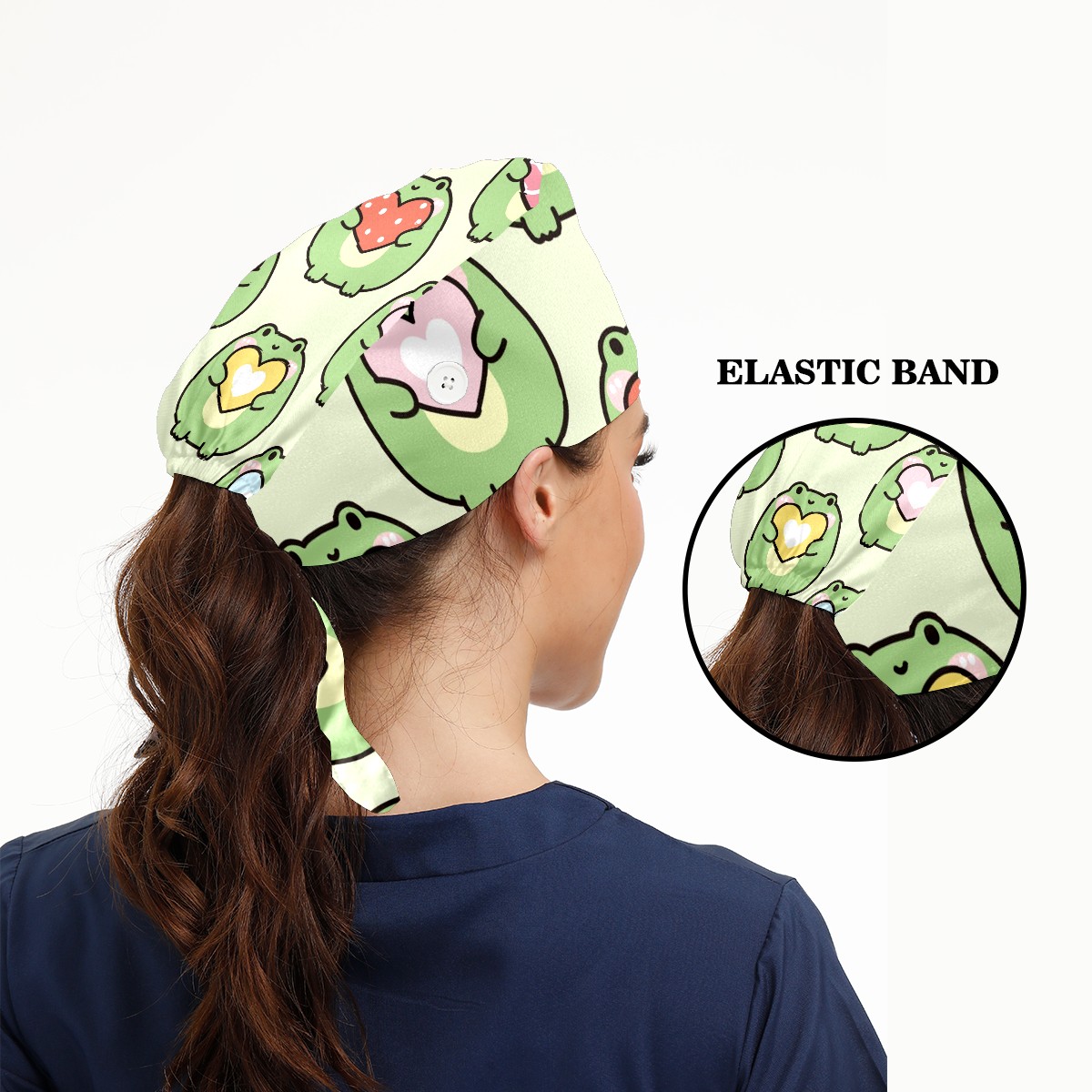 Working Caps with Button & Sweatband Satin Lined Cotton Adjustable Nurse Hats Elastic Band Scrub Cap Surgeon Hat Cute Chubby Frog Hold Heart On Green Background