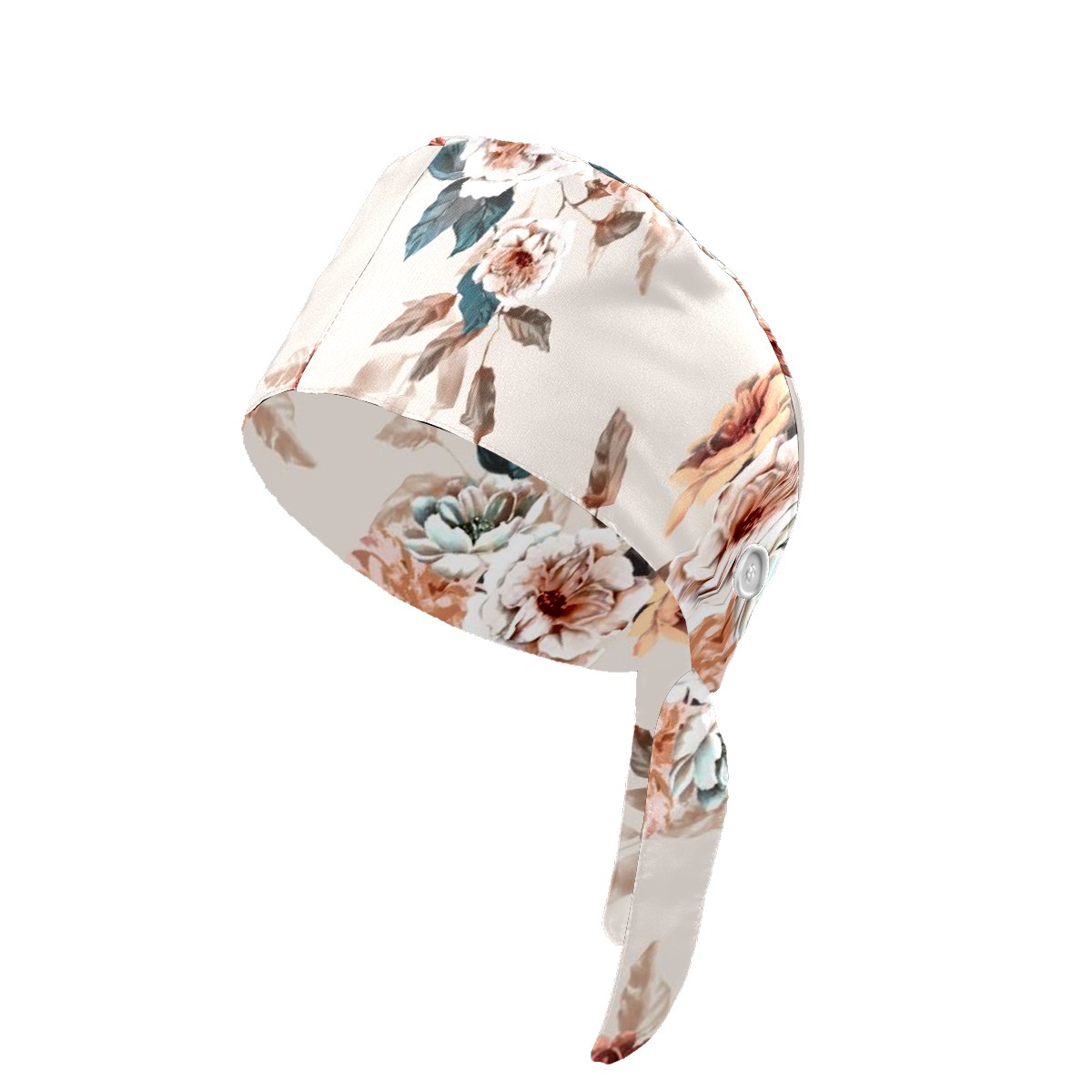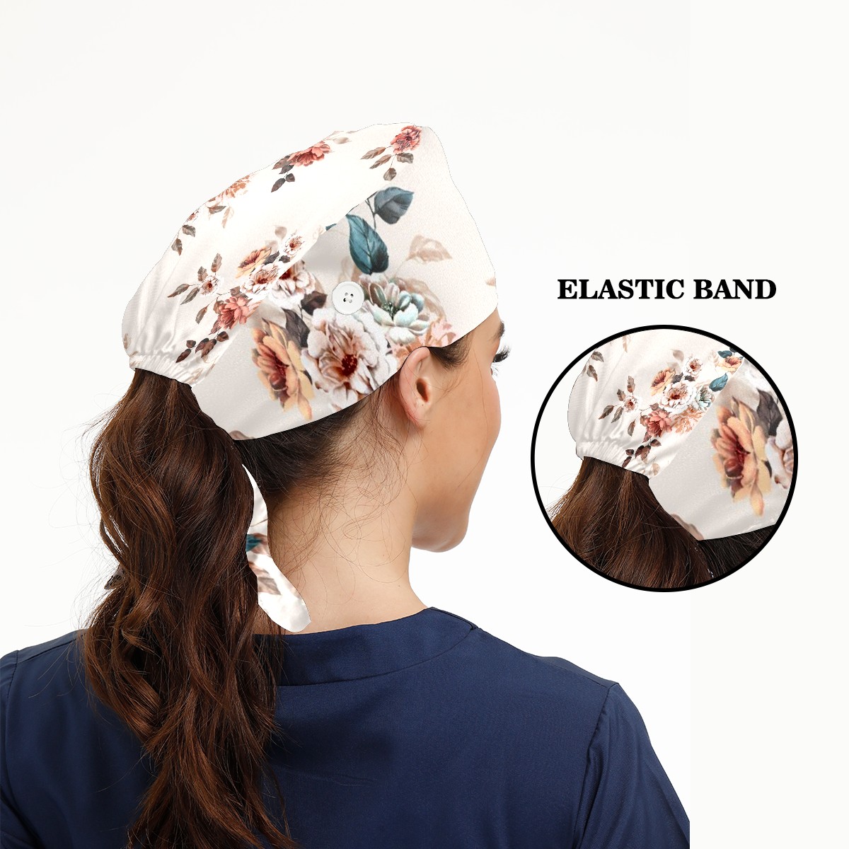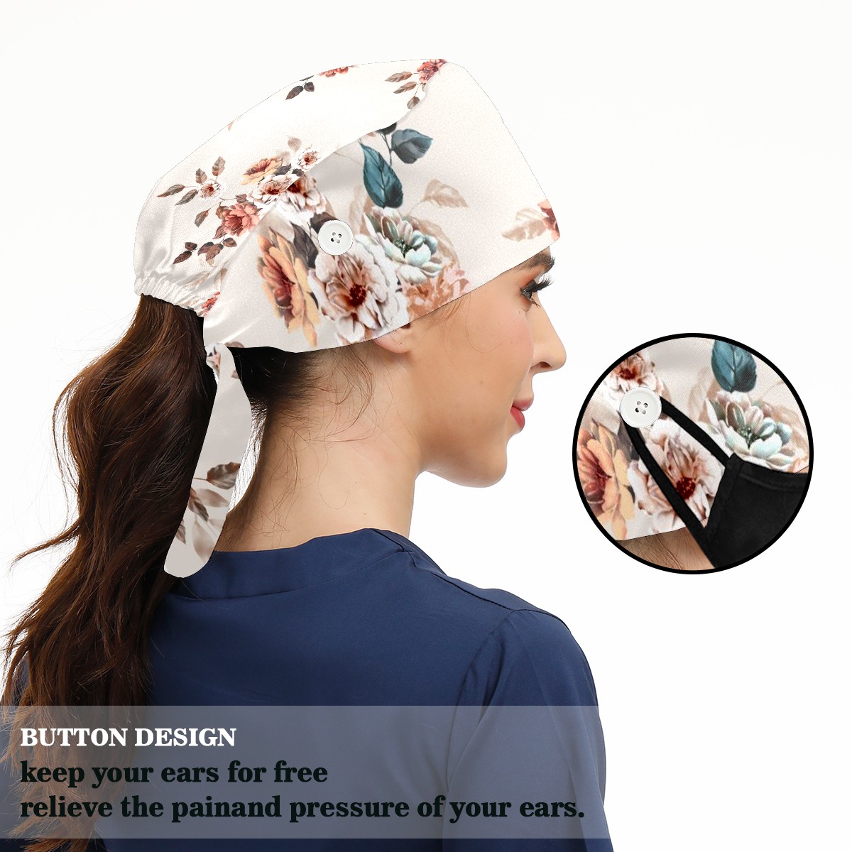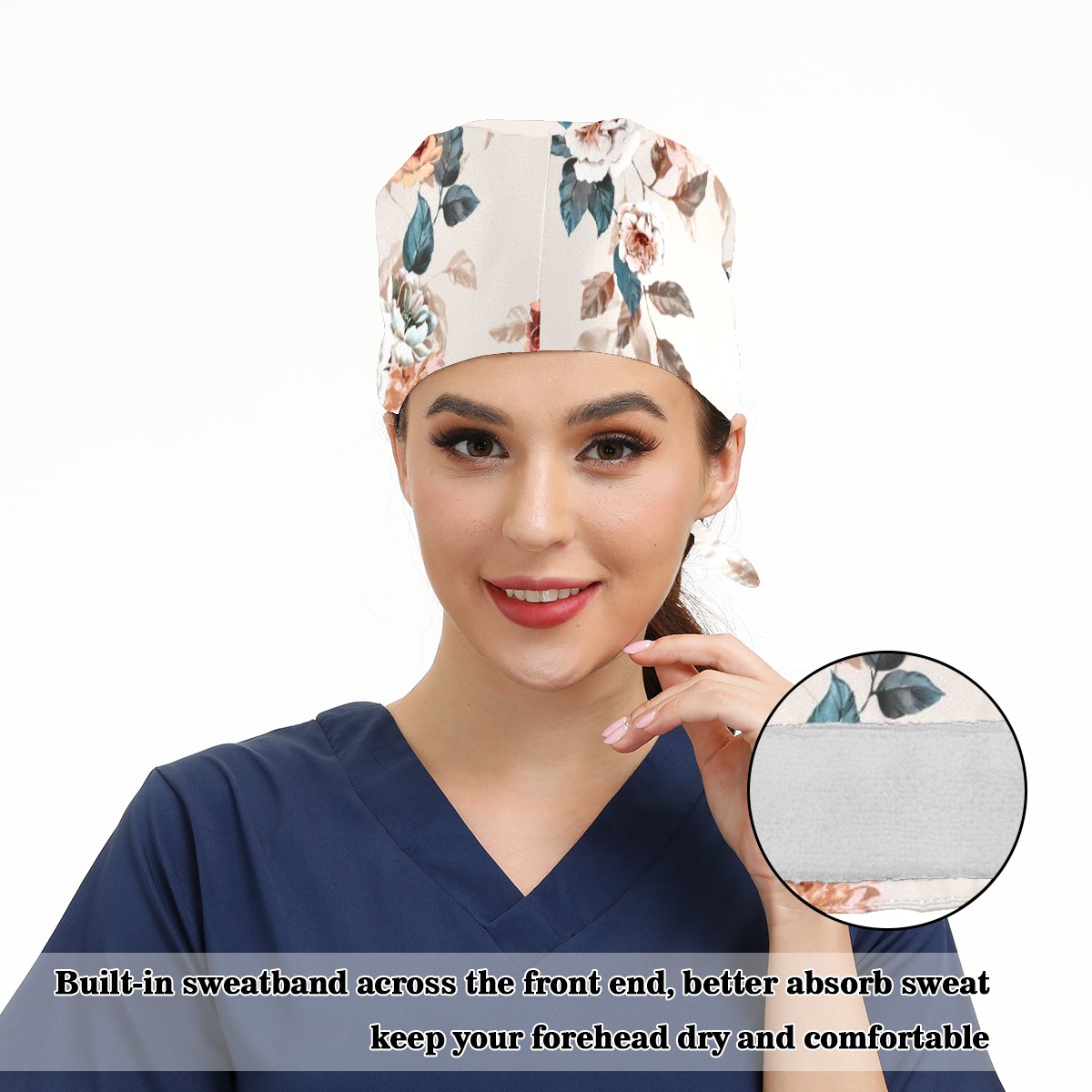 Working Caps with Button & Sweatband Satin Lined Cotton Adjustable Nurse Hats Elastic Band Scrub Cap Surgeon Hat Watercolor Flower Pattern