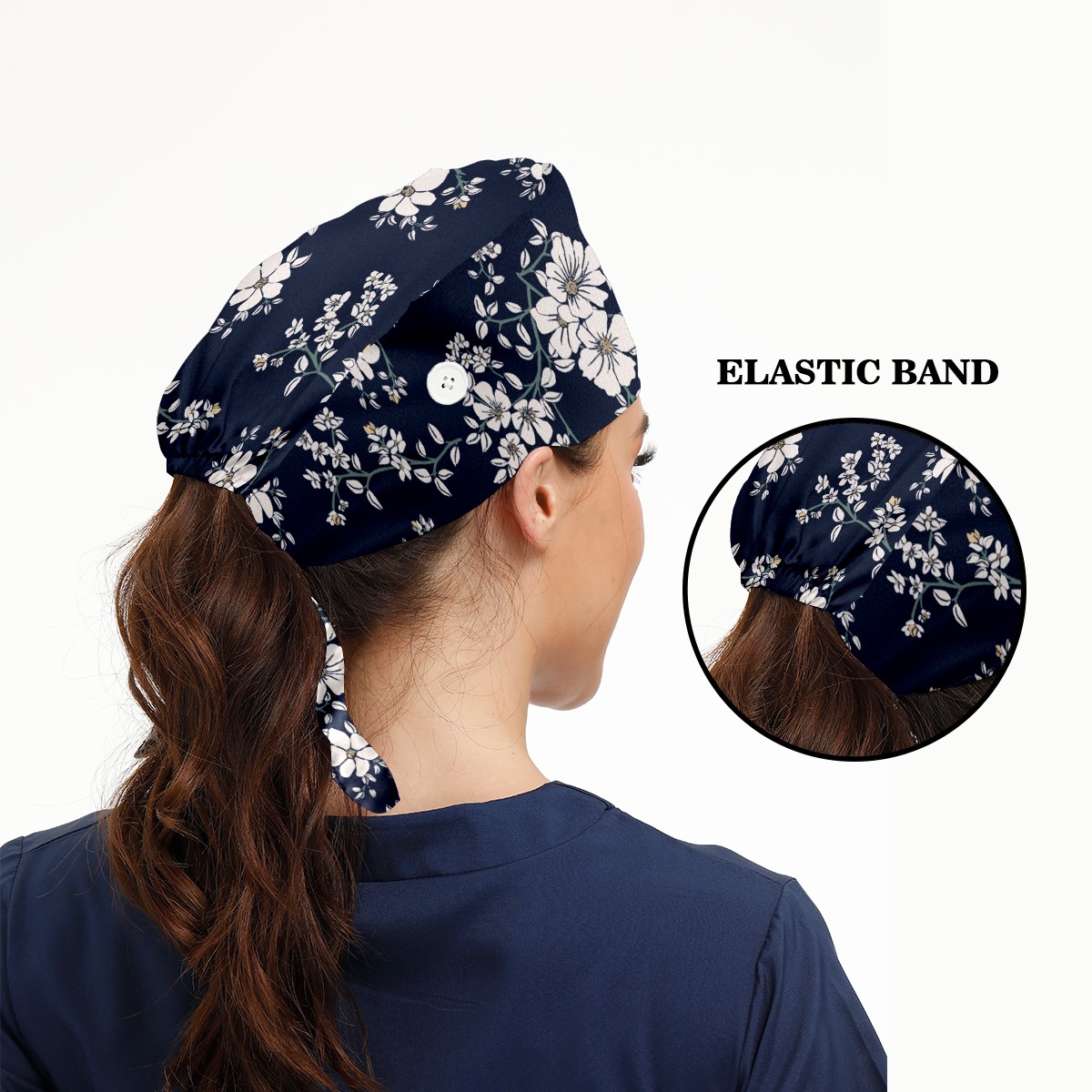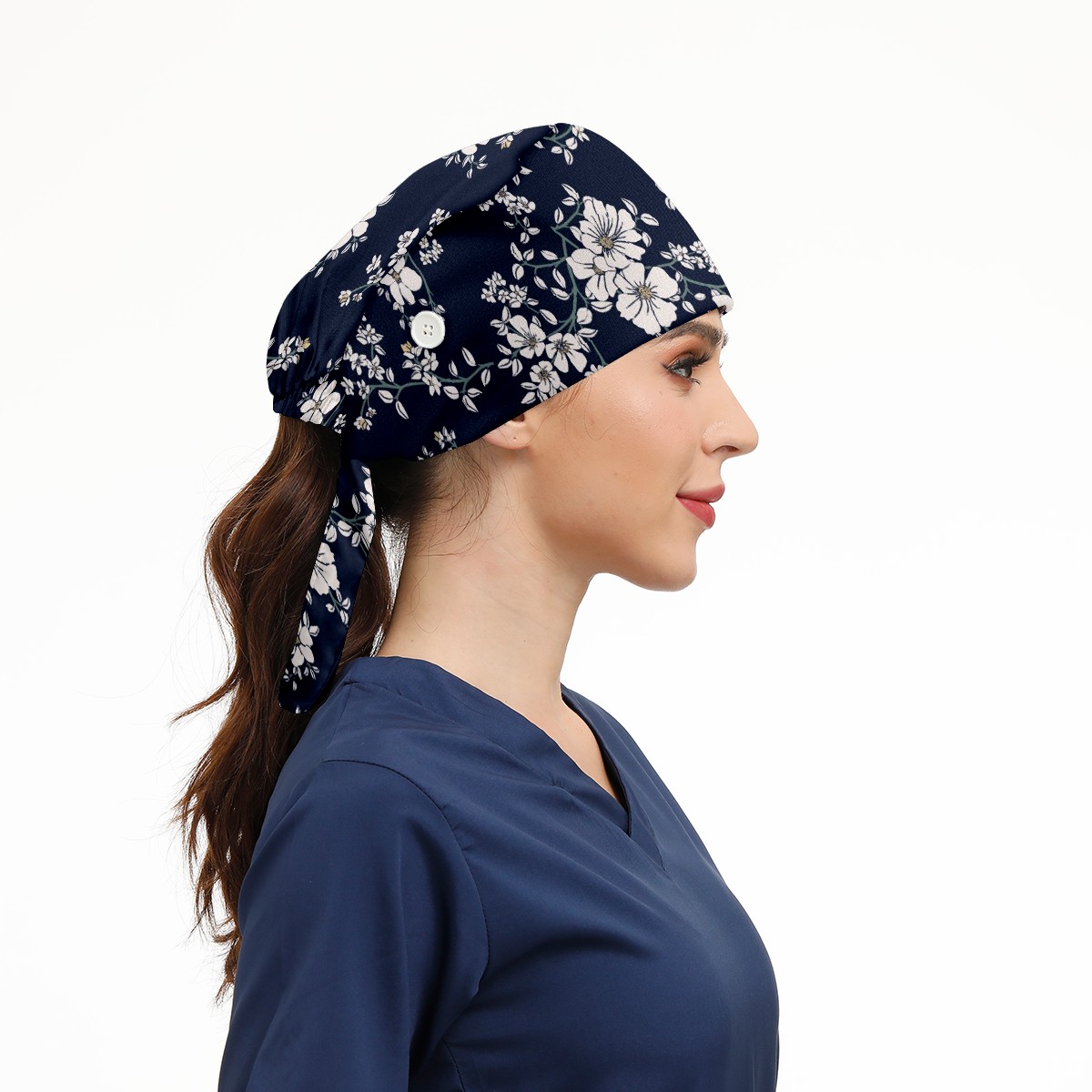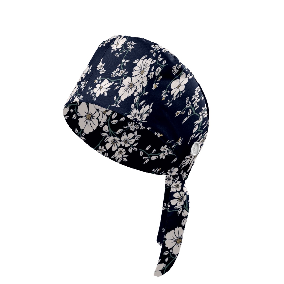 Working Caps with Button & Sweatband Satin Lined Cotton Adjustable Nurse Hats Elastic Band Scrub Cap Surgeon Hat Vintage Flowers On Blue Background