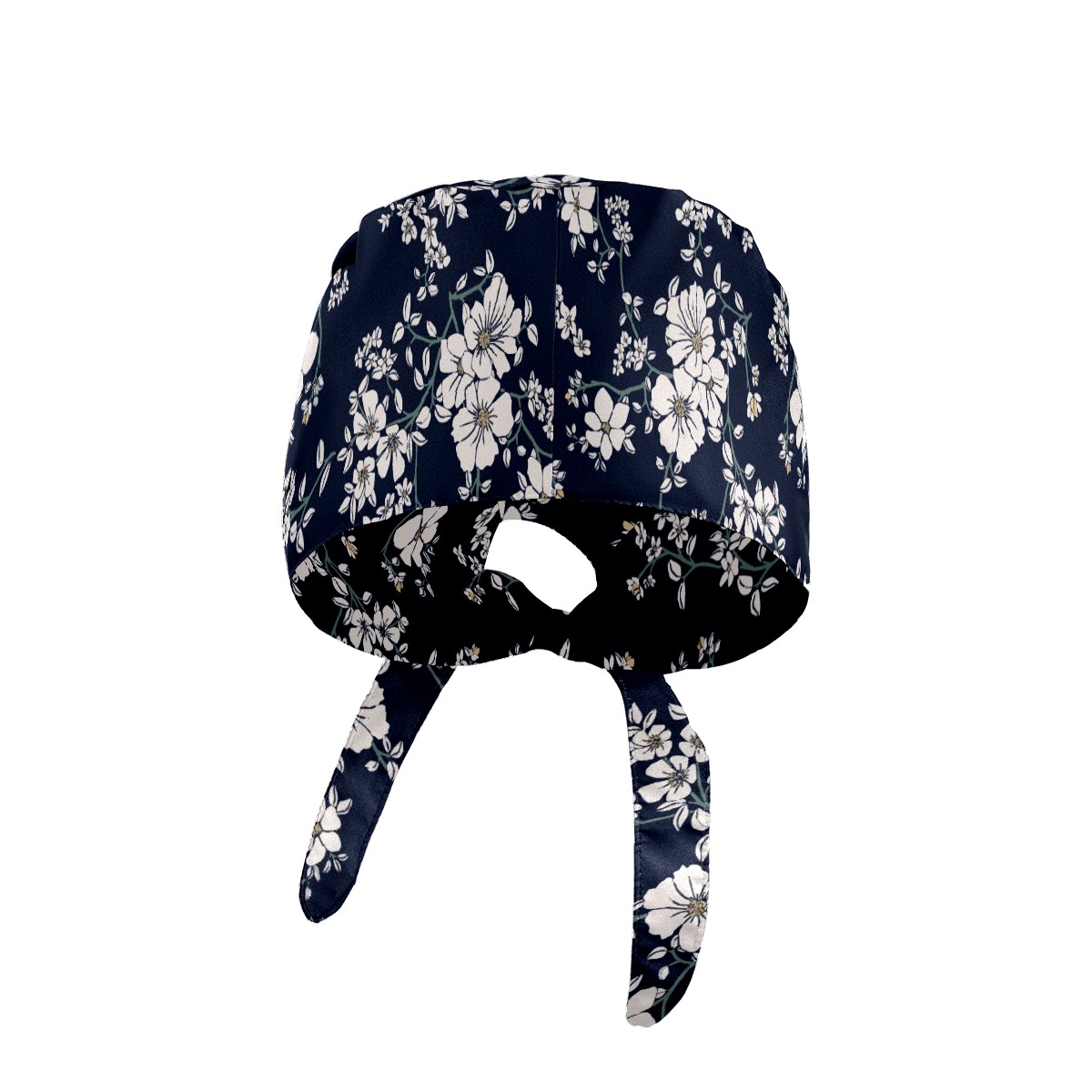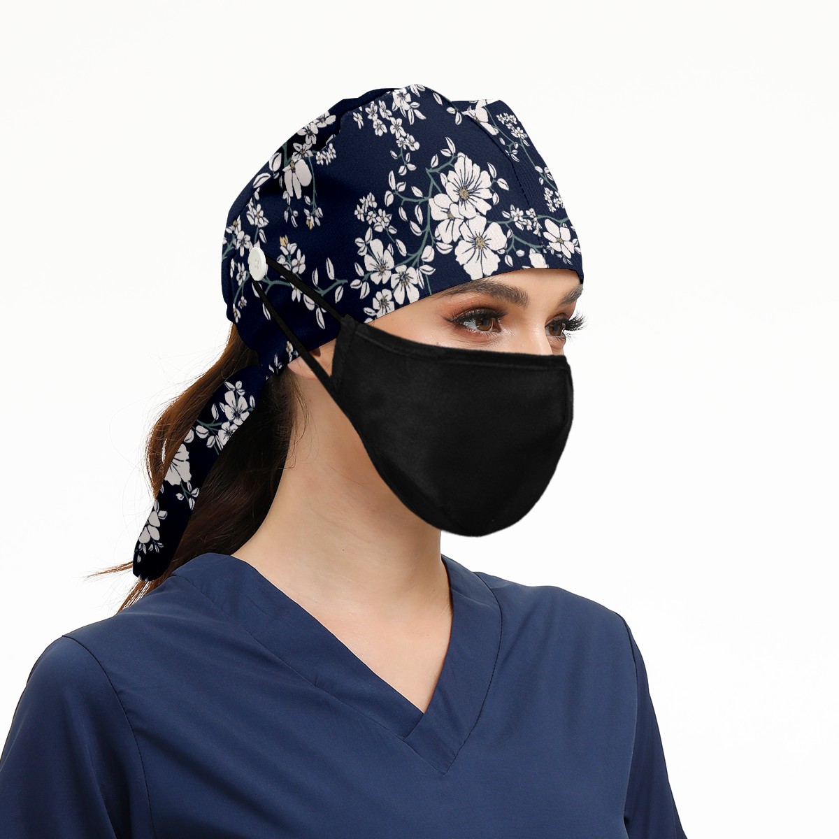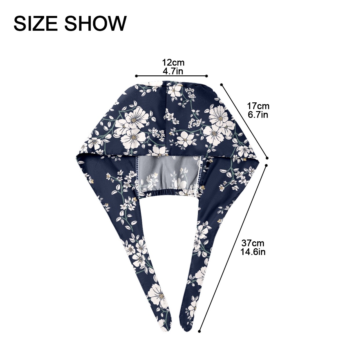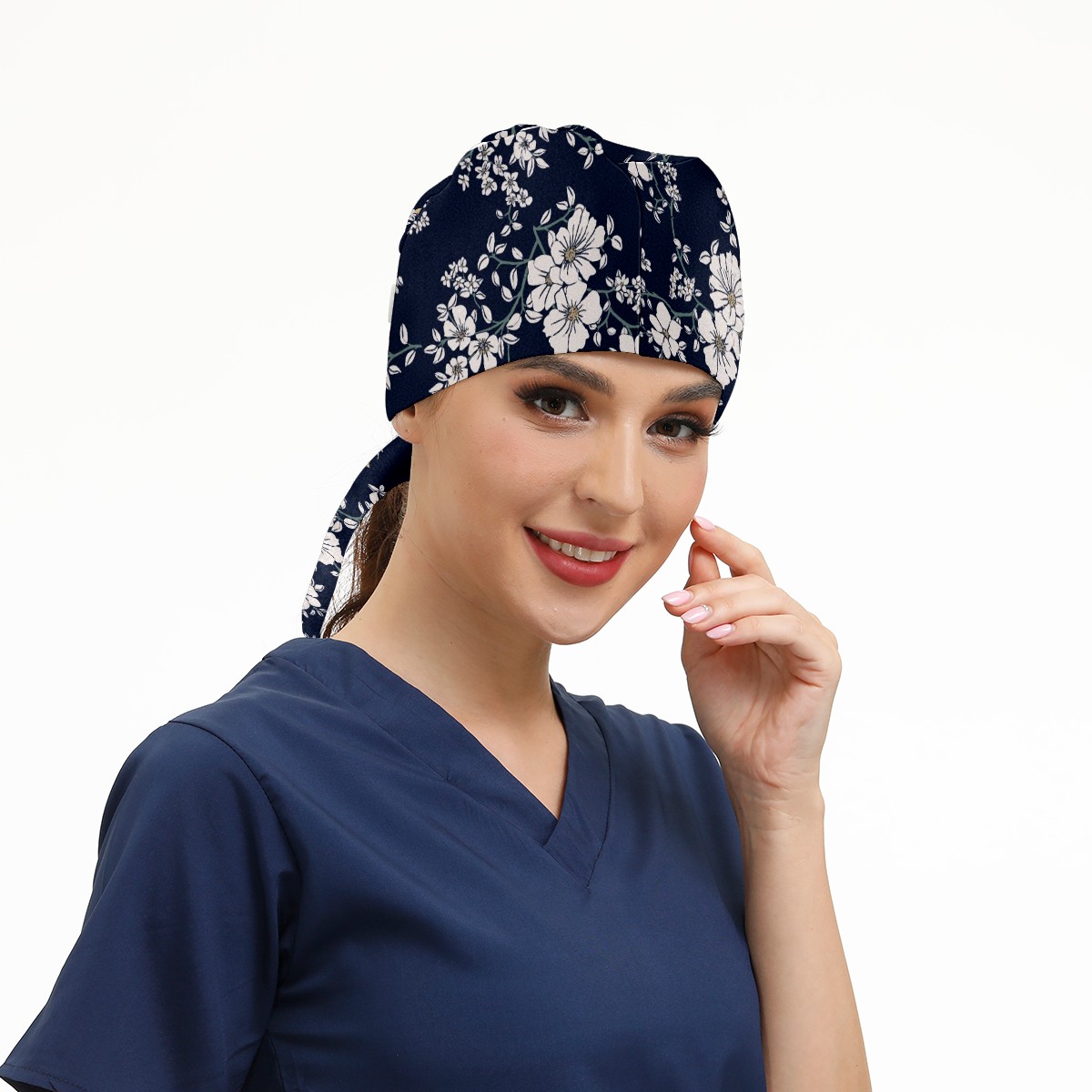 Working Caps with Button & Sweatband Satin Lined Cotton Adjustable Nurse Hats Elastic Band Scrub Cap Surgeon Hat Vintage Flowers On Blue Background