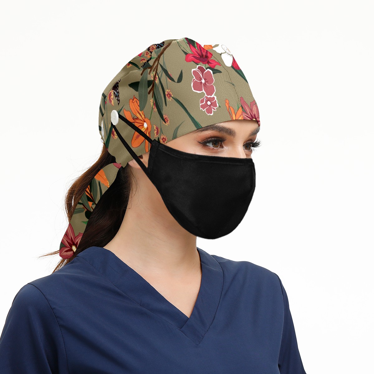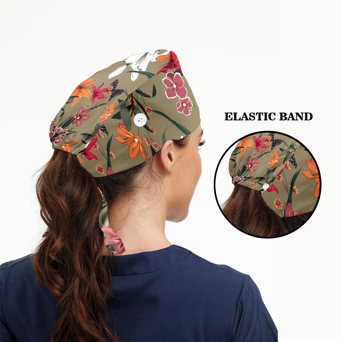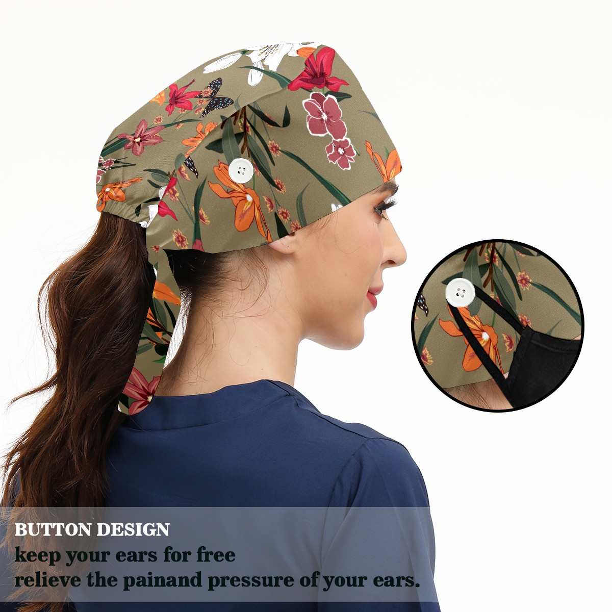 Working Caps with Button & Sweatband Satin Lined Cotton Adjustable Nurse Hats Elastic Band Scrub Cap Surgeon Hat Vintage Floral Butterfly