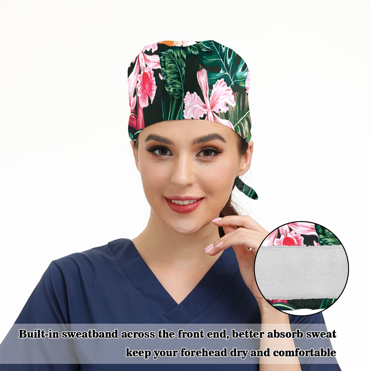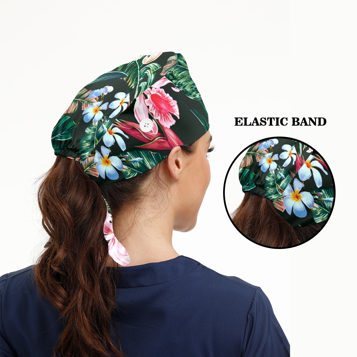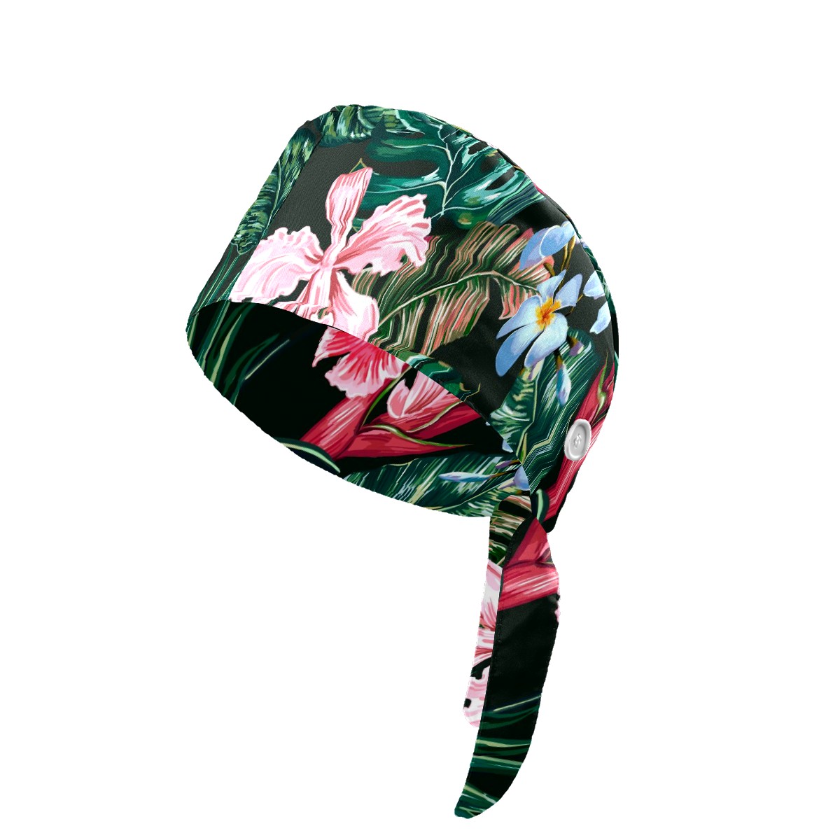 Working Caps with Button & Sweatband Satin Lined Cotton Adjustable Nurse Hats Elastic Band Scrub Cap Surgeon Hat Tropical Exotic Flower Palm Leaf Orchid