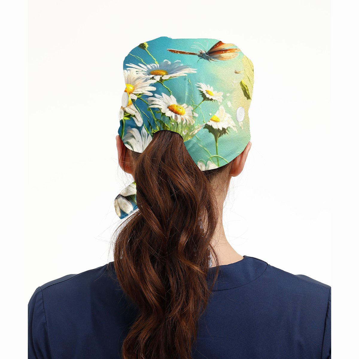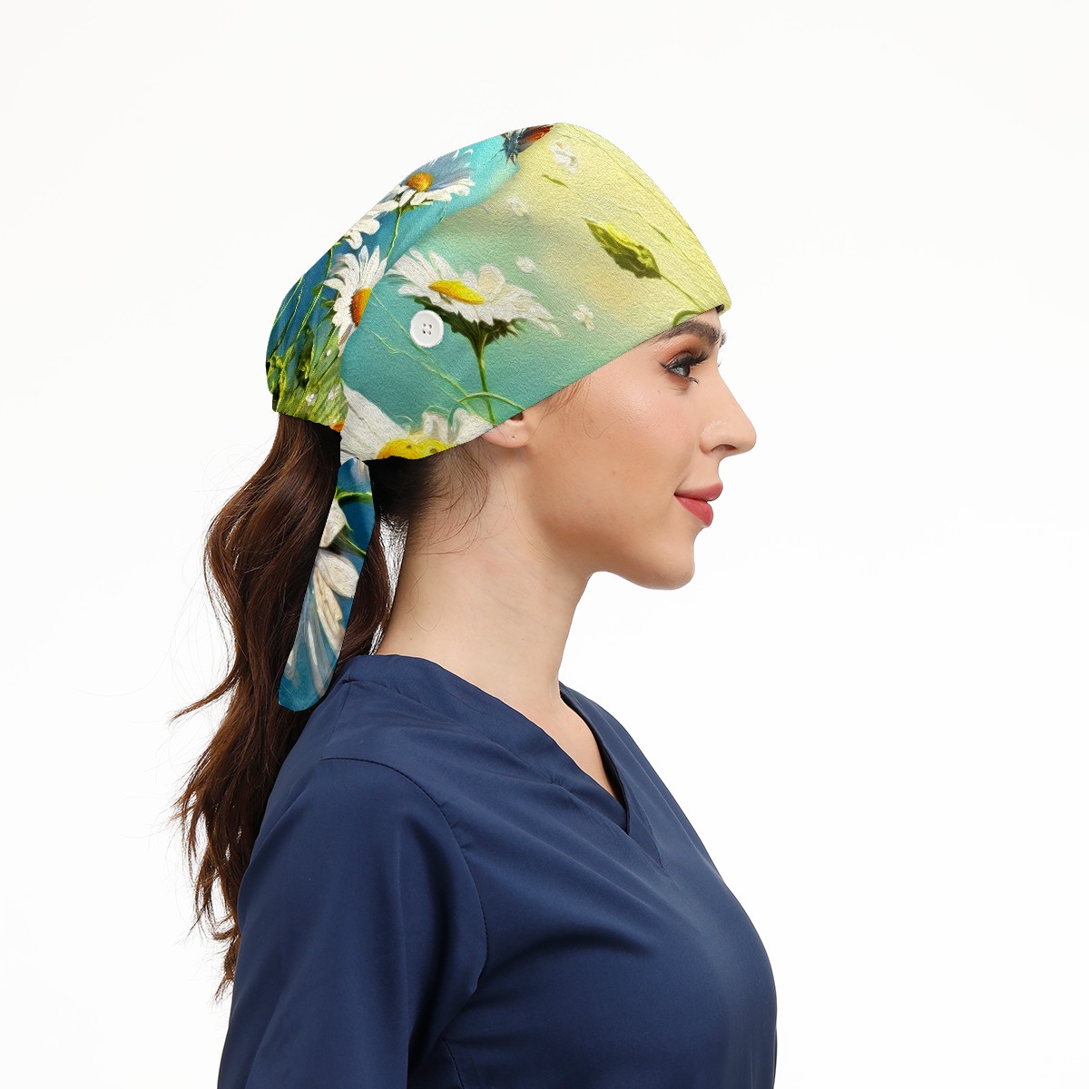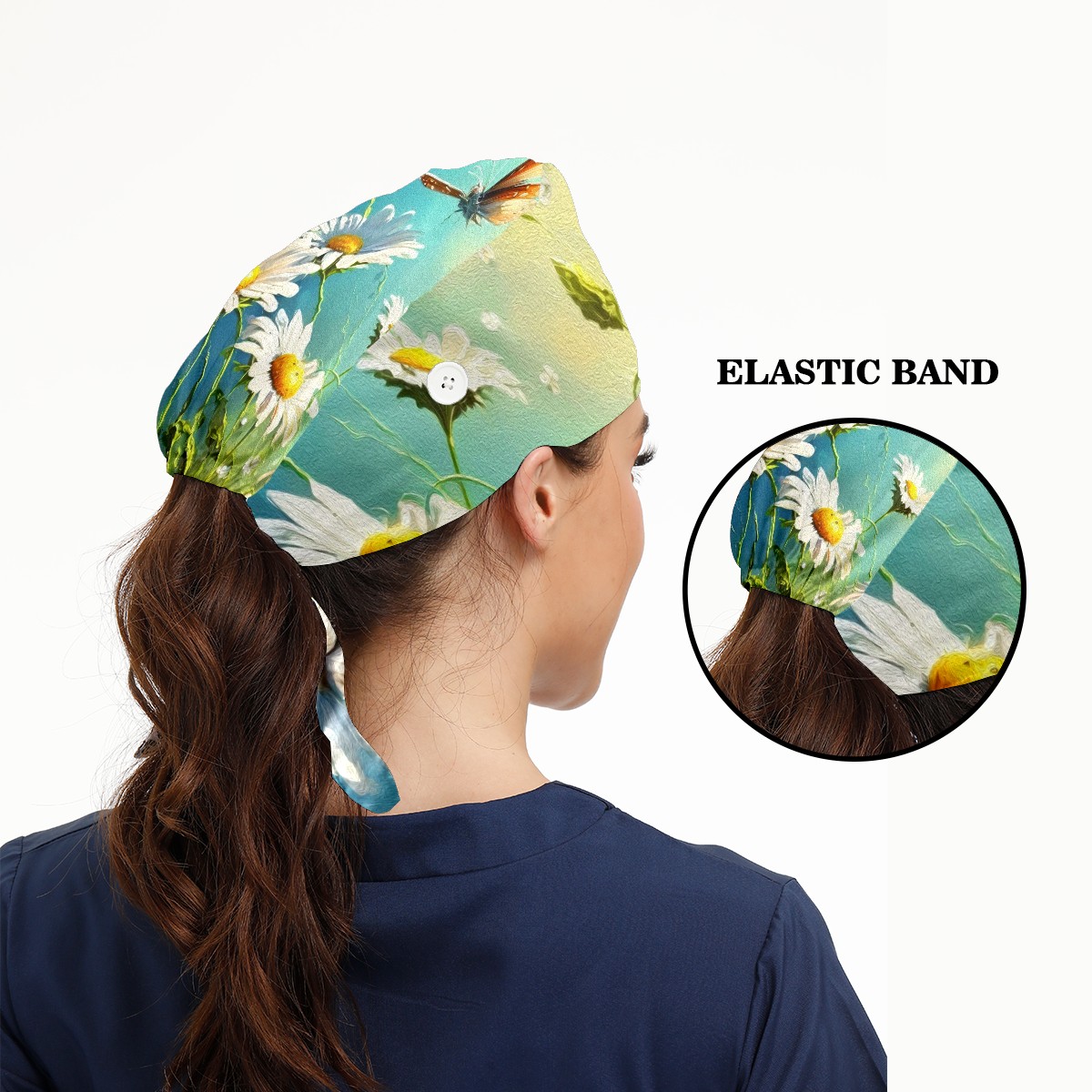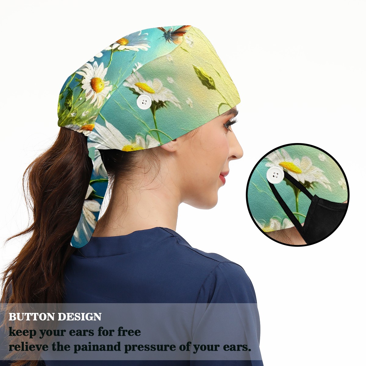 Working Caps with Button & Sweatband Satin Lined Cotton Adjustable Nurse Hats Elastic Band Scrub Cap Surgeon Hat Summer Daisy Butterfly Painting