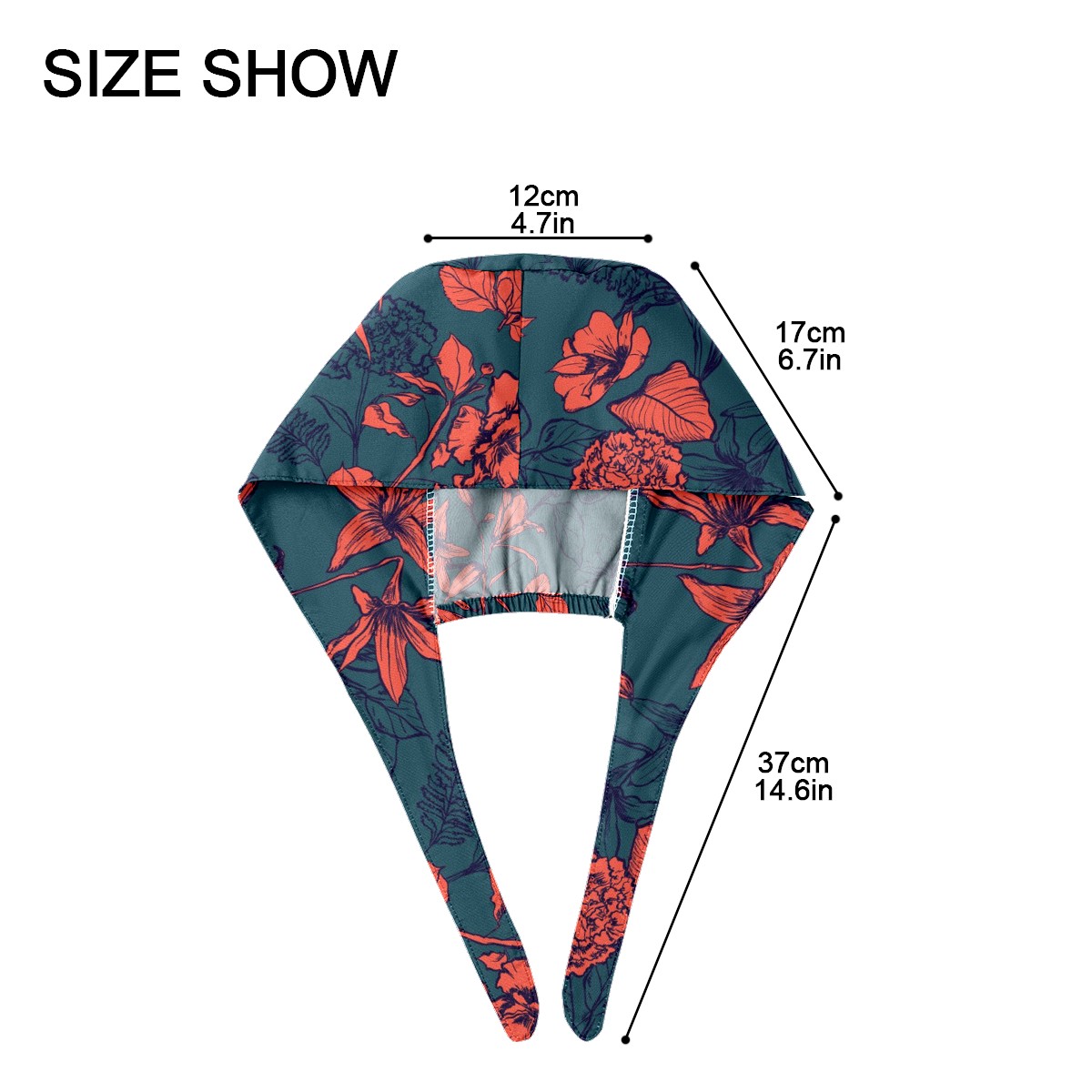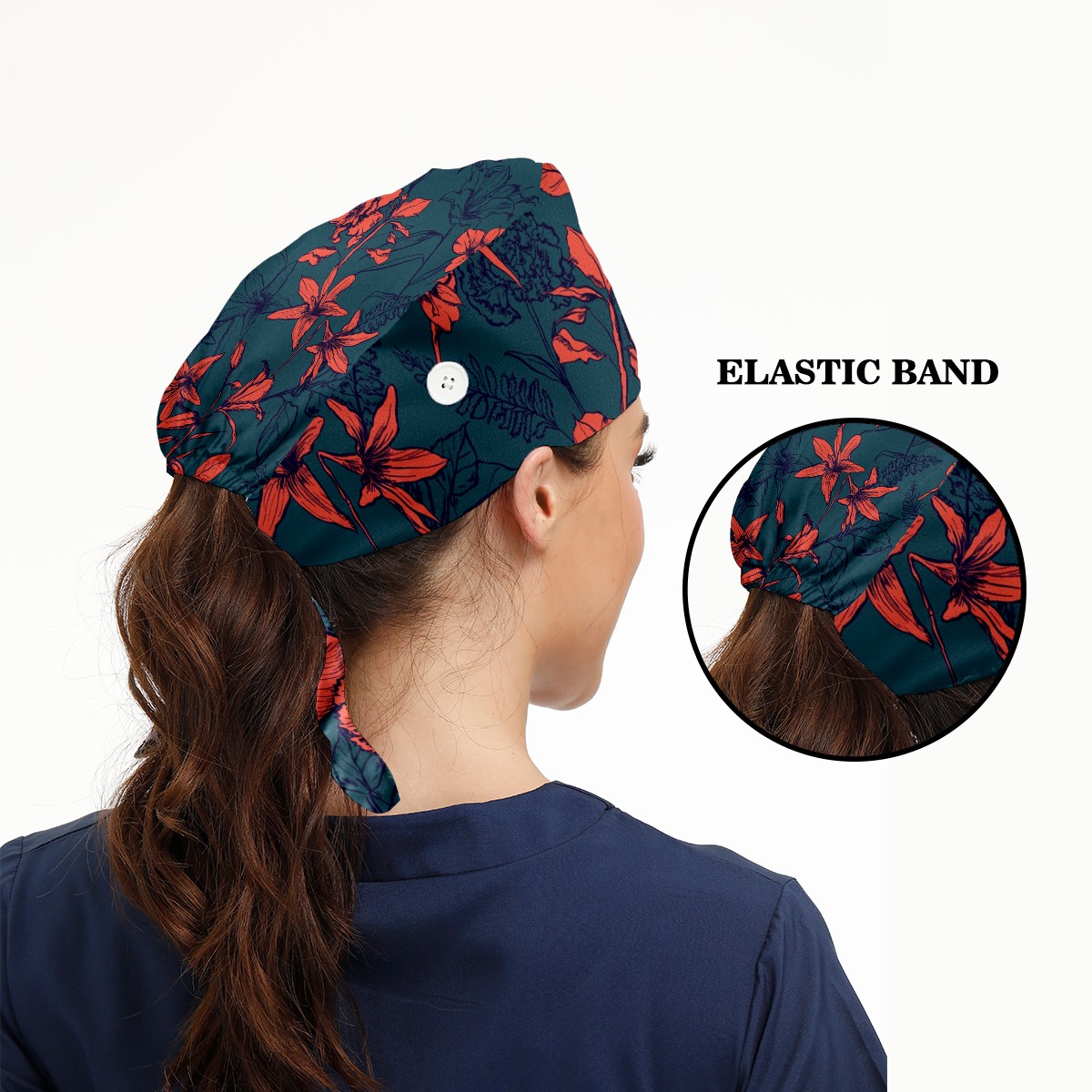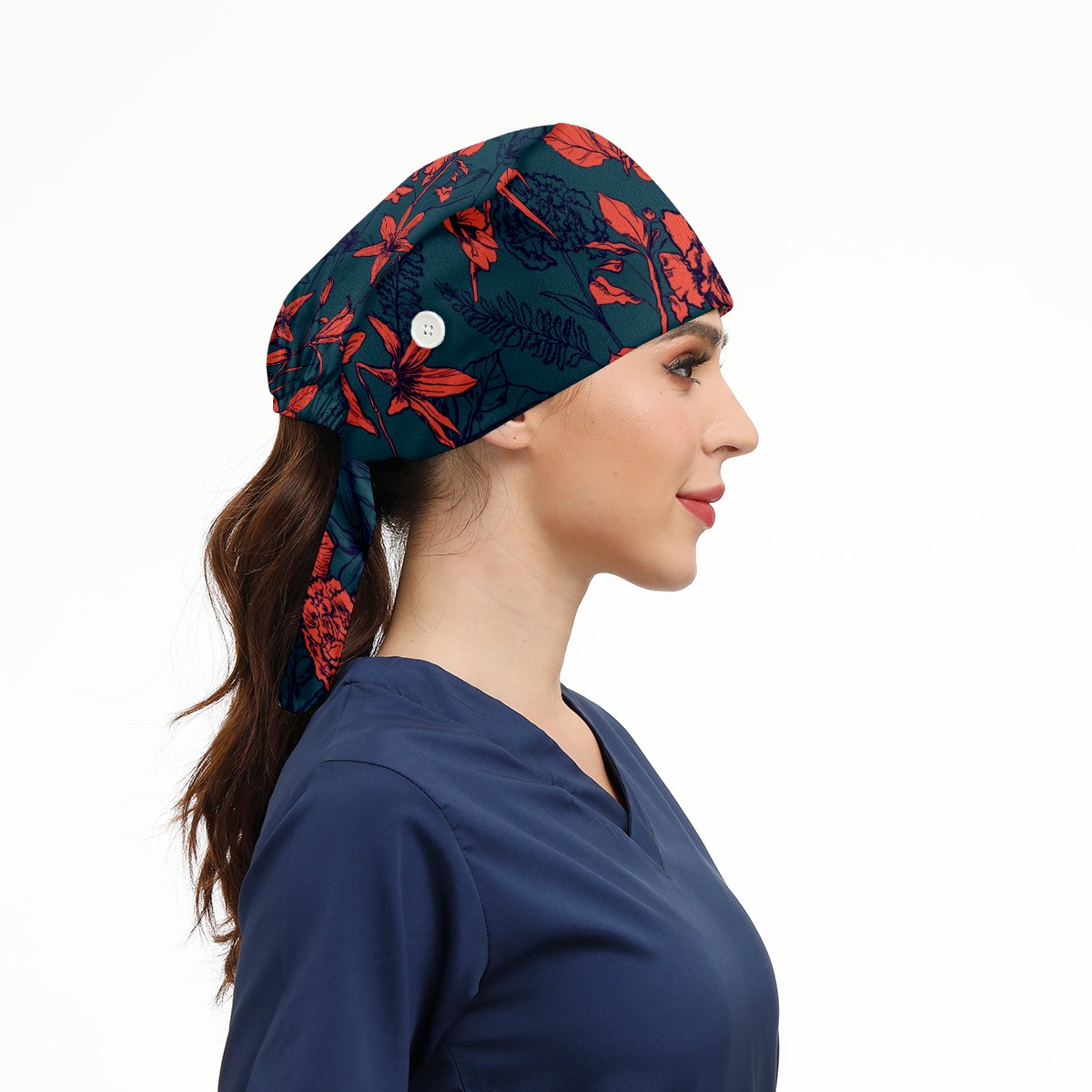 Working Caps with Button & Sweatband Satin Lined Cotton Adjustable Nurse Hats Elastic Band Scrub Cap Surgeon Hat Stylish Vintage Red Botanical Flowers