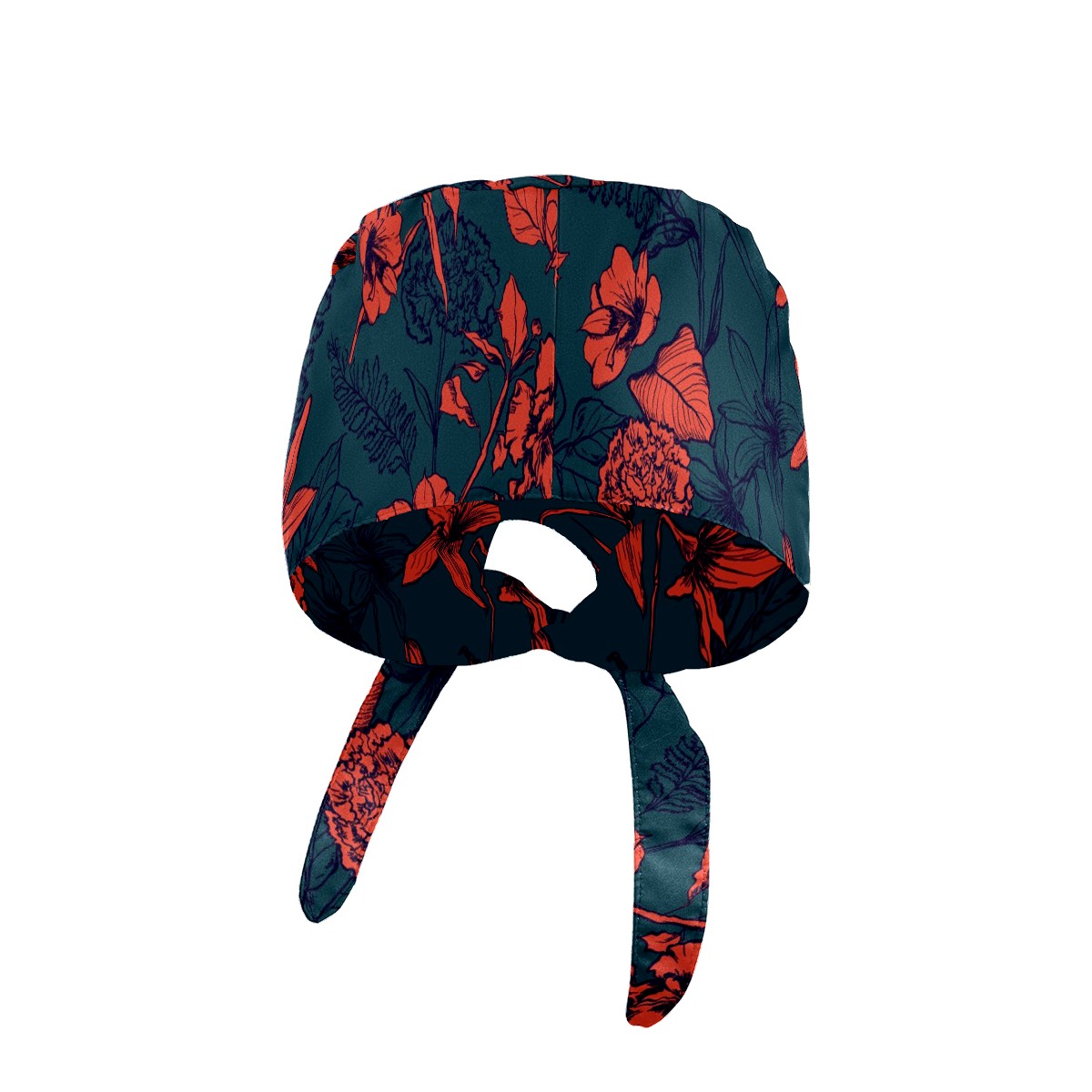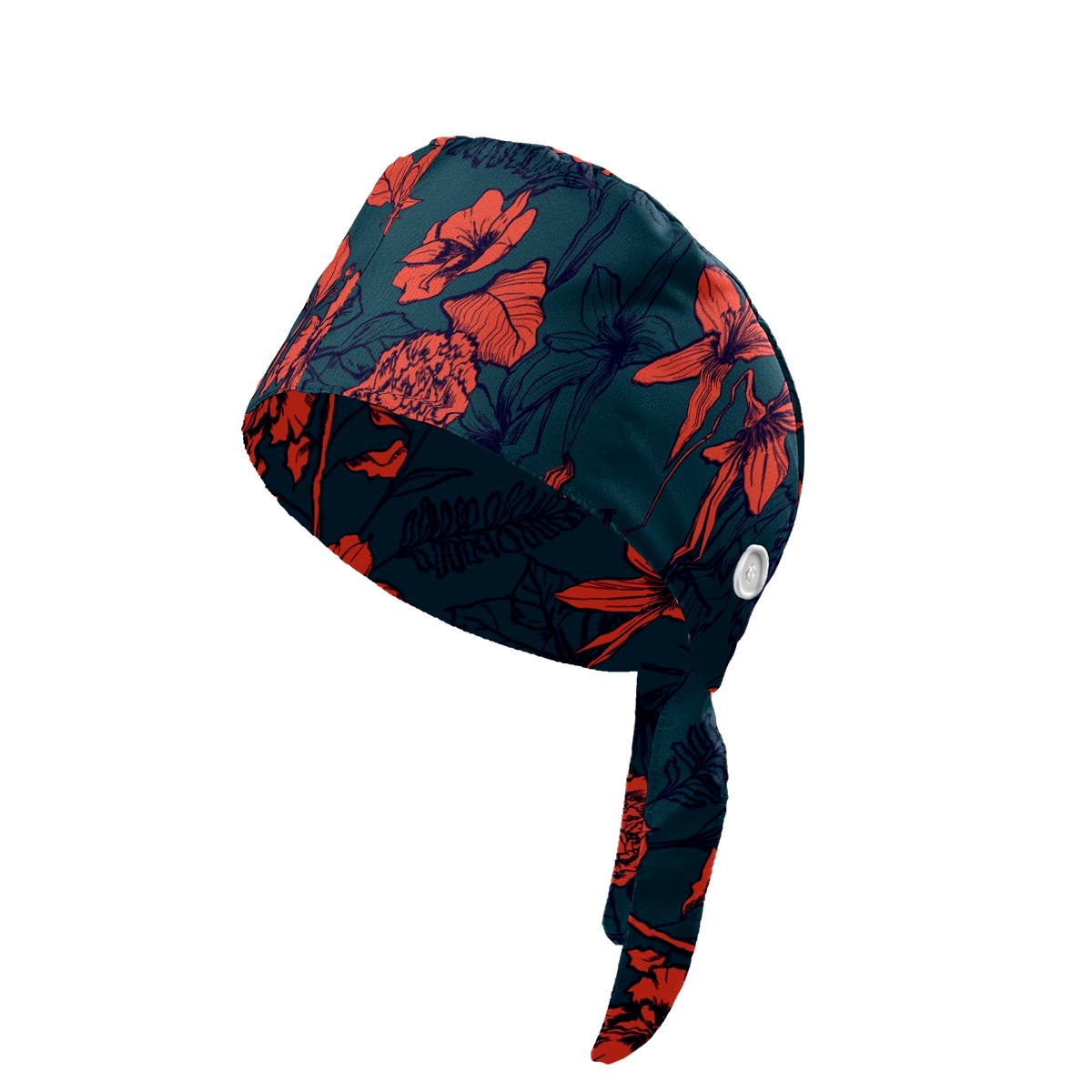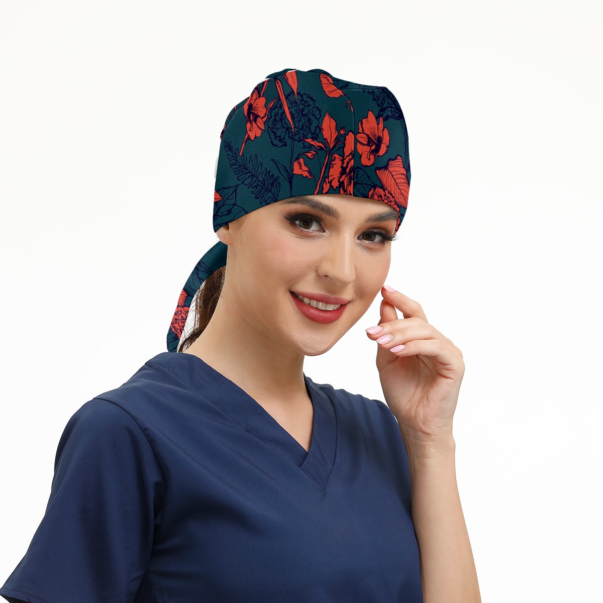 Working Caps with Button & Sweatband Satin Lined Cotton Adjustable Nurse Hats Elastic Band Scrub Cap Surgeon Hat Stylish Vintage Red Botanical Flowers