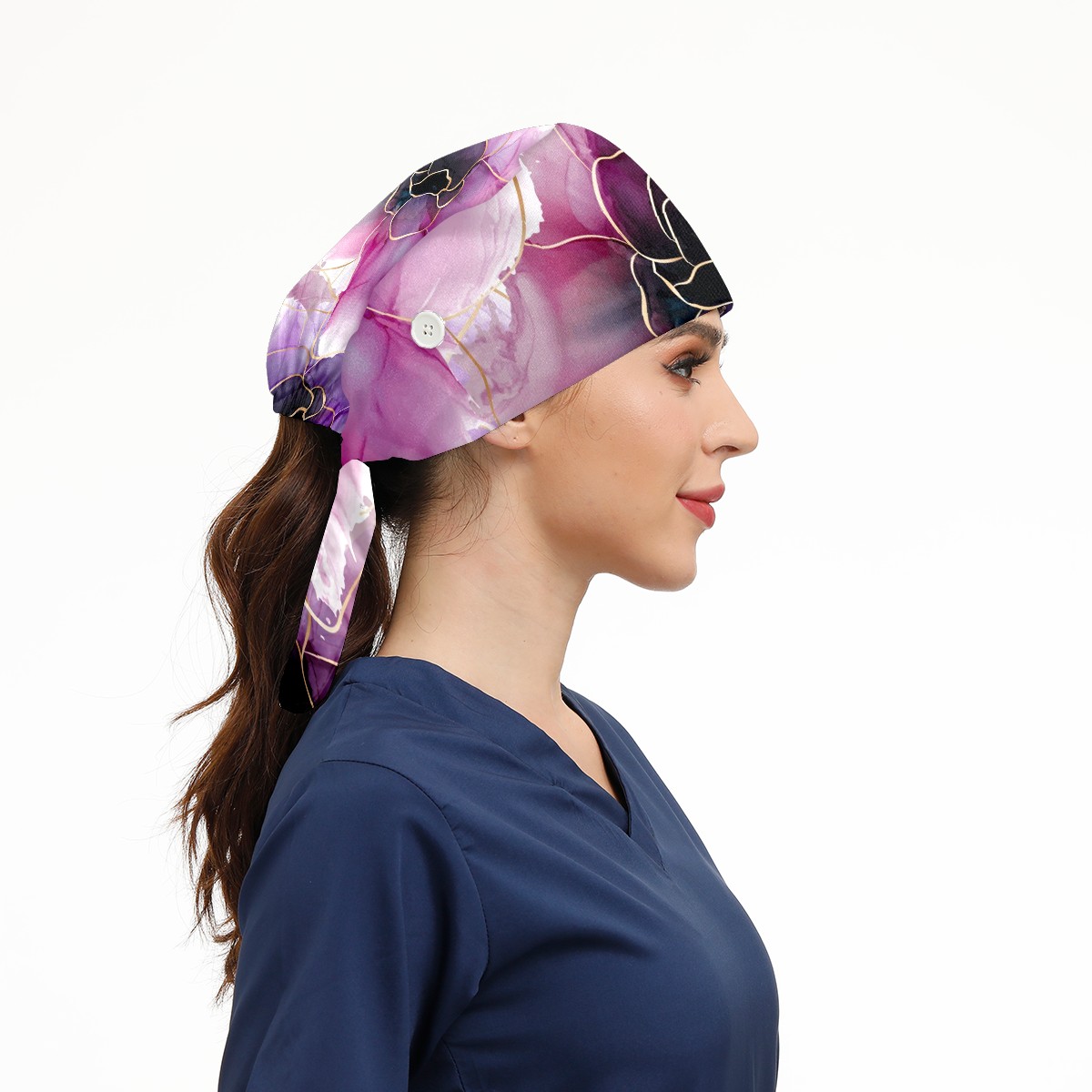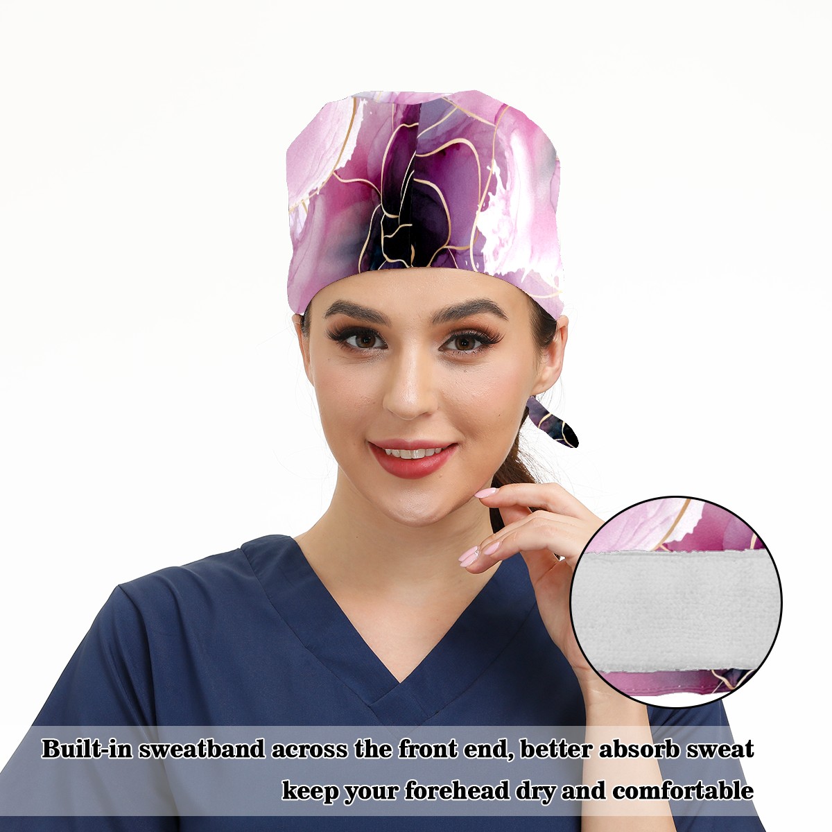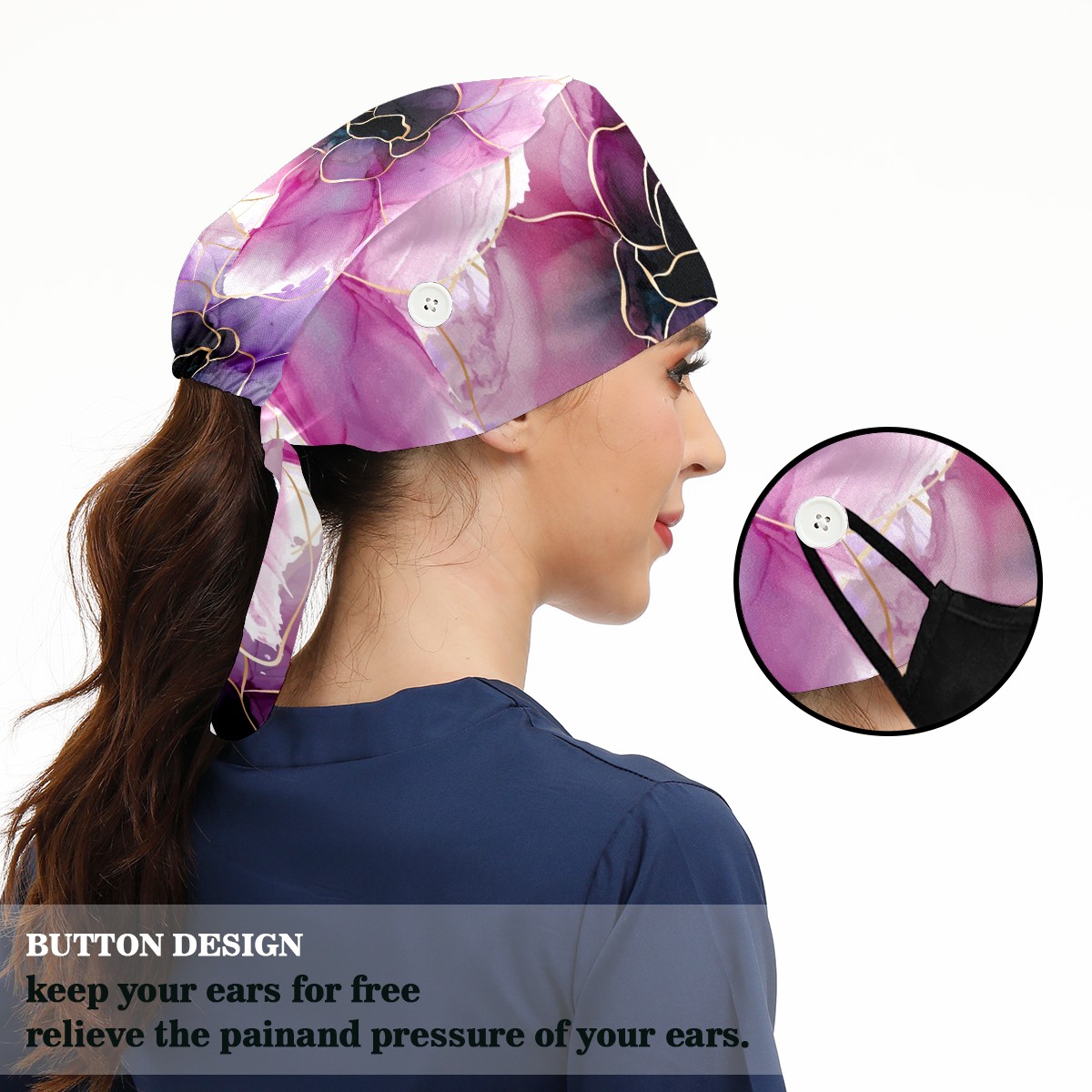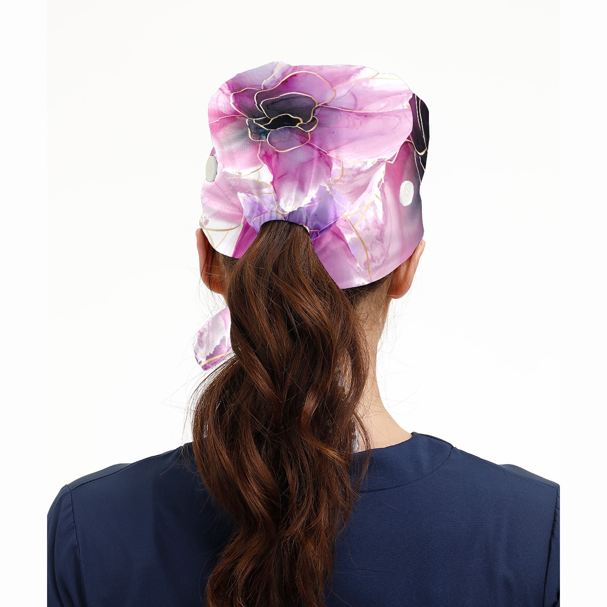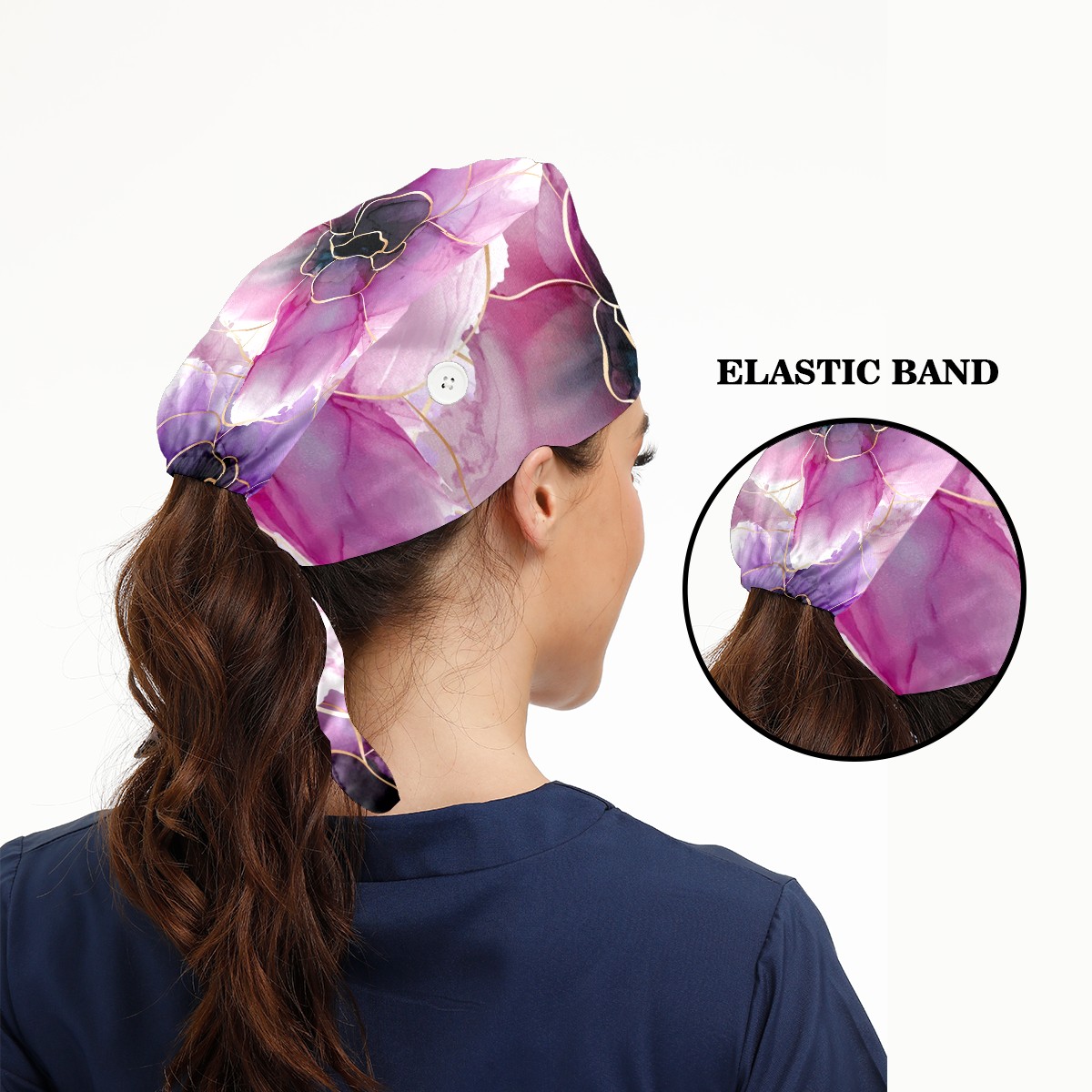 Working Caps with Button & Sweatband Satin Lined Cotton Adjustable Nurse Hats Elastic Band Scrub Cap Surgeon Hat Purple Flower Floral