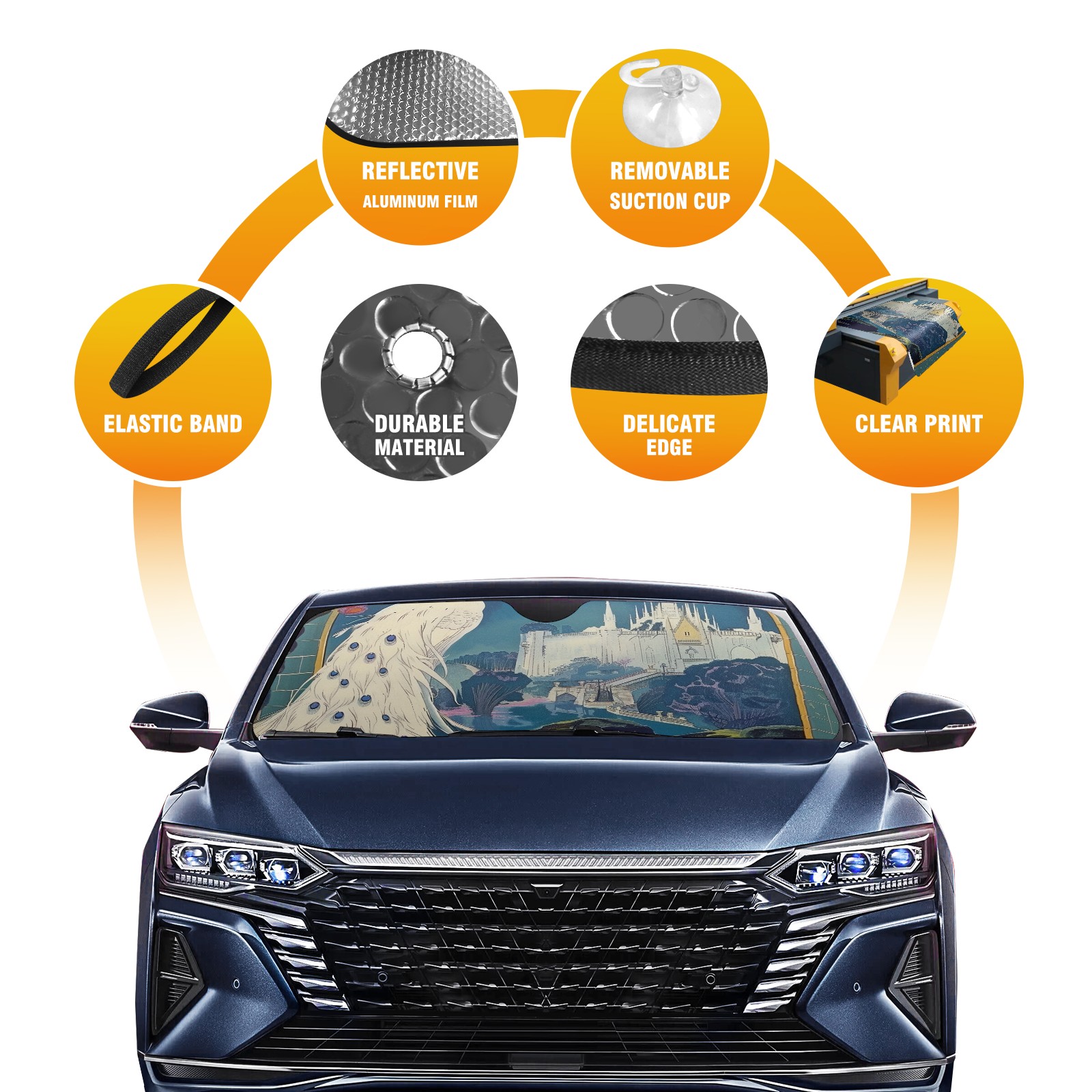 • Diameter /Size 63"L x 33.5"W</b><br> Made from excellent materials which makes it sturdy and protects the car from the sun. Easy to use and pack. Makes the interior of the car cooler.You can easily stash the sunshade in the storage bag or store long term.It open and closes easy. Also the leather storage bag is durable and easy to put the umbrella back into.This windshield sunshade provides complete coverage and keeps your car interior cool under direct sun. It is easy to open and position under the windshield and around the rear-view mirror. Makes Your Car Easy To Identify, Perfect For Finding Your Car In Crowded Parking Lots And Garages.Great Choice: It Is A Great Gift For Dad, Boyfriend, Brother, Brother And Uncle, Friends, Classmates, Family And So On.<br> Notice:</b><br> Due To Difference Computer Monitors, The Color Maybe Slightly Different From Picture. As Different Measurement Methods, Measurement Data Will Float Within 2%.I Hope You Understand.<br> If You Have Any Question About The Item Please Do Not Hesitate To Contact Us Immediately And We Will Give You A Satisfactory Reply Within 24 Hours.