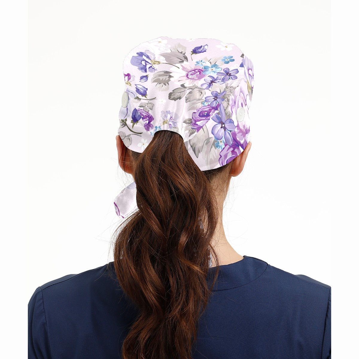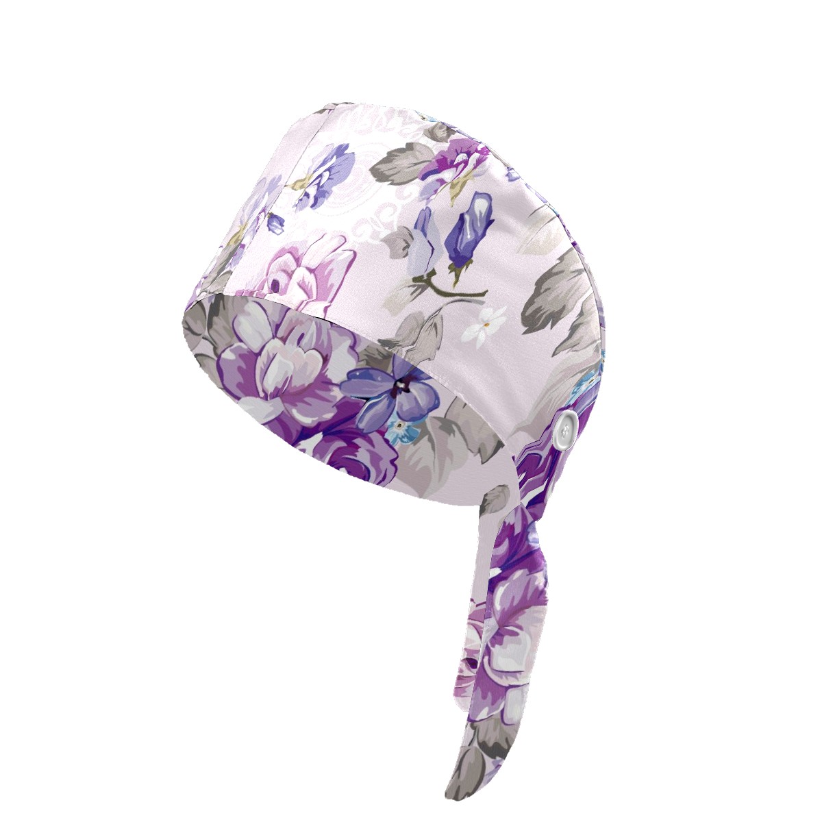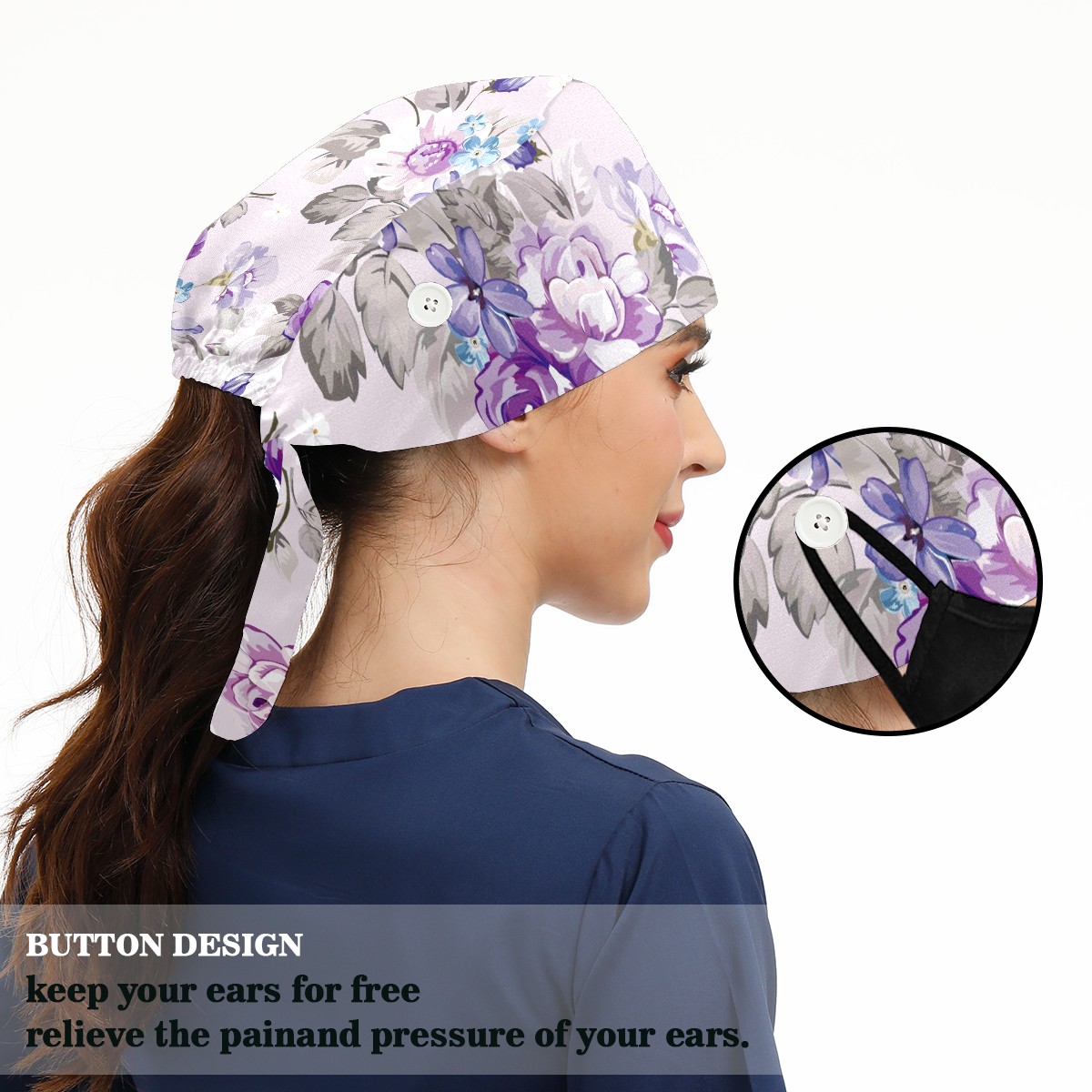 Working Caps with Button & Sweatband Satin Lined Cotton Adjustable Nurse Hats Elastic Band Scrub Cap Surgeon Hat Purple Flower