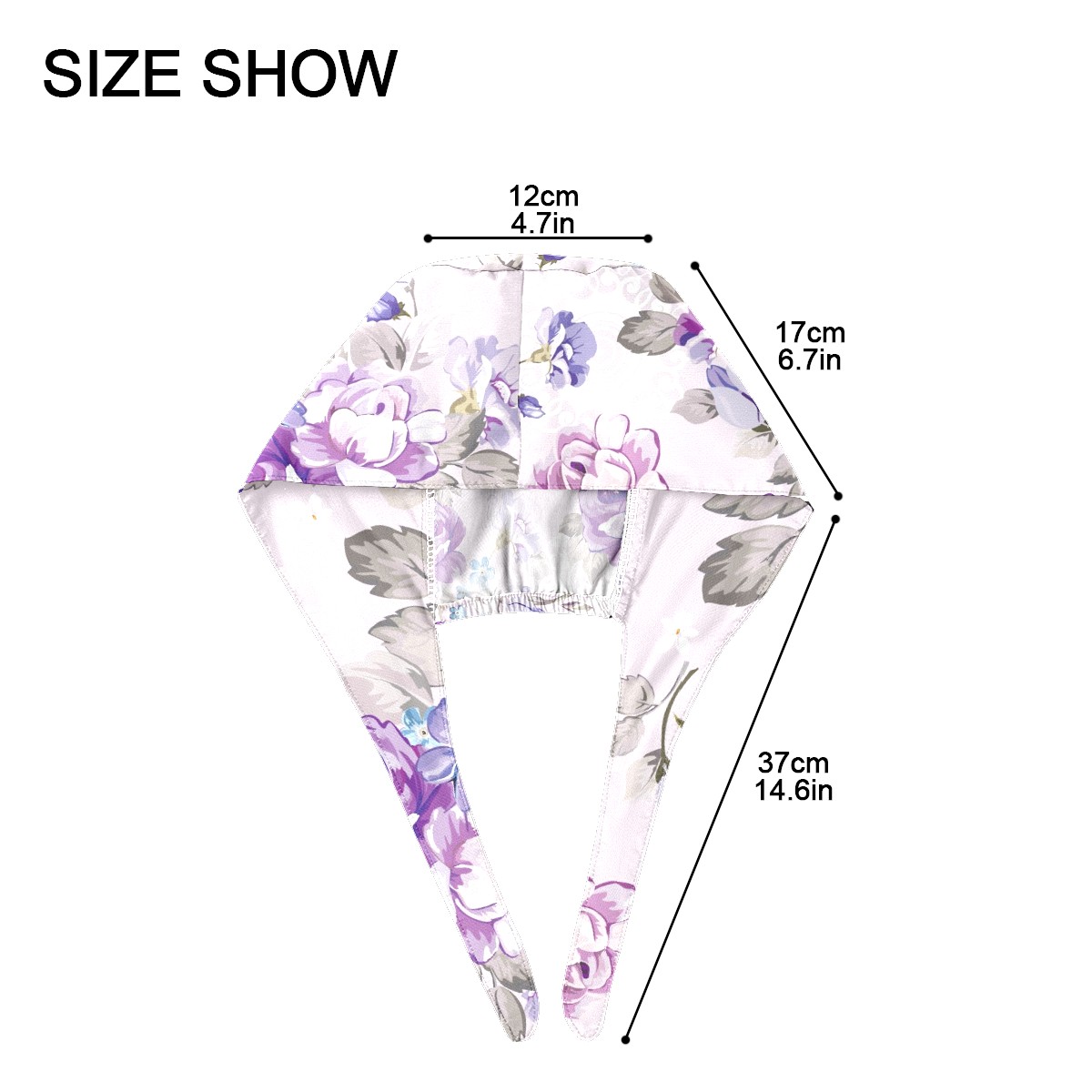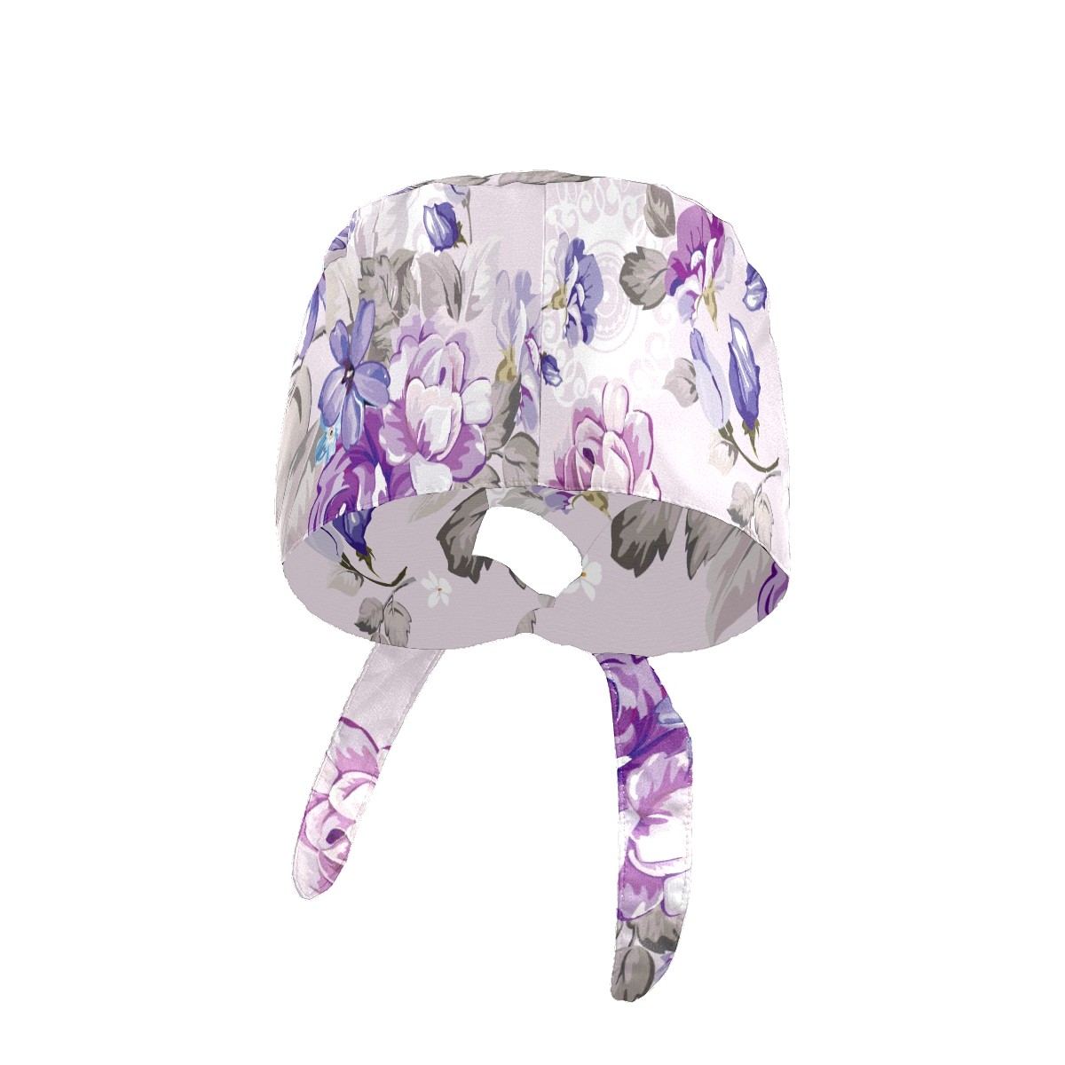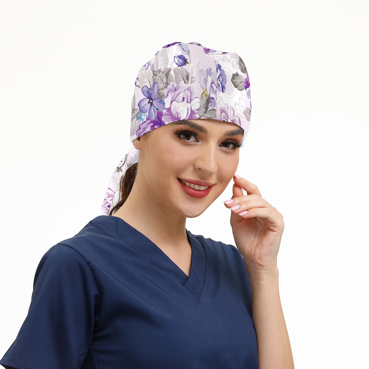 Working Caps with Button & Sweatband Satin Lined Cotton Adjustable Nurse Hats Elastic Band Scrub Cap Surgeon Hat Purple Flower