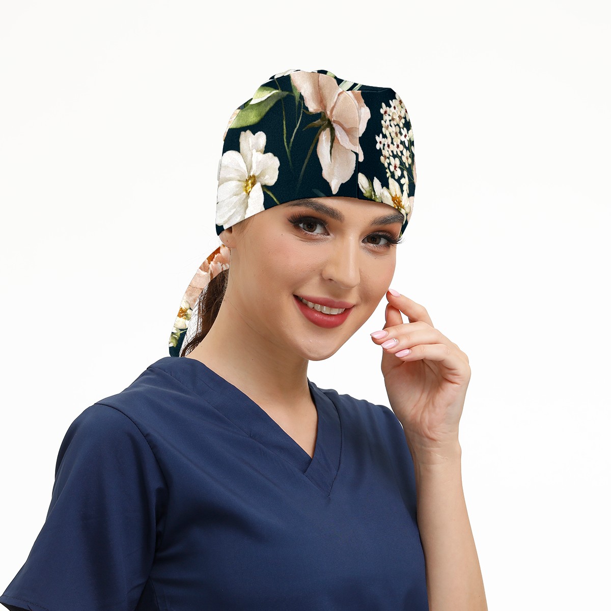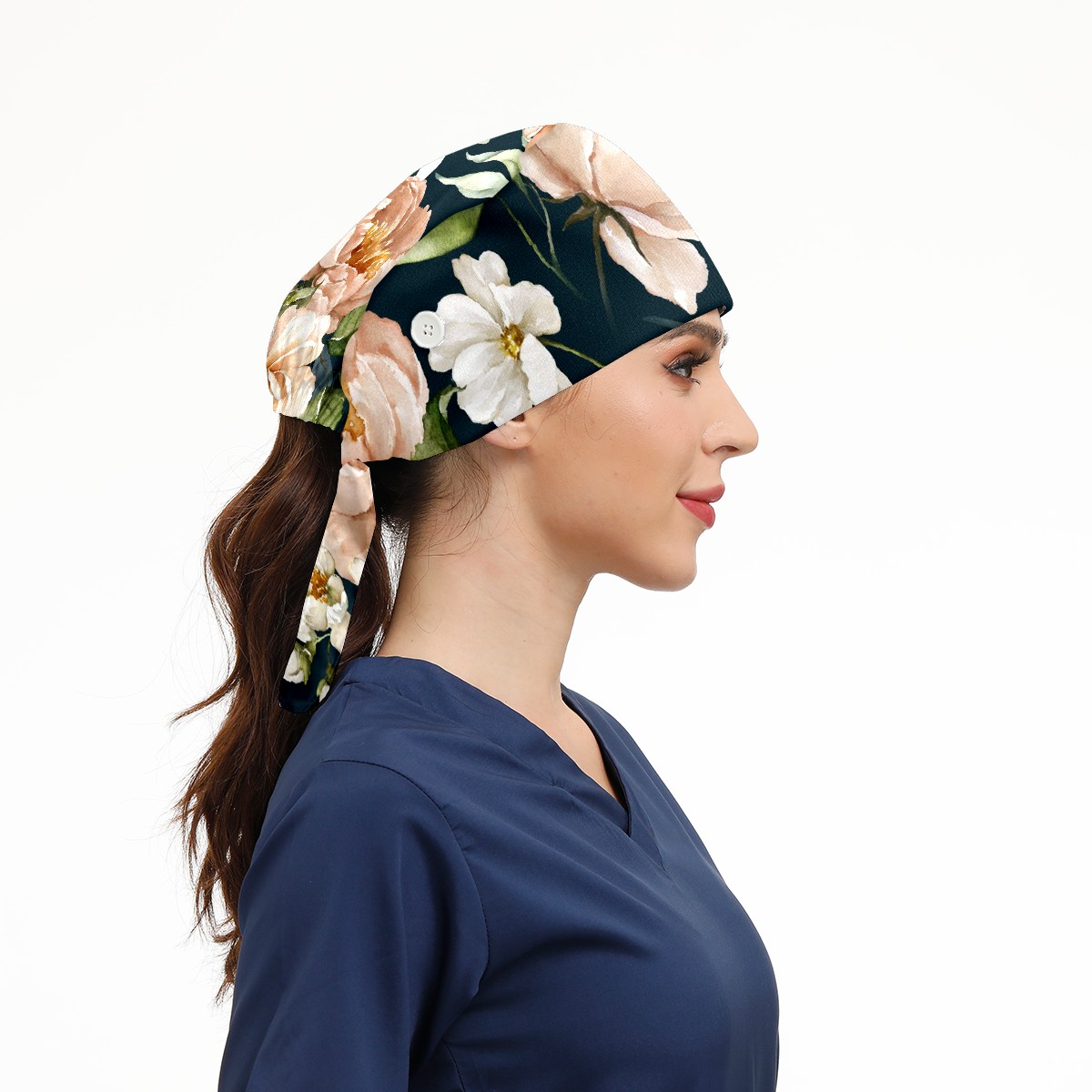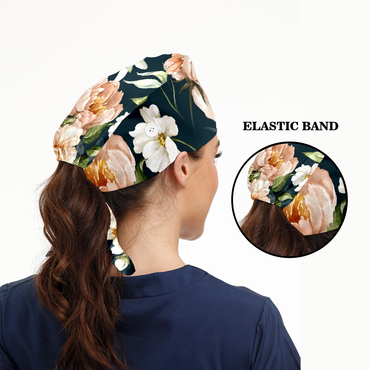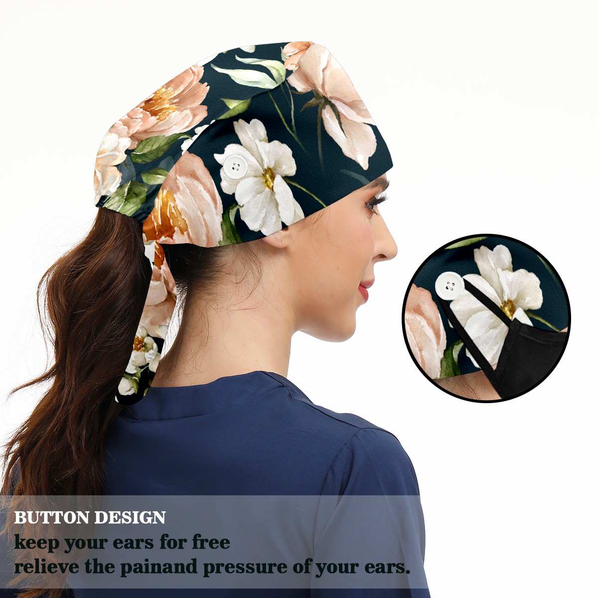 Working Caps with Button & Sweatband Satin Lined Cotton Adjustable Nurse Hats Elastic Band Scrub Cap Surgeon Hat Pink Flowers Green Leaves Branches