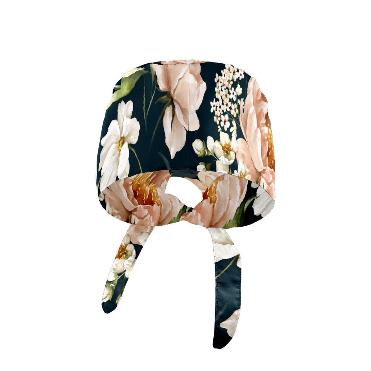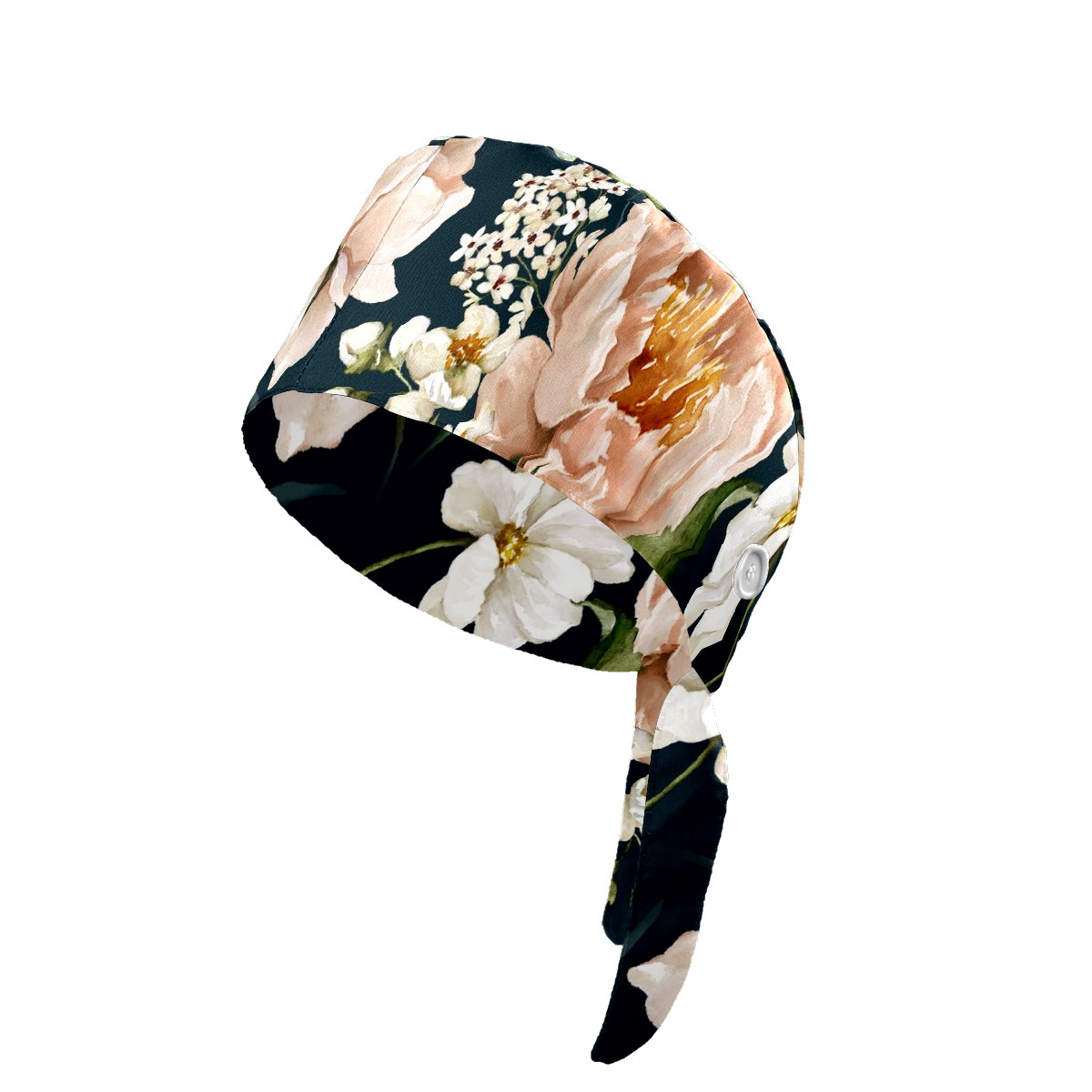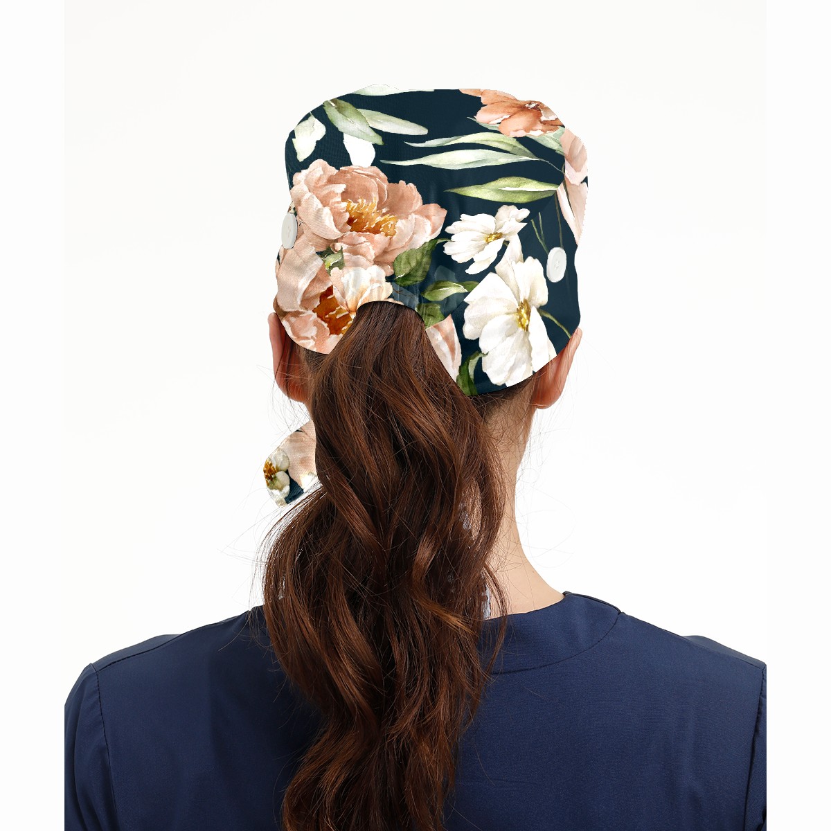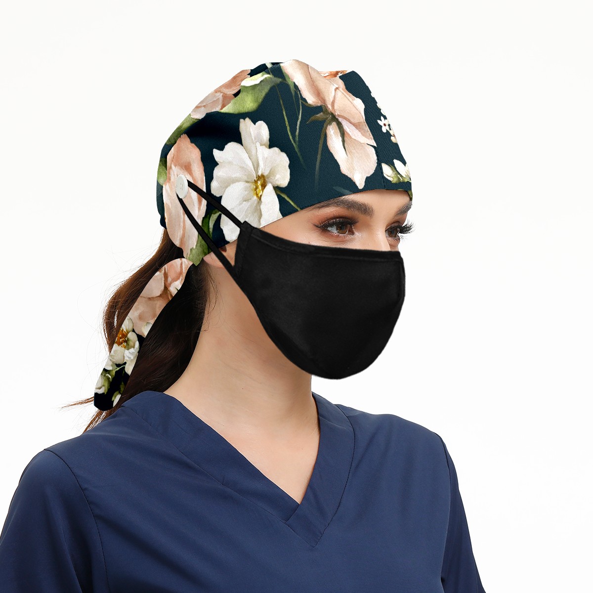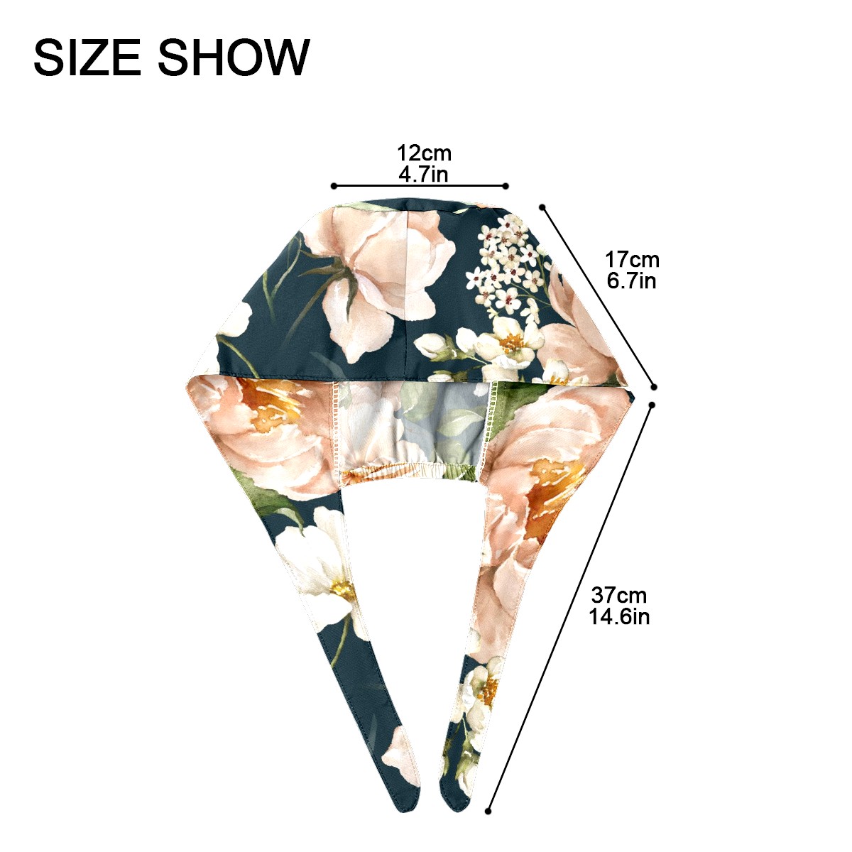 Working Caps with Button & Sweatband Satin Lined Cotton Adjustable Nurse Hats Elastic Band Scrub Cap Surgeon Hat Pink Flowers Green Leaves Branches