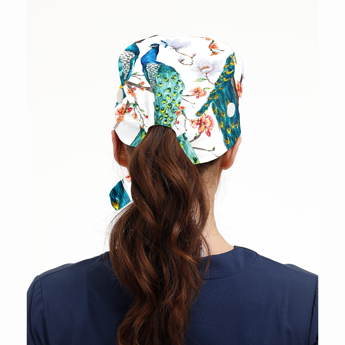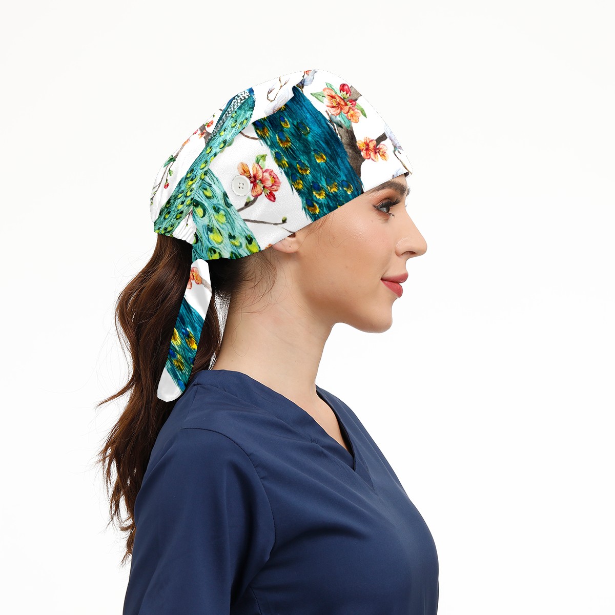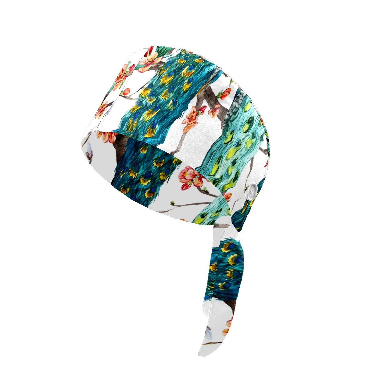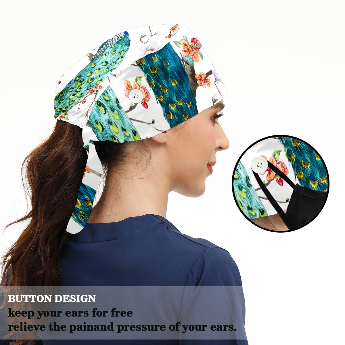 Working Caps with Button & Sweatband Satin Lined Cotton Adjustable Nurse Hats Elastic Band Scrub Cap Surgeon Hat Peacock Cherry Blossom Magnolia Flower