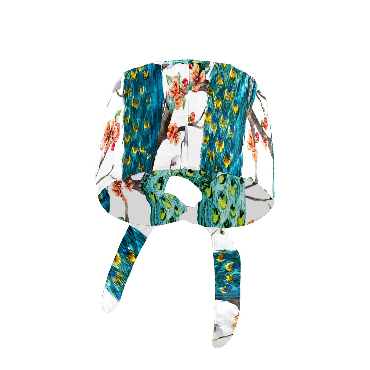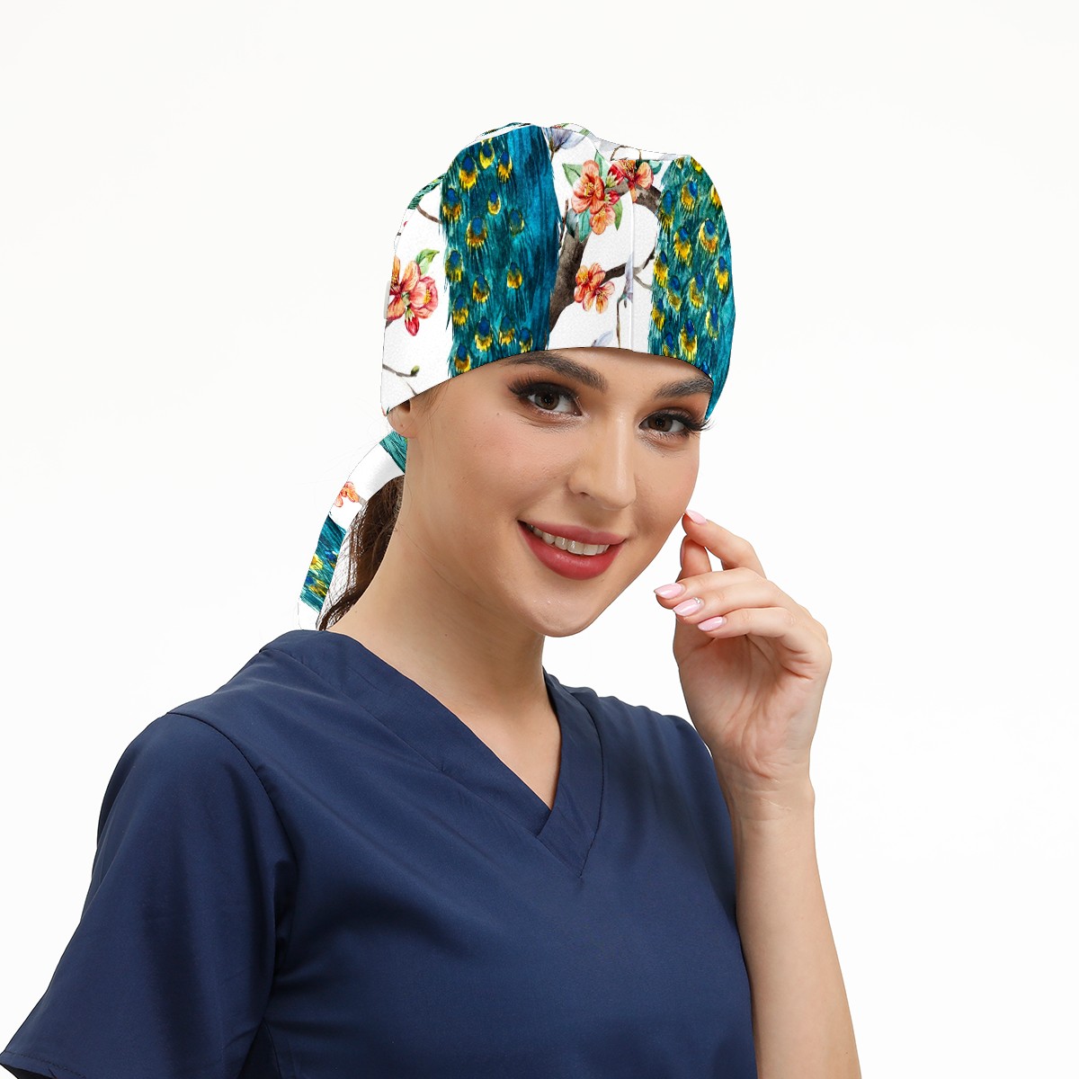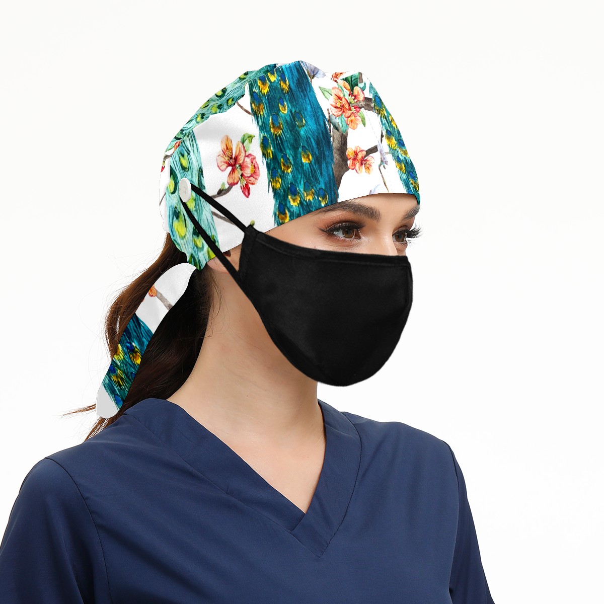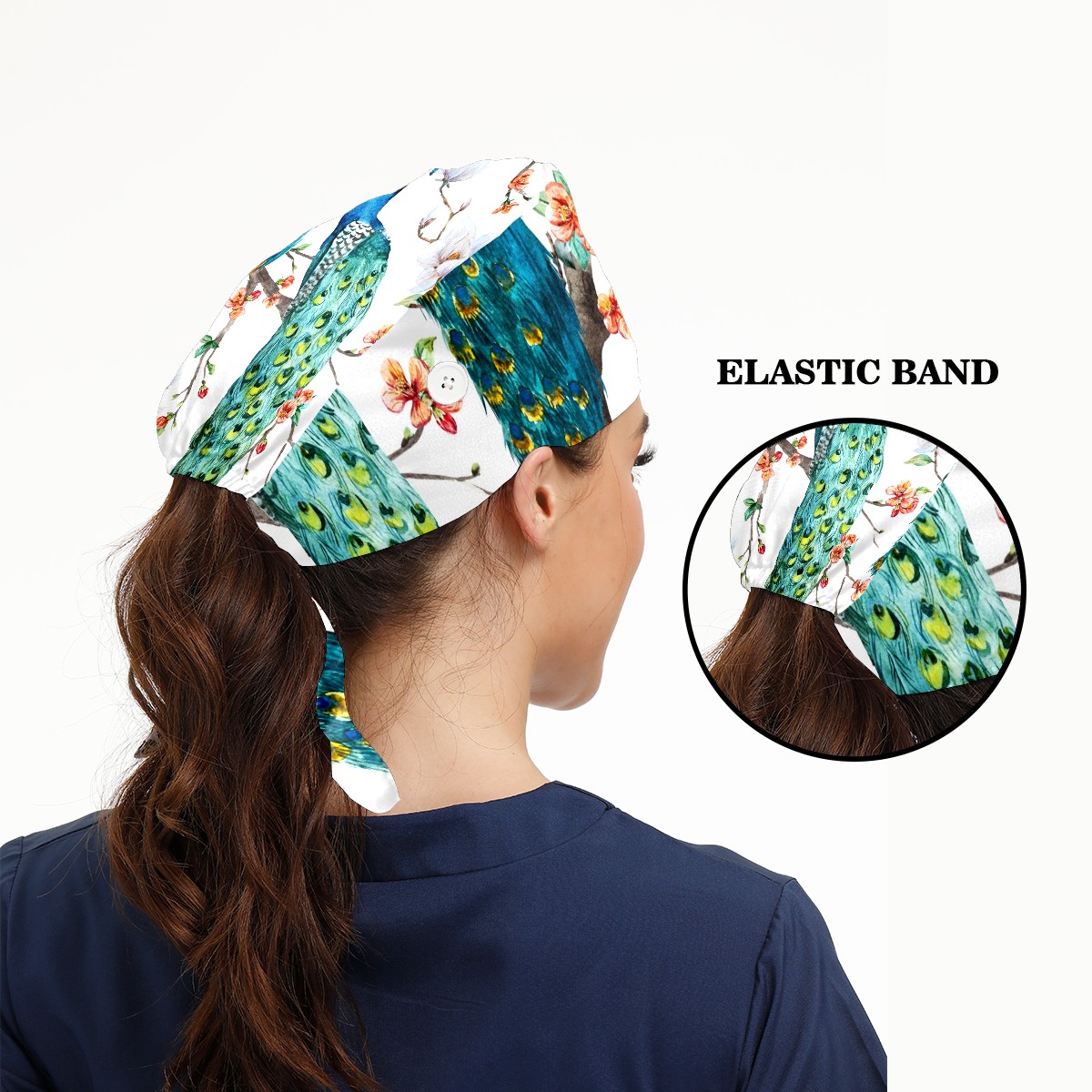 Working Caps with Button & Sweatband Satin Lined Cotton Adjustable Nurse Hats Elastic Band Scrub Cap Surgeon Hat Peacock Cherry Blossom Magnolia Flower