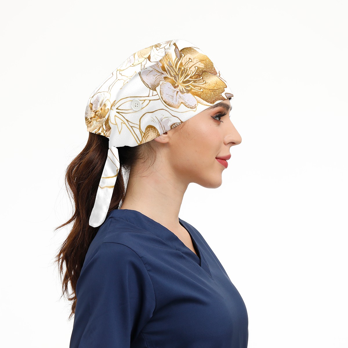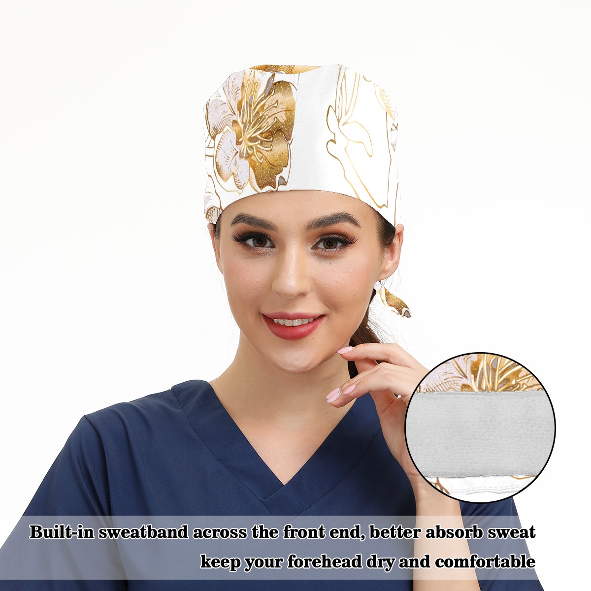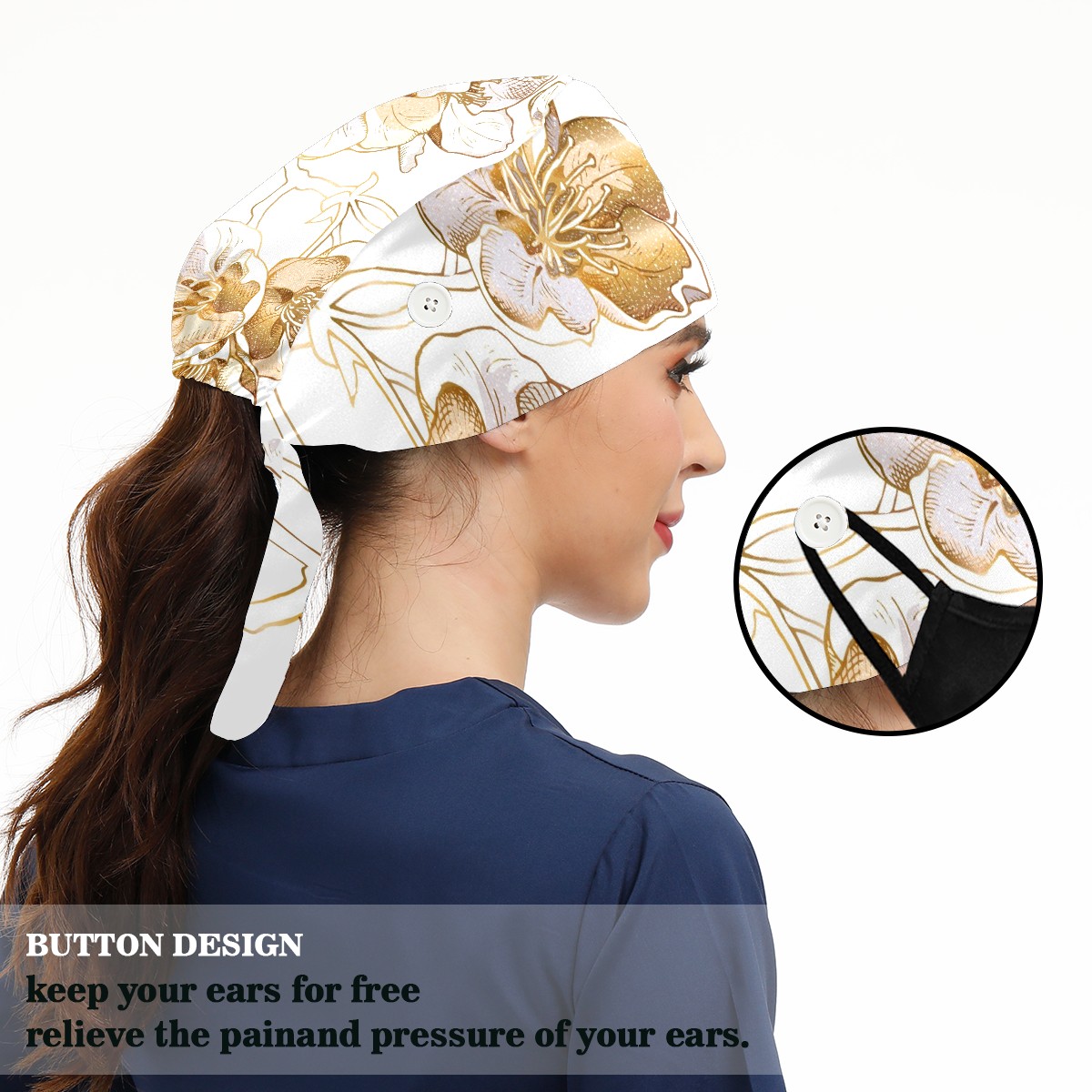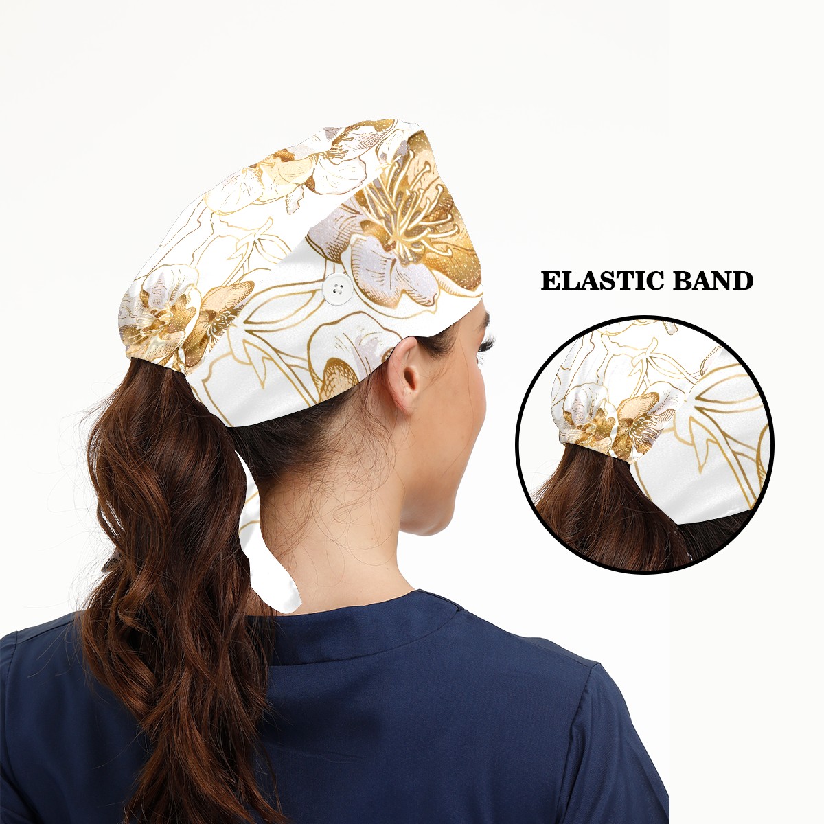 Working Caps with Button & Sweatband Satin Lined Cotton Adjustable Nurse Hats Elastic Band Scrub Cap Surgeon Hat Luxury Golden Cherry Blossom Flower