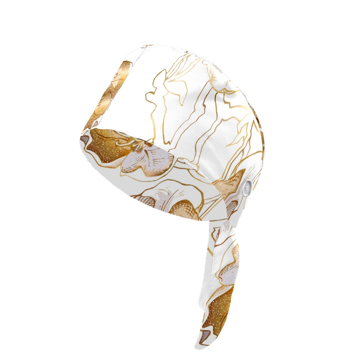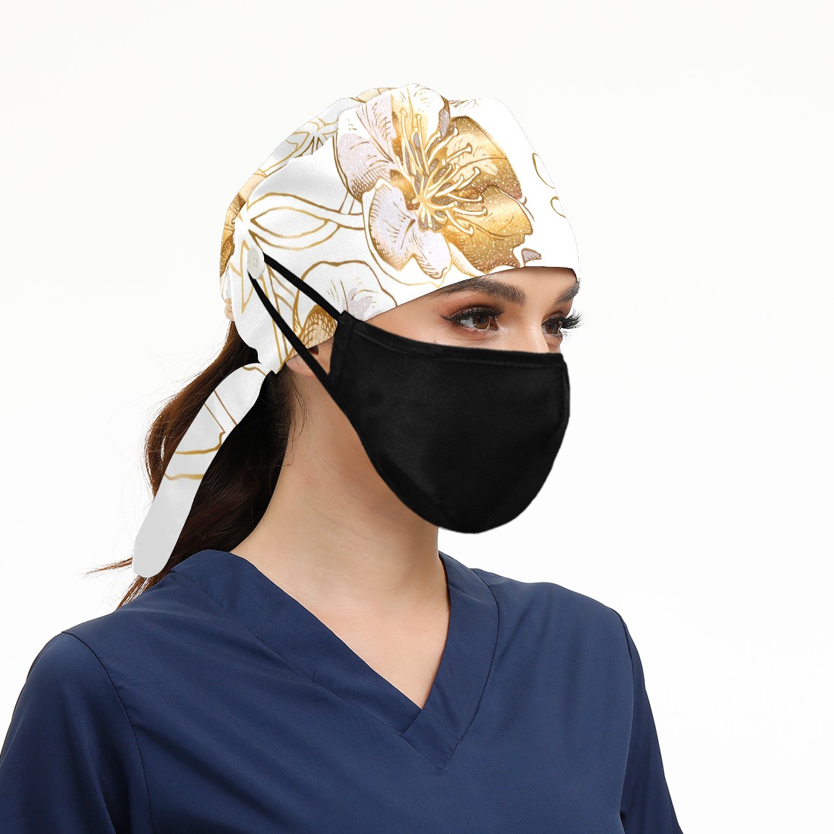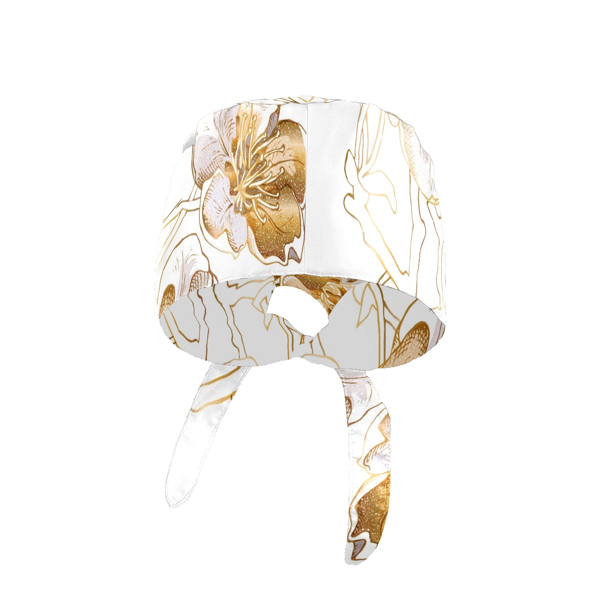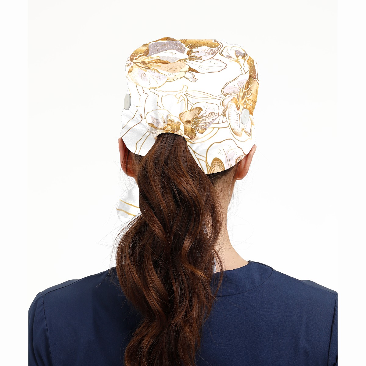 Working Caps with Button & Sweatband Satin Lined Cotton Adjustable Nurse Hats Elastic Band Scrub Cap Surgeon Hat Luxury Golden Cherry Blossom Flower