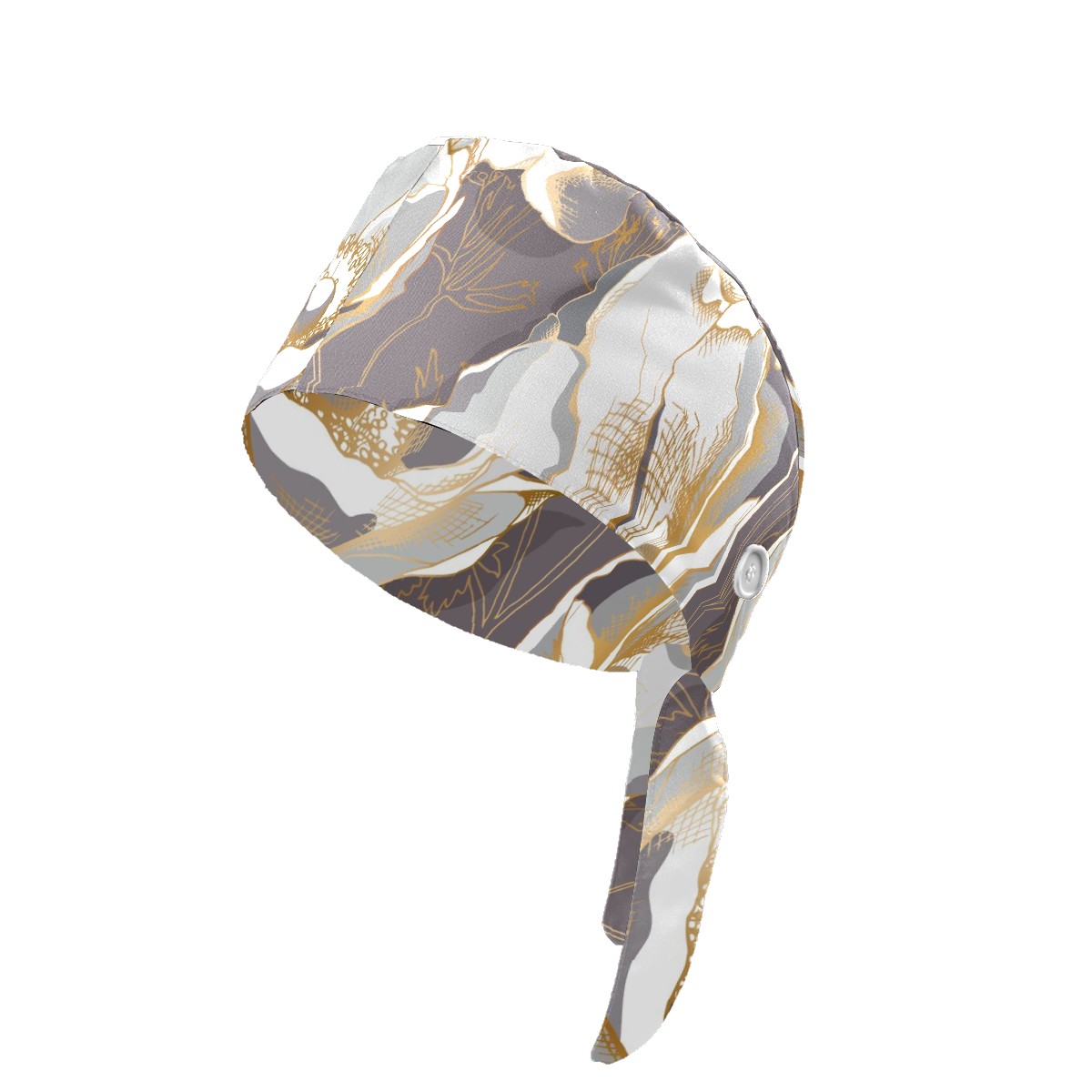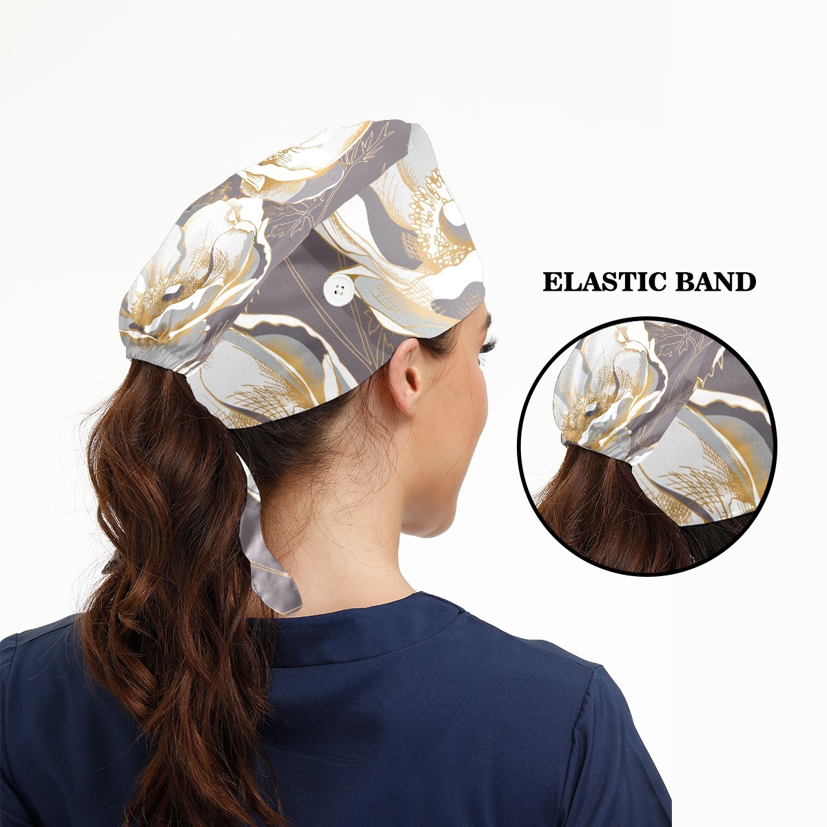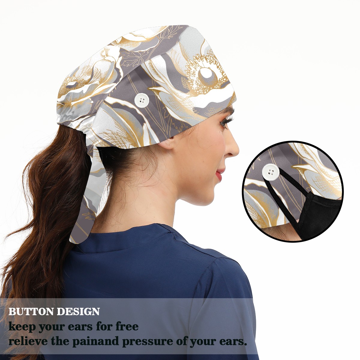 Working Caps with Button & Sweatband Satin Lined Cotton Adjustable Nurse Hats Elastic Band Scrub Cap Surgeon Hat Golden Anemone Flower