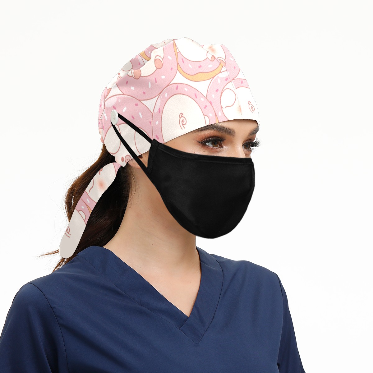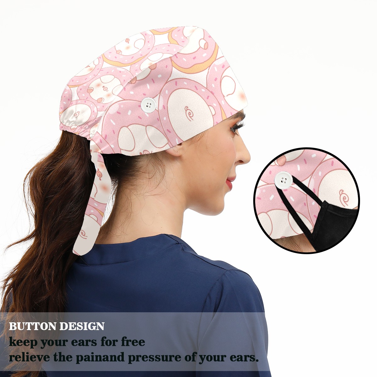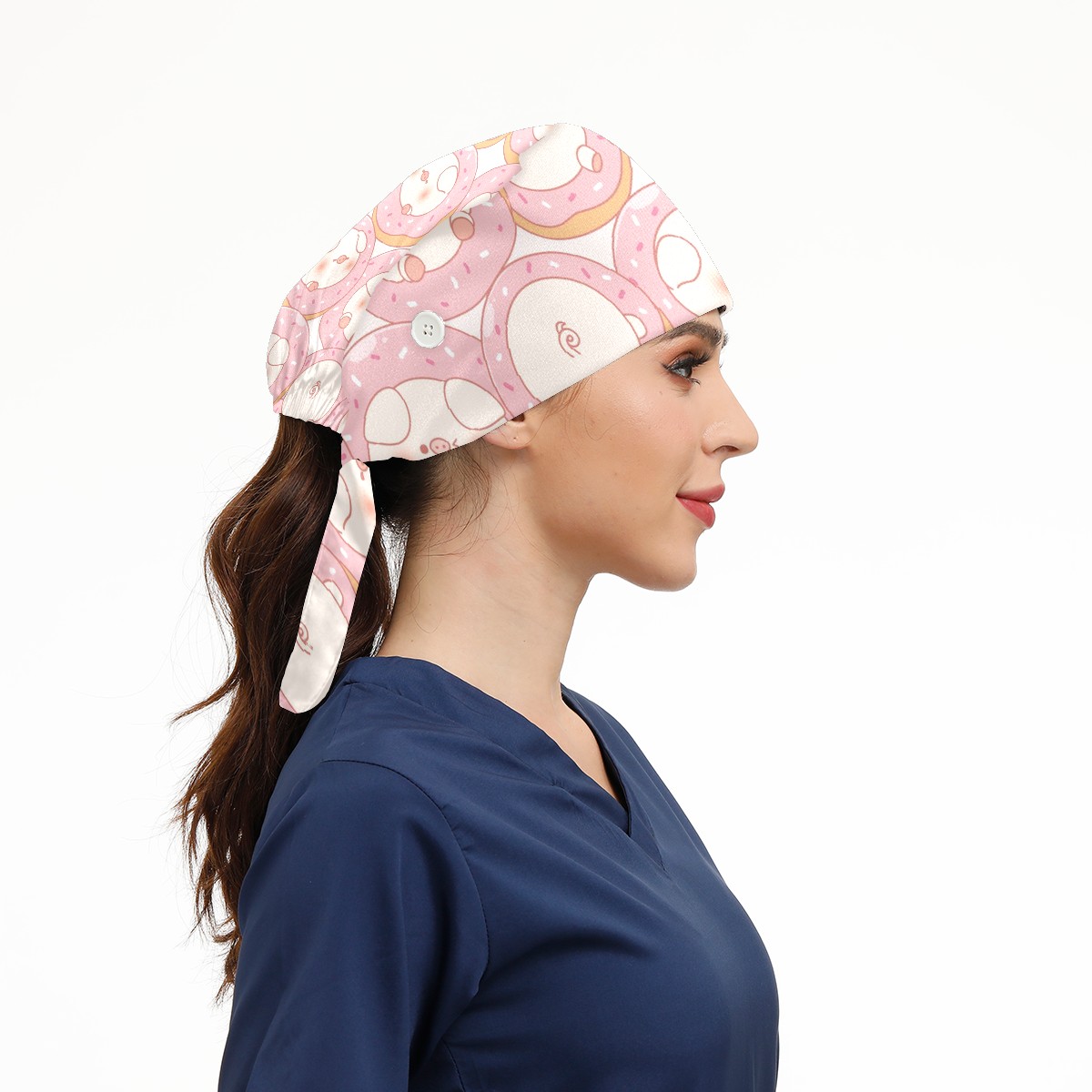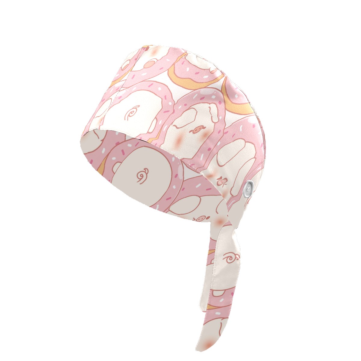 Working Caps with Button & Sweatband Satin Lined Cotton Adjustable Nurse Hats Elastic Band Scrub Cap Surgeon Hat Cute Pink Pig Donuts