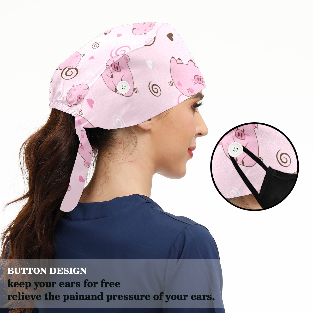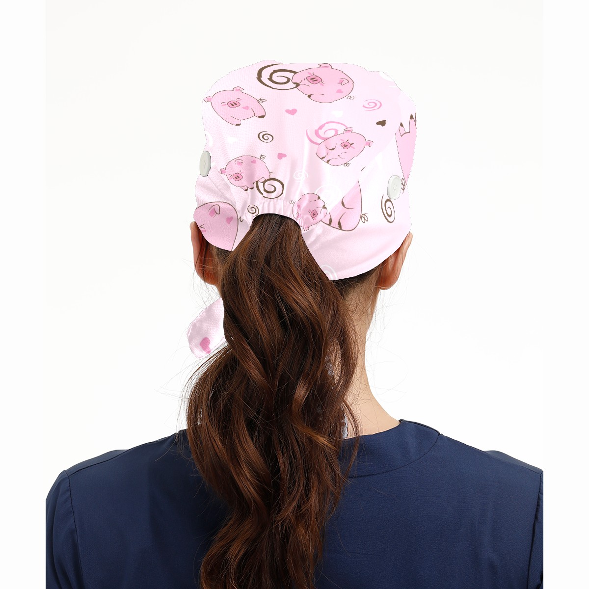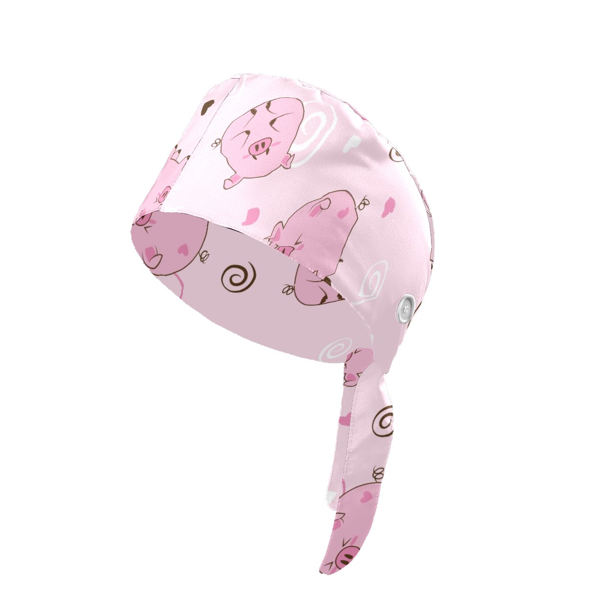 Working Caps with Button & Sweatband Satin Lined Cotton Adjustable Nurse Hats Elastic Band Scrub Cap Surgeon Hat Cute Pig On Pink Background