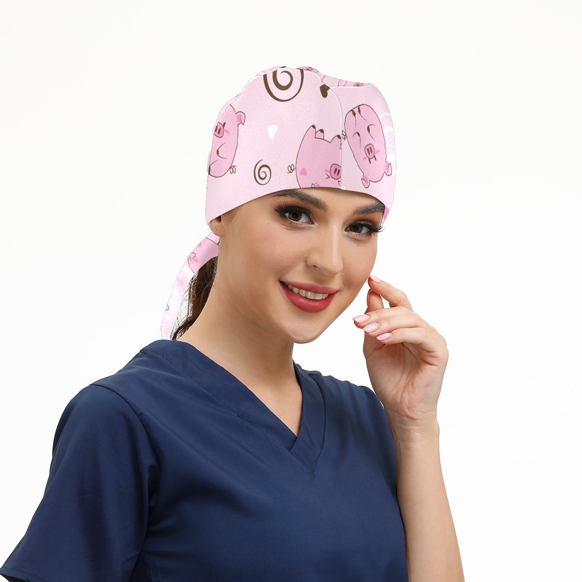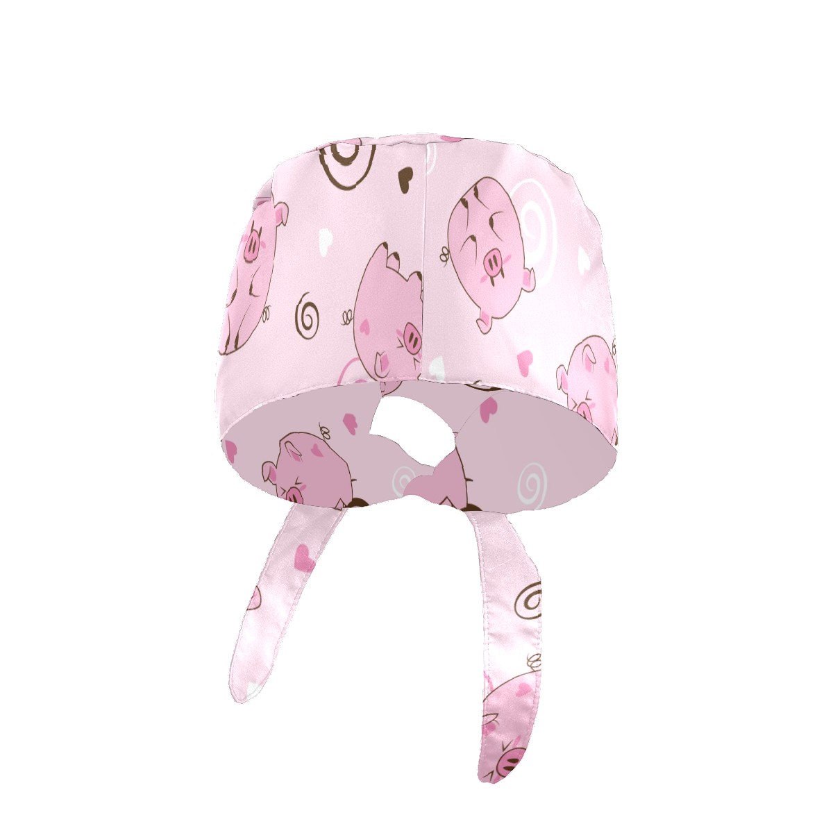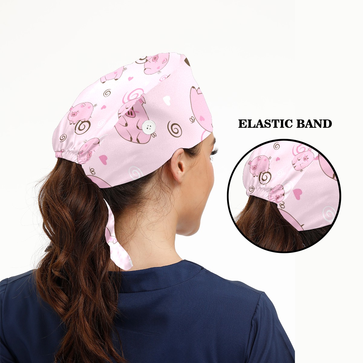 Working Caps with Button & Sweatband Satin Lined Cotton Adjustable Nurse Hats Elastic Band Scrub Cap Surgeon Hat Cute Pig On Pink Background