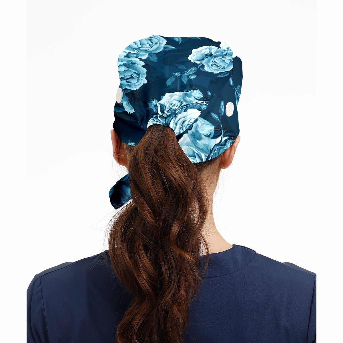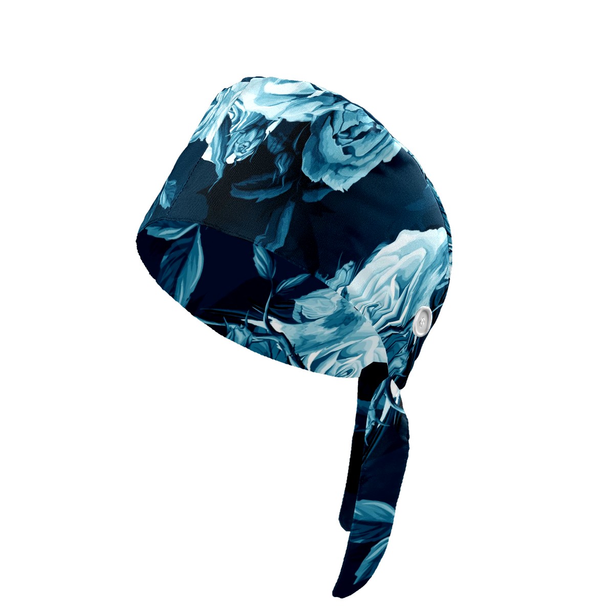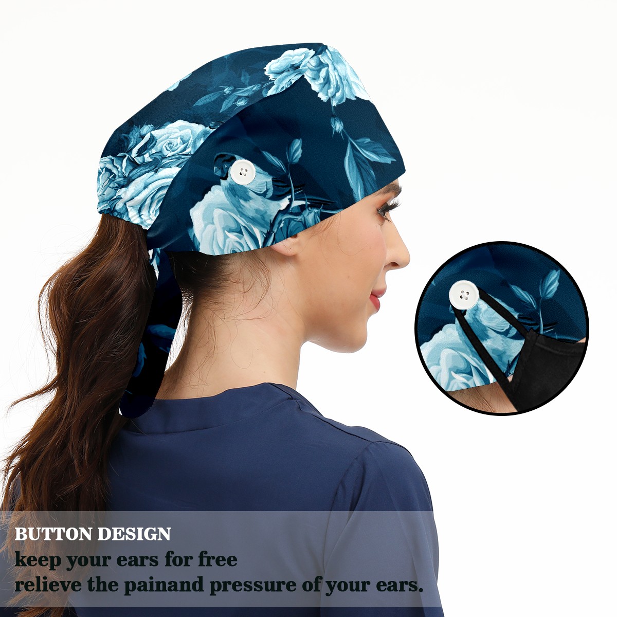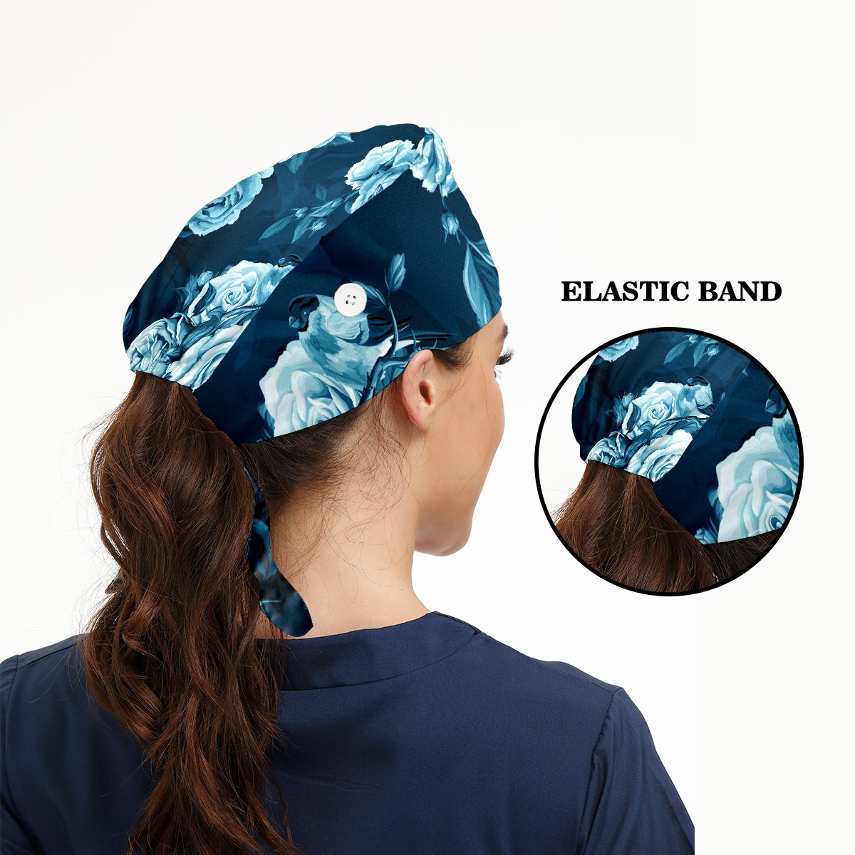 Working Caps with Button & Sweatband Satin Lined Cotton Adjustable Nurse Hats Elastic Band Scrub Cap Surgeon Hat Blue Rose Bird