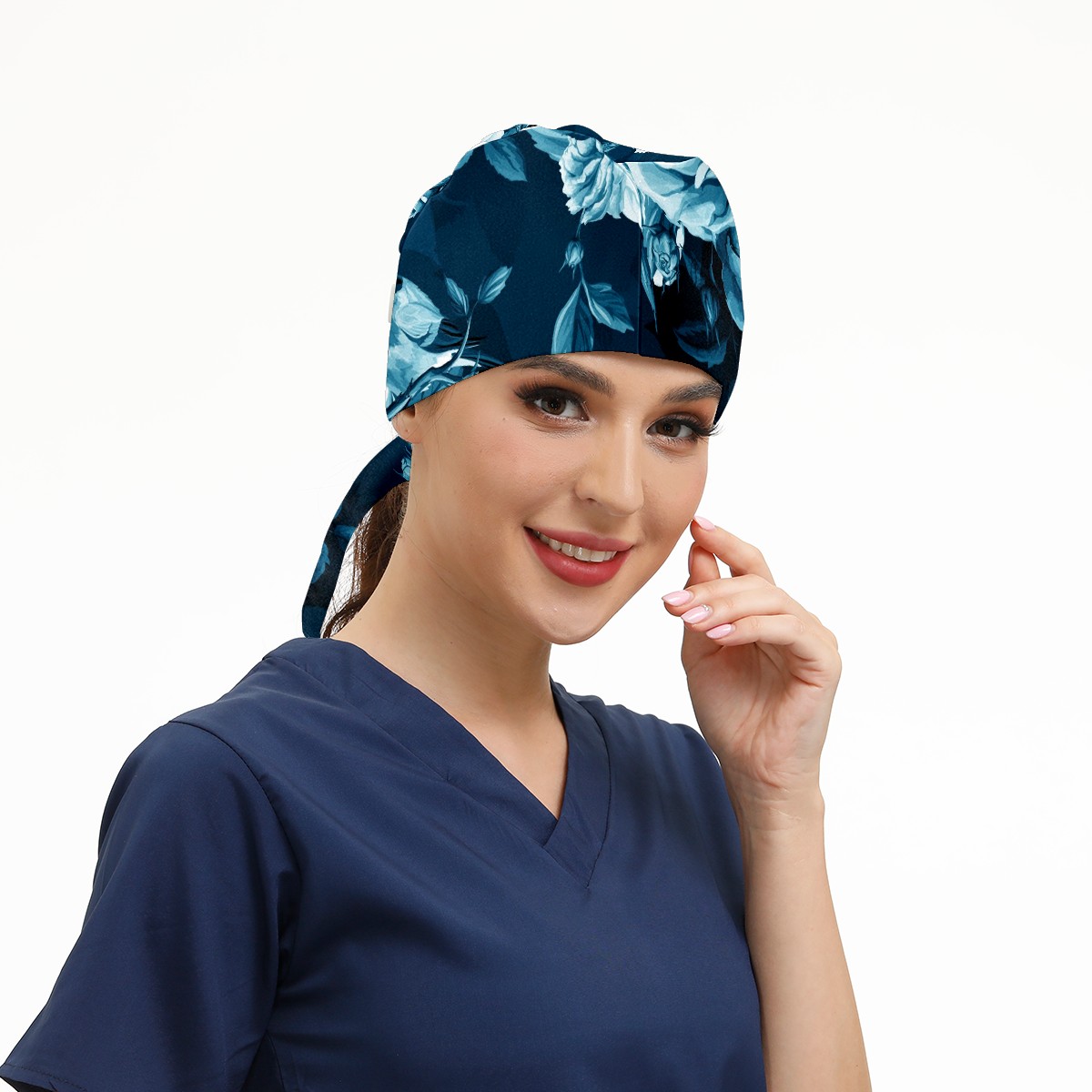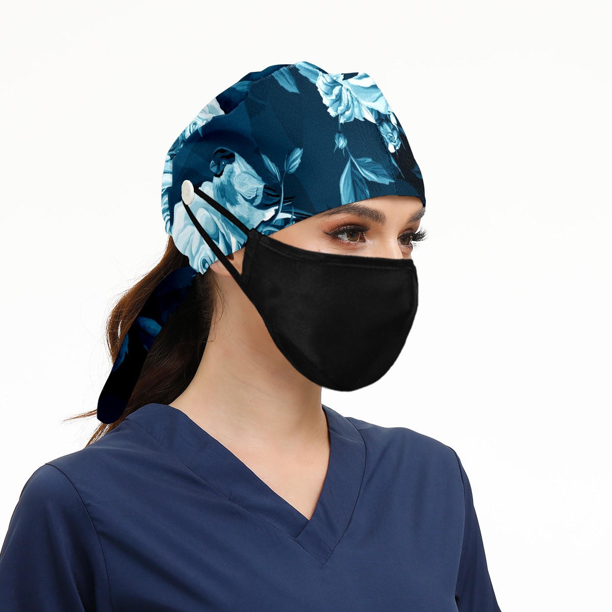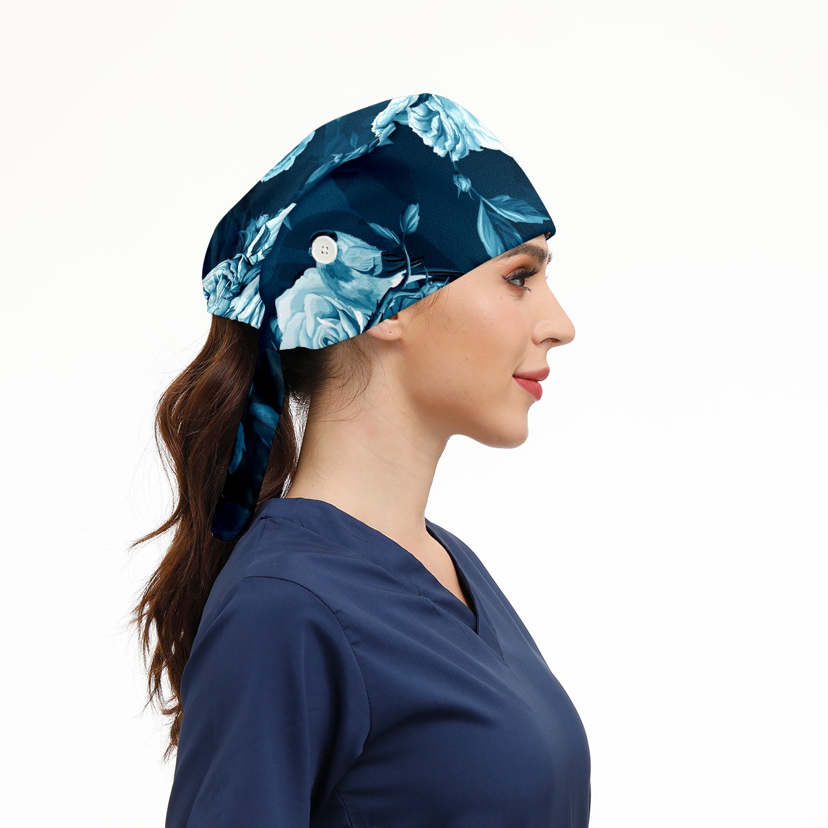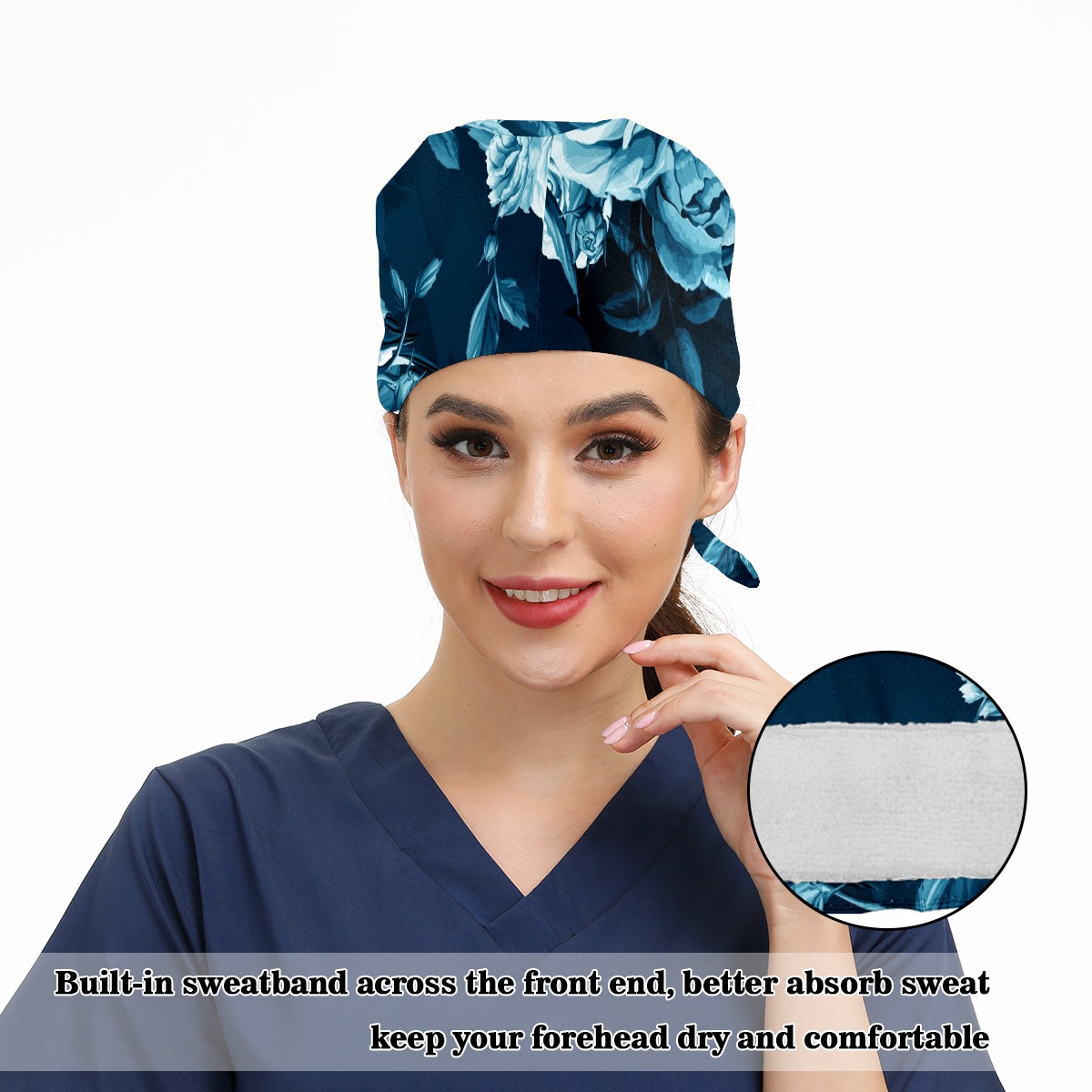 Working Caps with Button & Sweatband Satin Lined Cotton Adjustable Nurse Hats Elastic Band Scrub Cap Surgeon Hat Blue Rose Bird