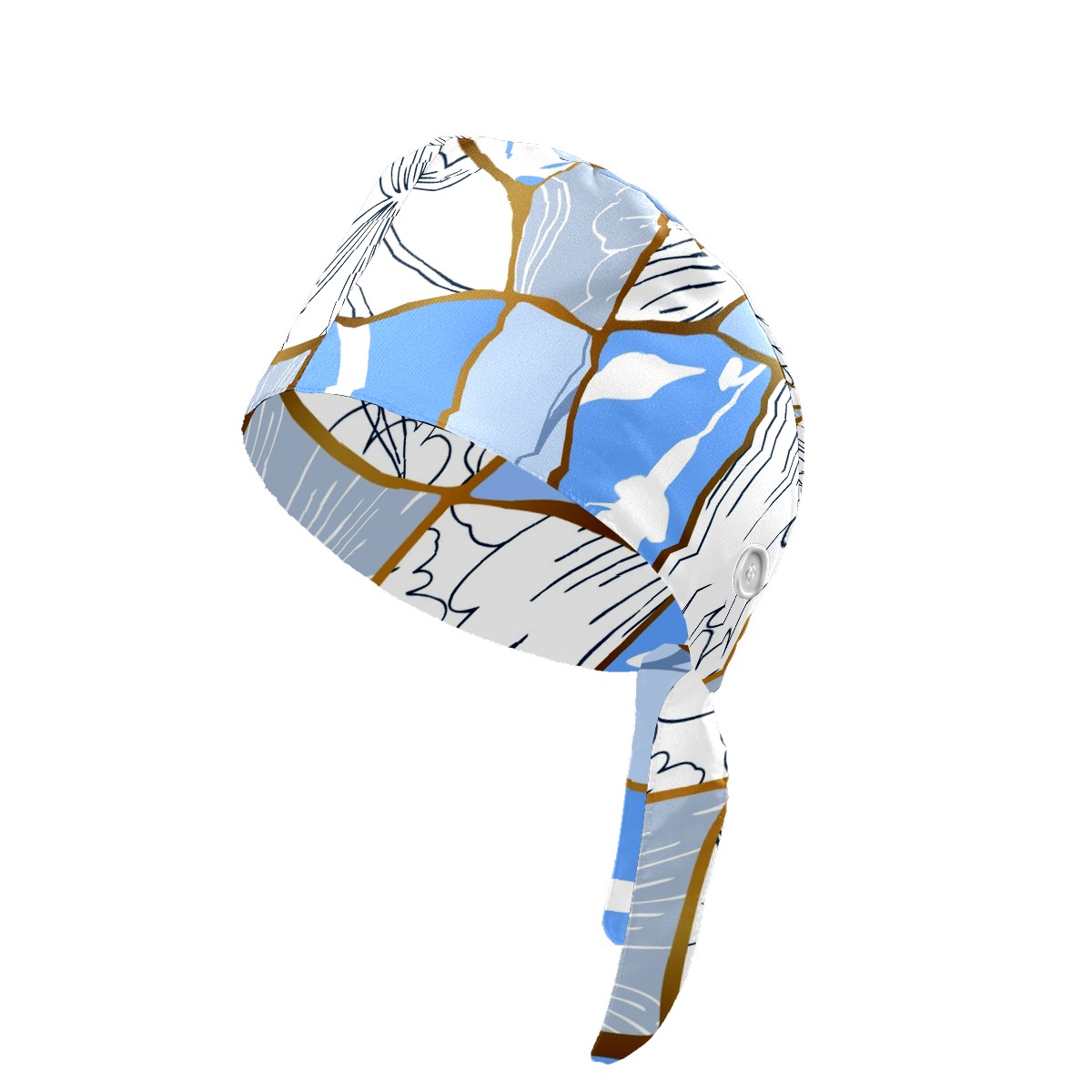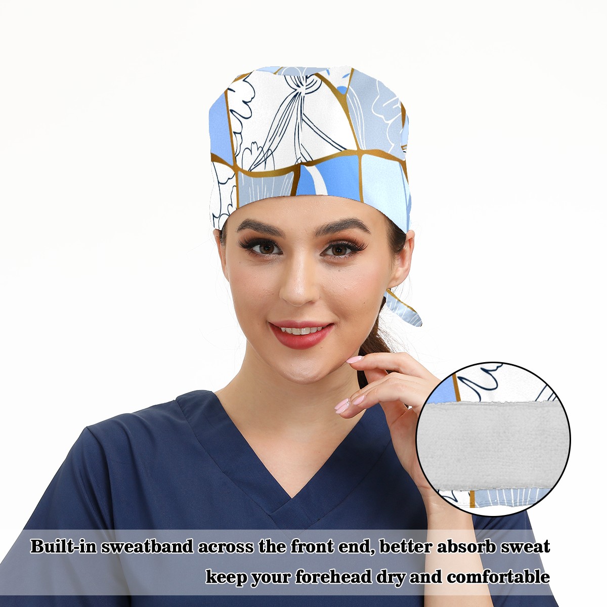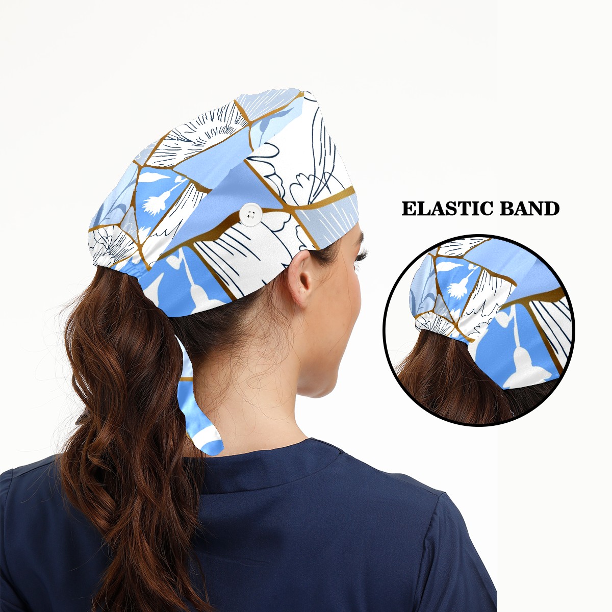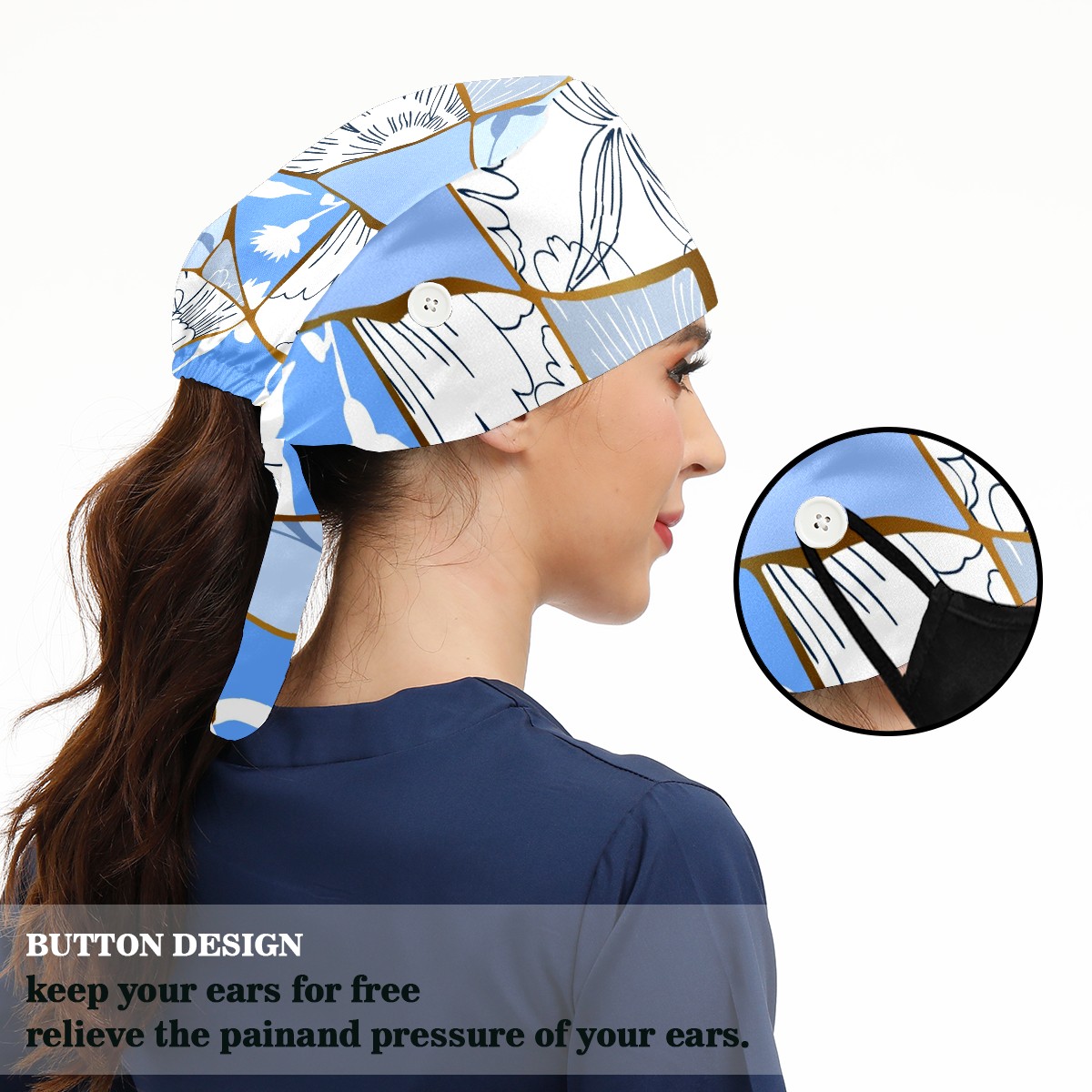 Working Caps with Button & Sweatband Satin Lined Cotton Adjustable Nurse Hats Elastic Band Scrub Cap Surgeon Hat Abstract Mosaic Flowers