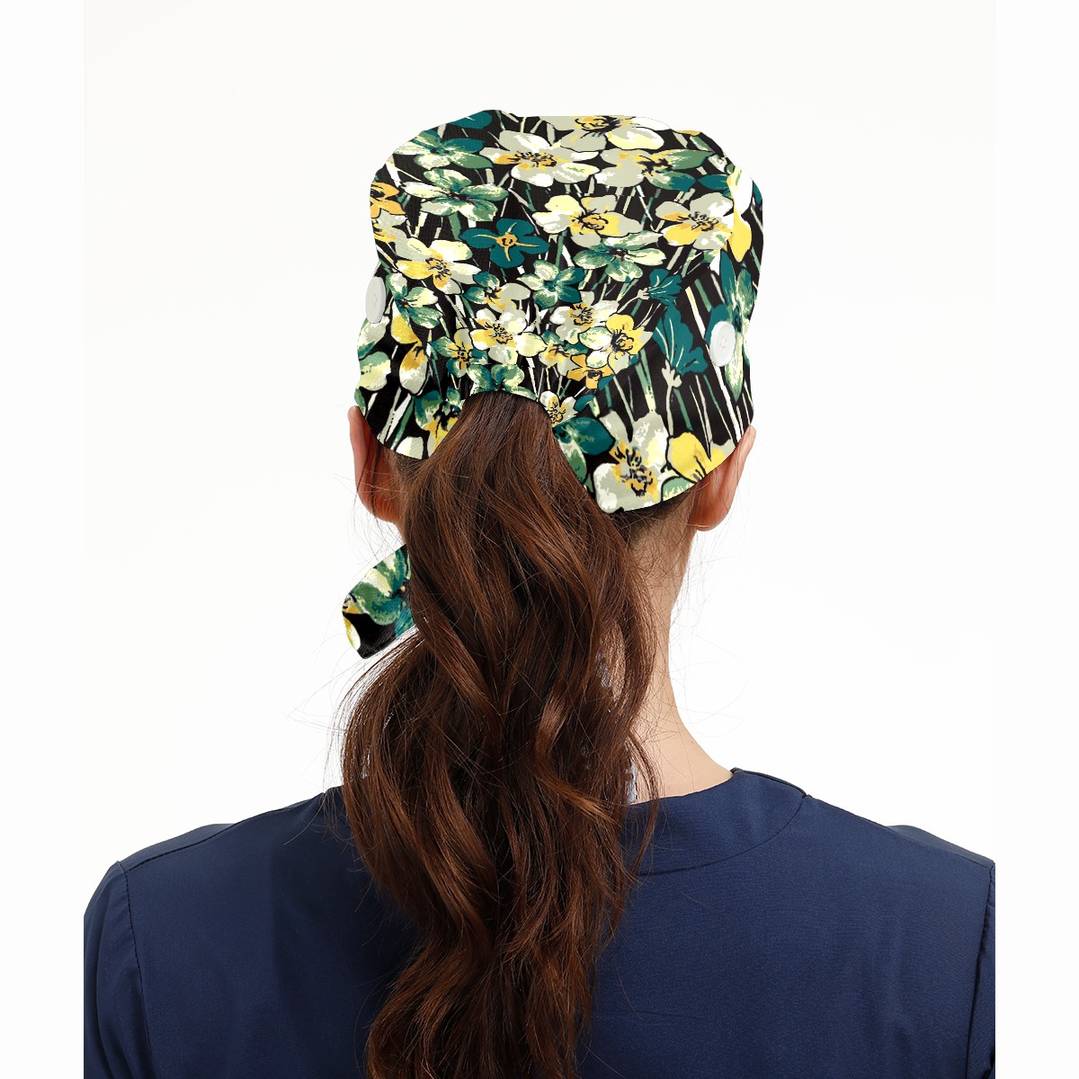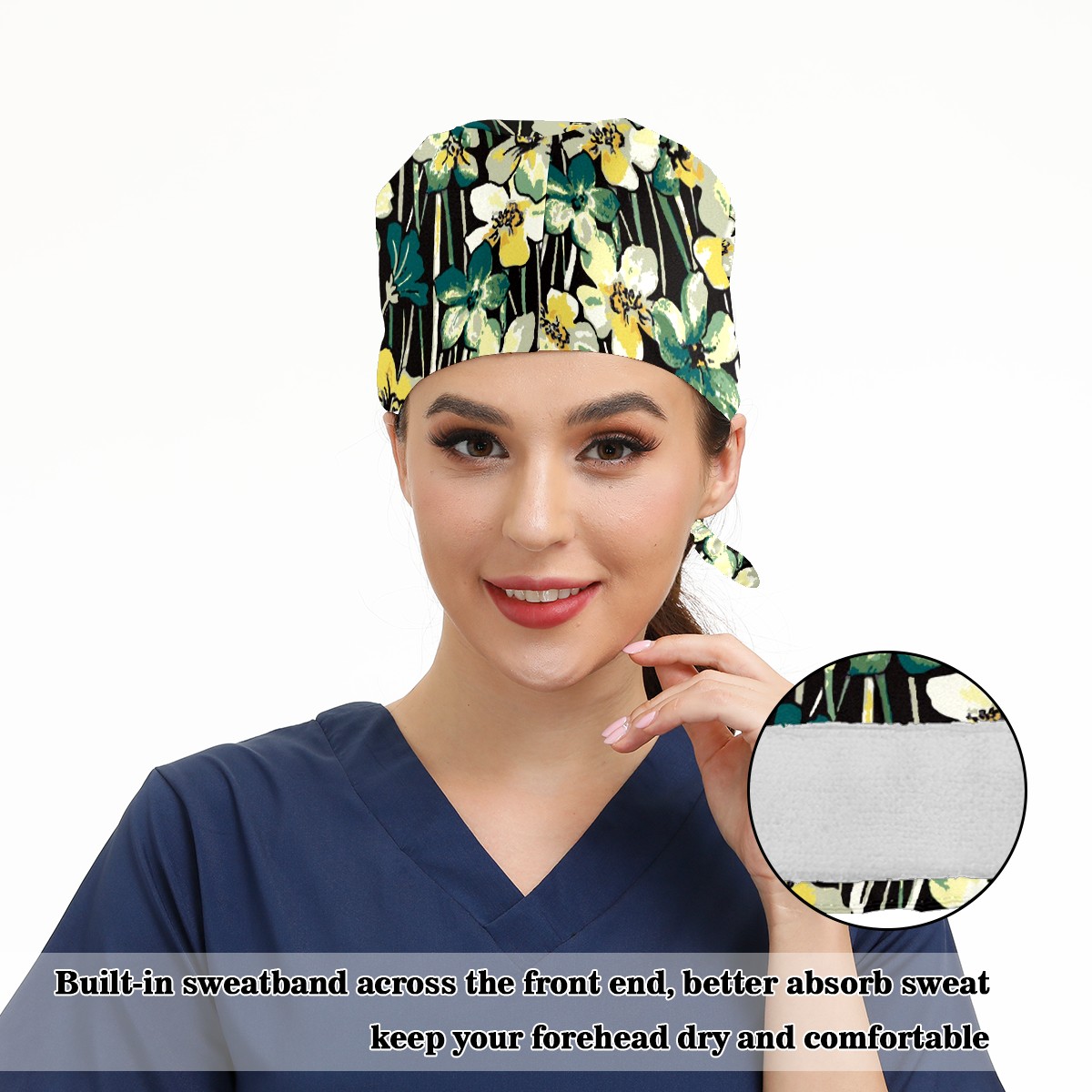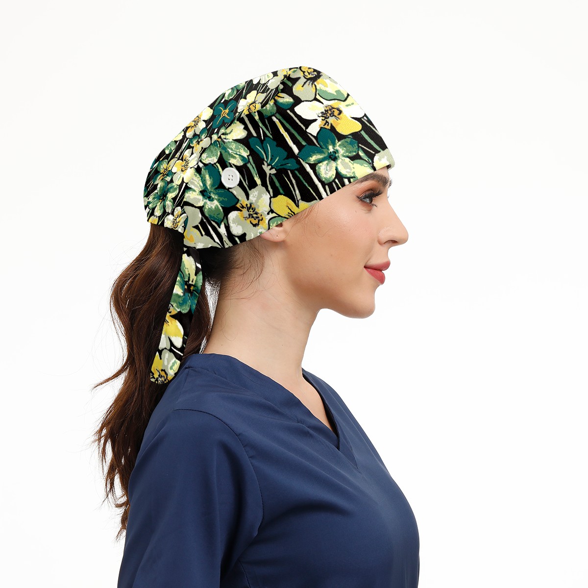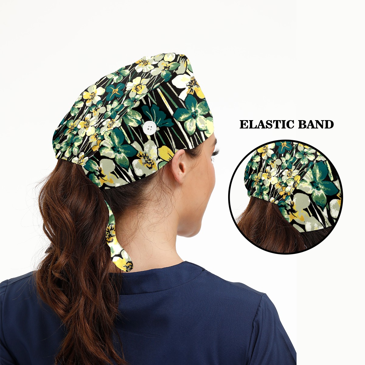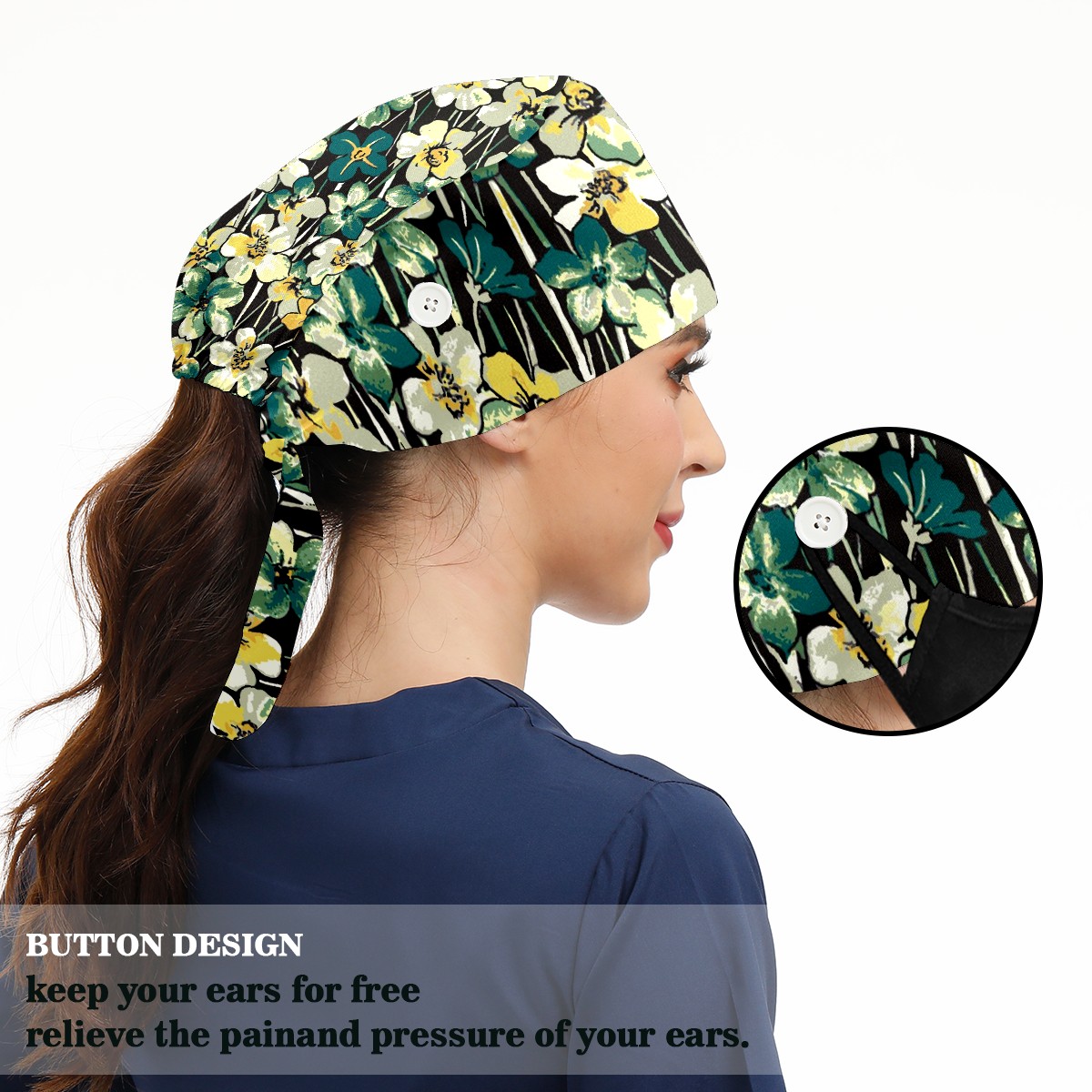 Working Caps with Button & Sweatband Satin Lined Cotton Adjustable Nurse Hats Elastic Band Scrub Cap Surgeon Hat Abstract Green Blooming Flower