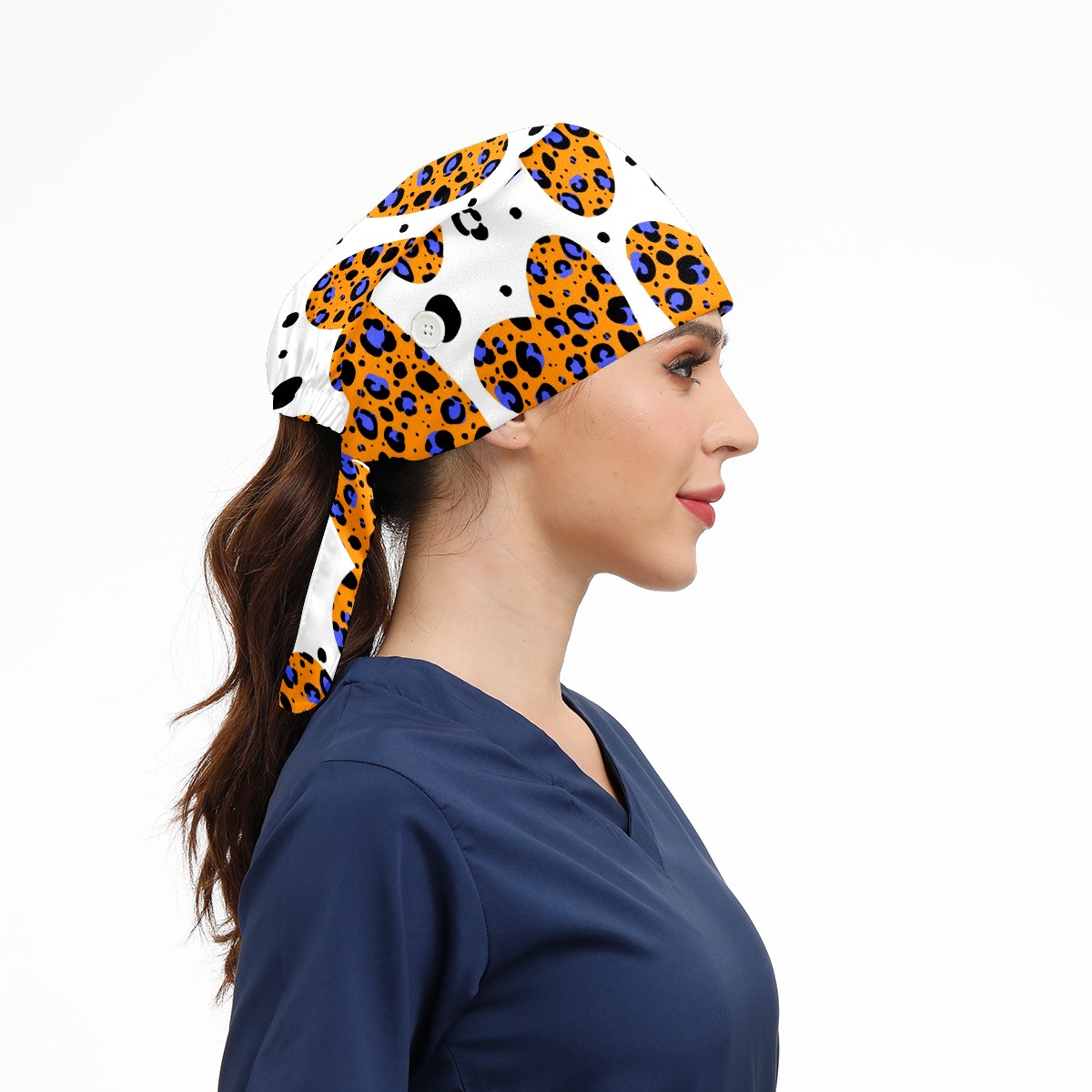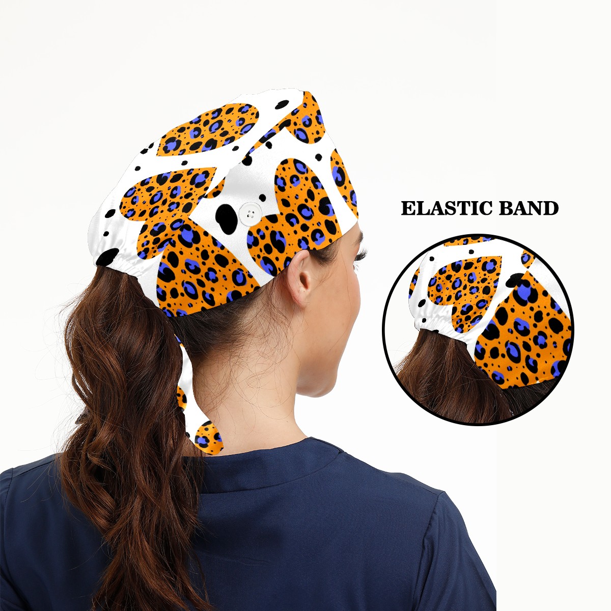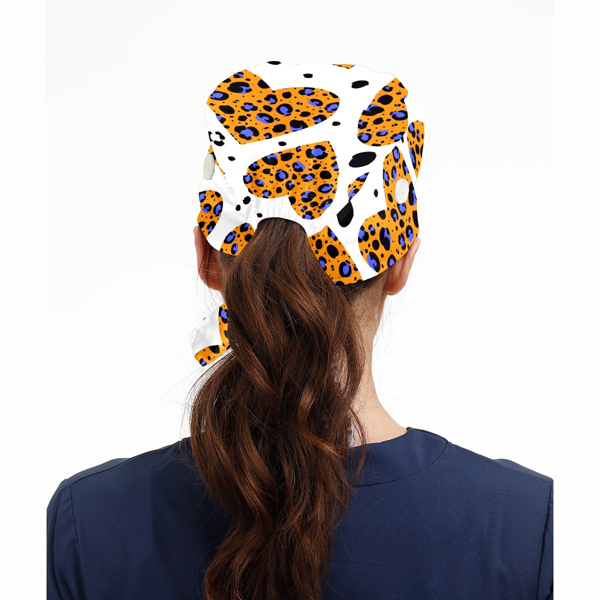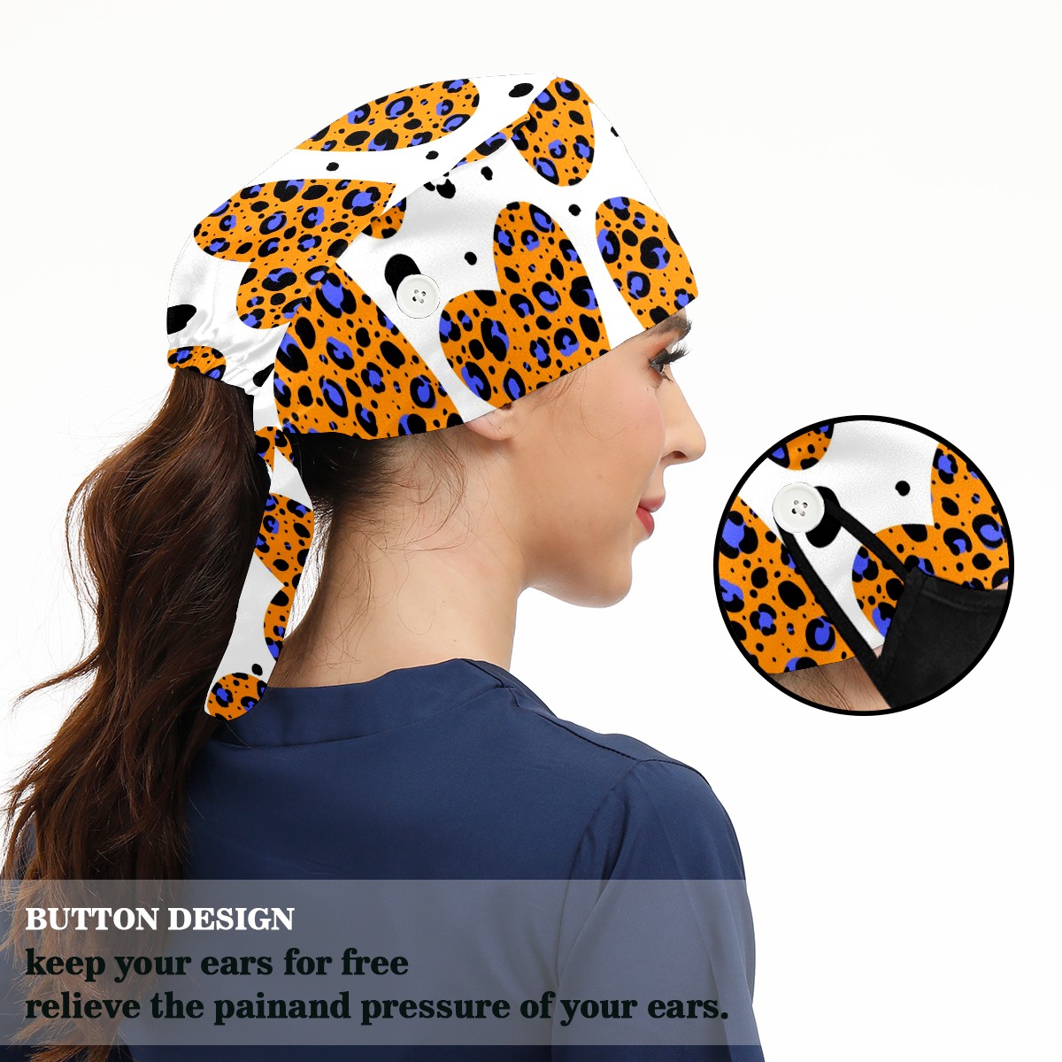Working Caps with Button & Sweatband Satin Lined Cotton Adjustable Nurse Hats Elastic Band Scrub Cap Surgeon Hat Abstract Hearts And Leopard Print