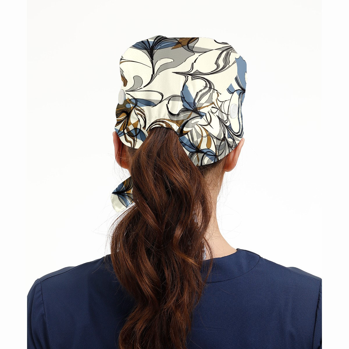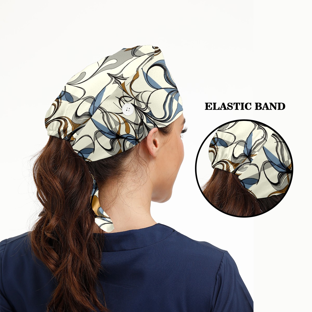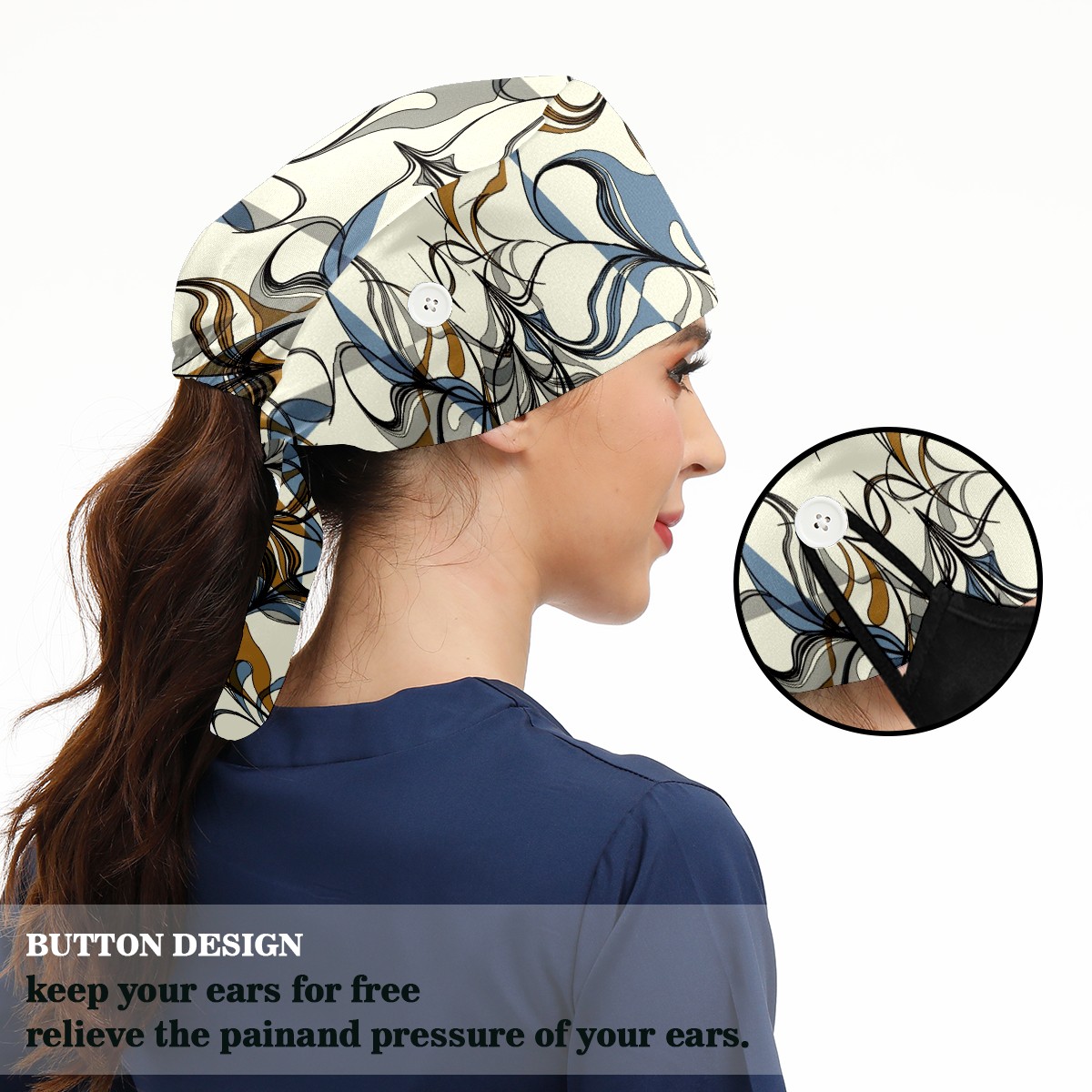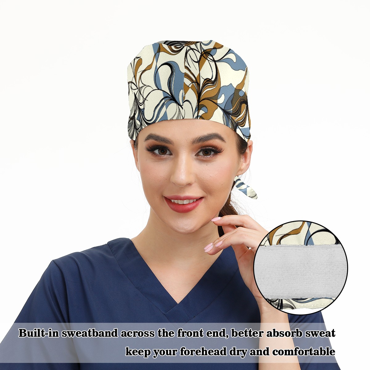 Working Caps with Button & Sweatband Satin Lined Cotton Adjustable Nurse Hats Elastic Band Scrub Cap Surgeon Hat Abstract Flower Leaves