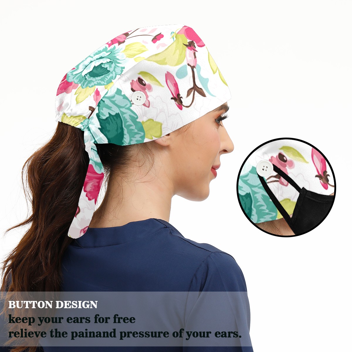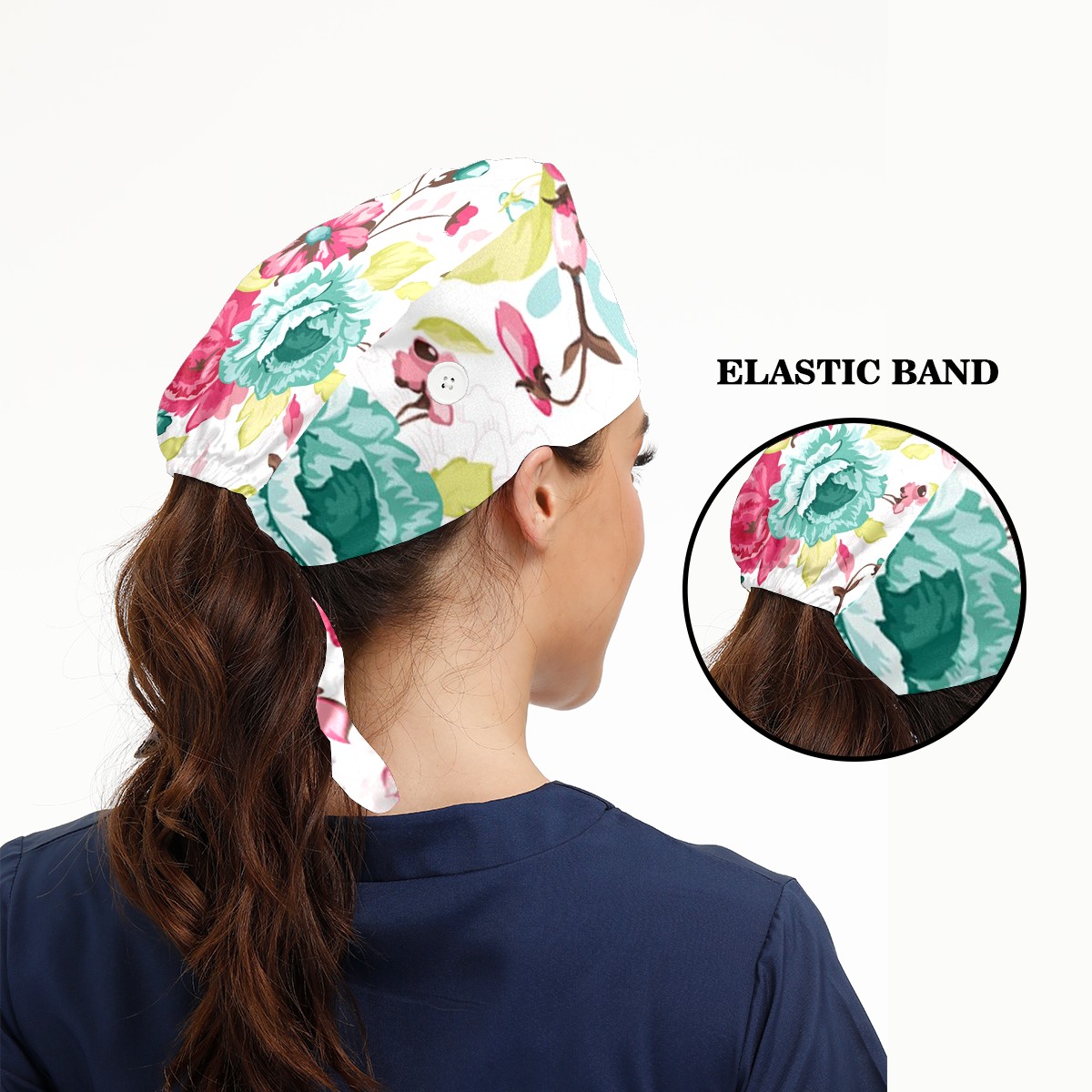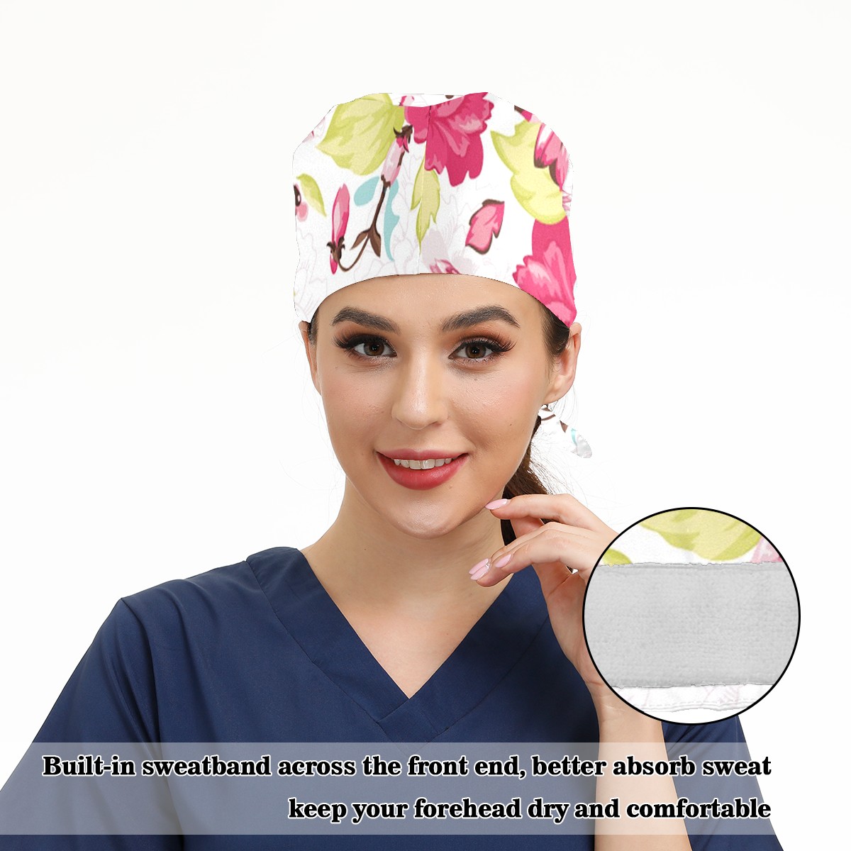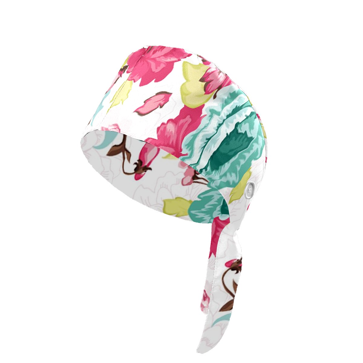 Working Caps with Button & Sweatband Satin Lined Cotton Adjustable Nurse Hats Elastic Band Scrub Cap Surgeon Hat Abstract Elegant Flower