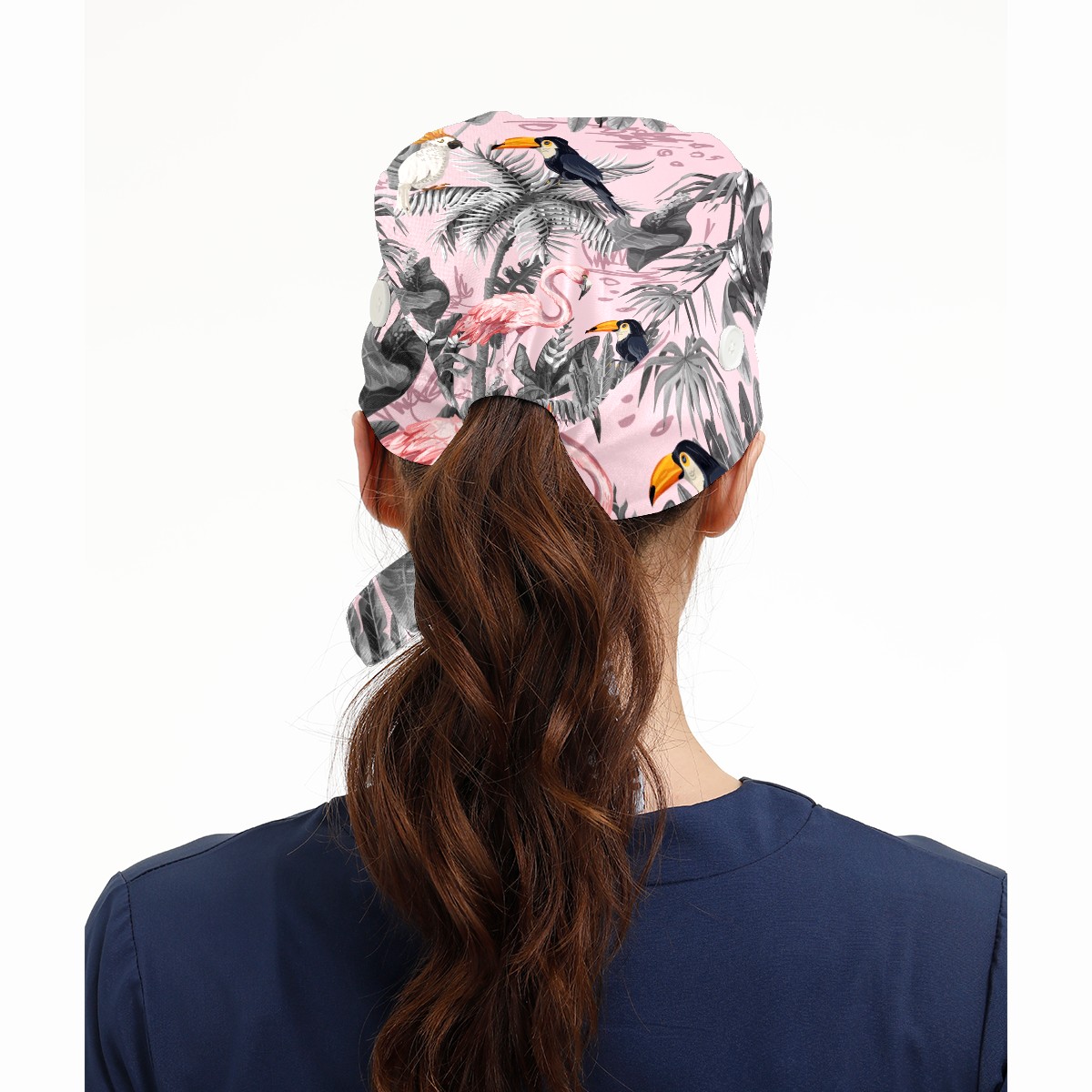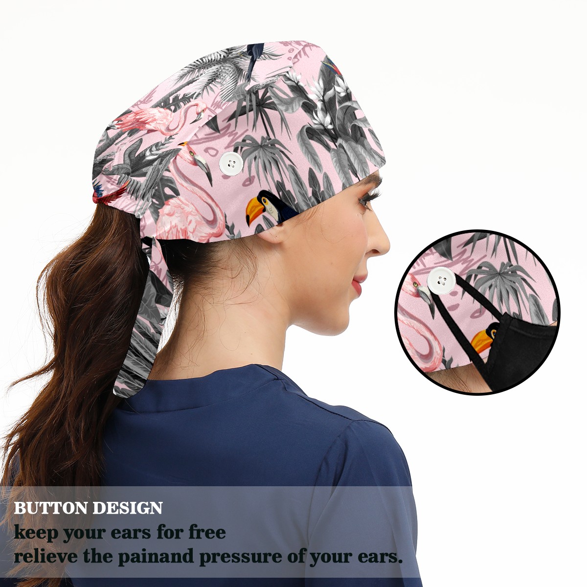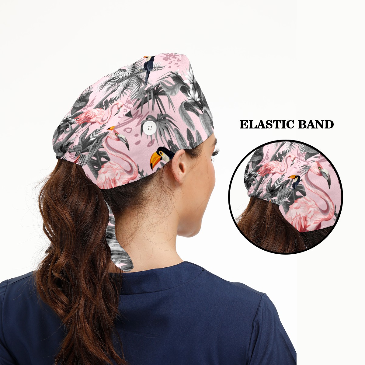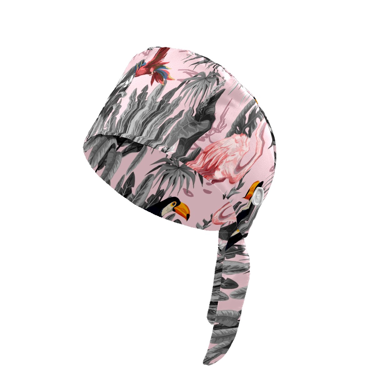 Working Caps with Button & Sweatband Satin Lined Cotton Adjustable Nurse Hats Elastic Band Scrub Cap Surgeon Hat Tropical Pink Flamingo Bird Jungle