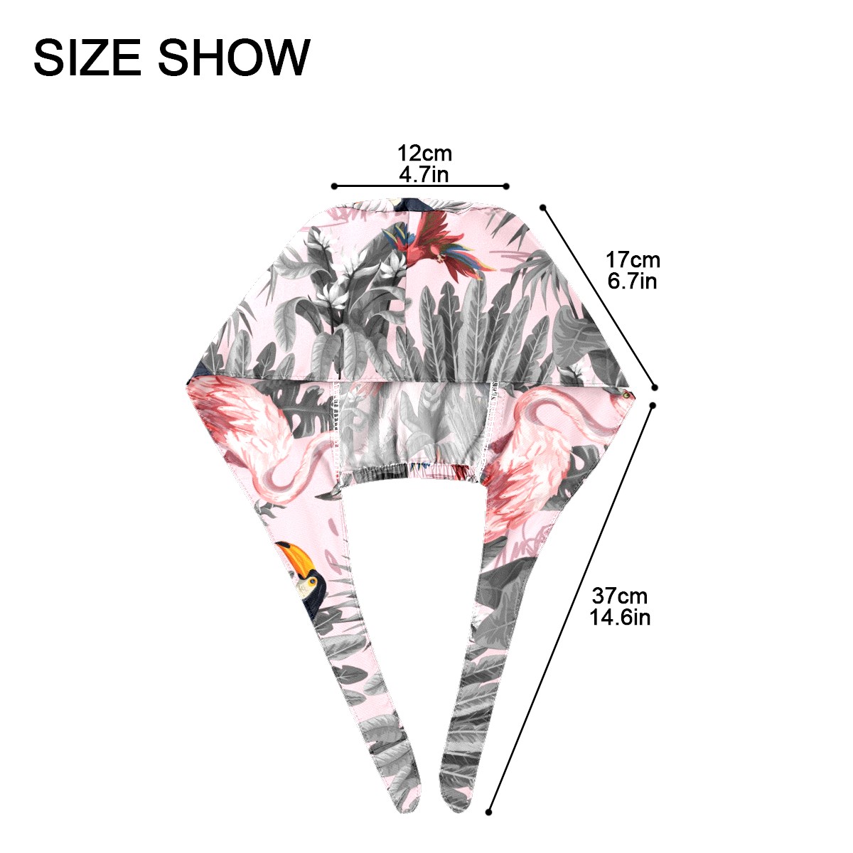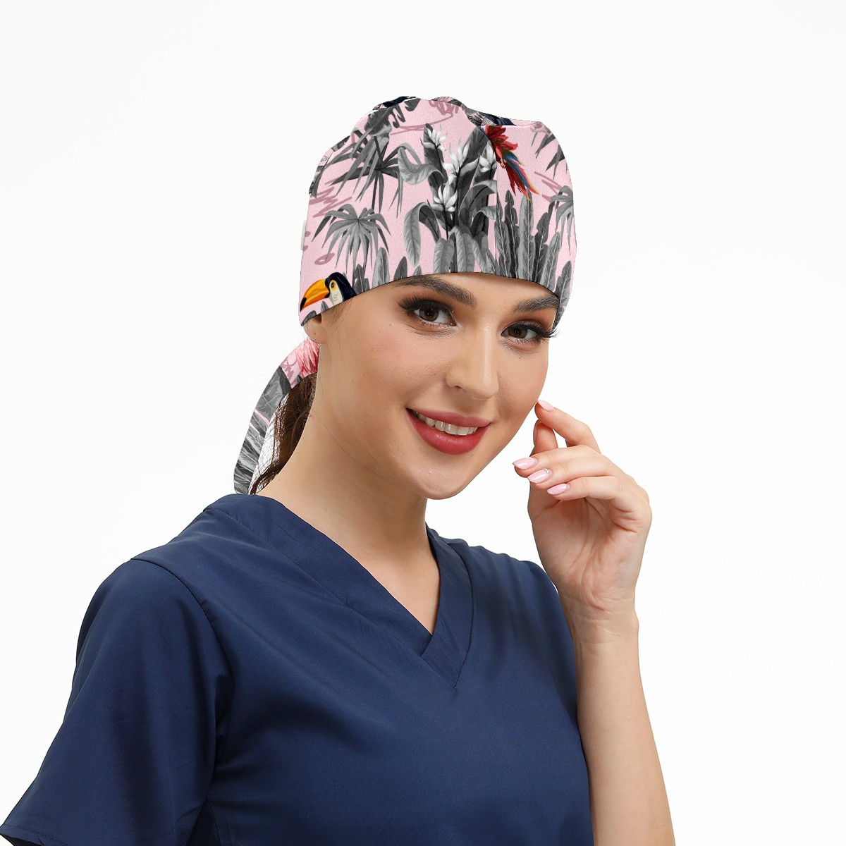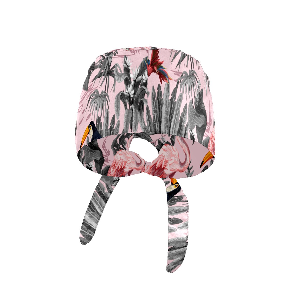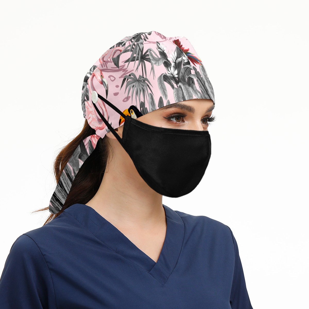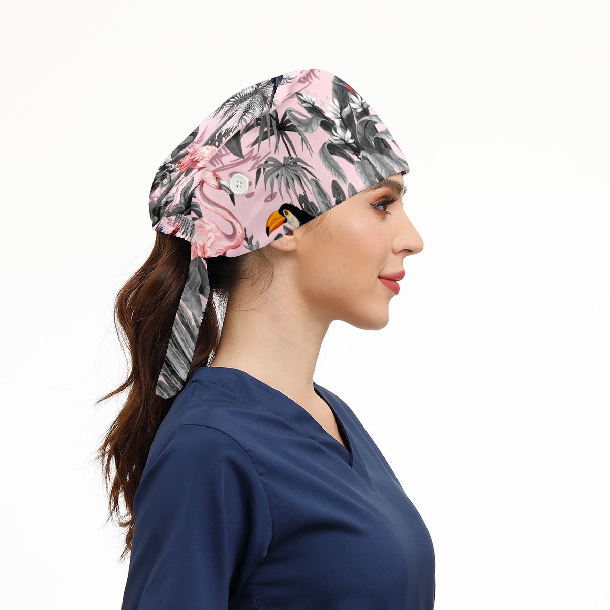 Working Caps with Button & Sweatband Satin Lined Cotton Adjustable Nurse Hats Elastic Band Scrub Cap Surgeon Hat Tropical Pink Flamingo Bird Jungle
