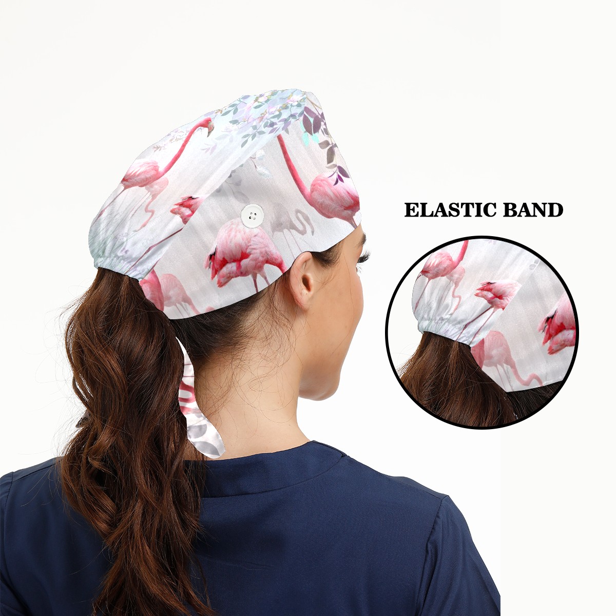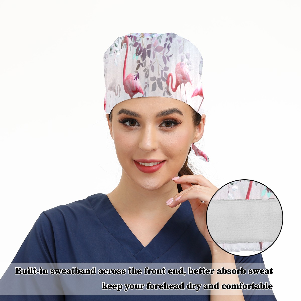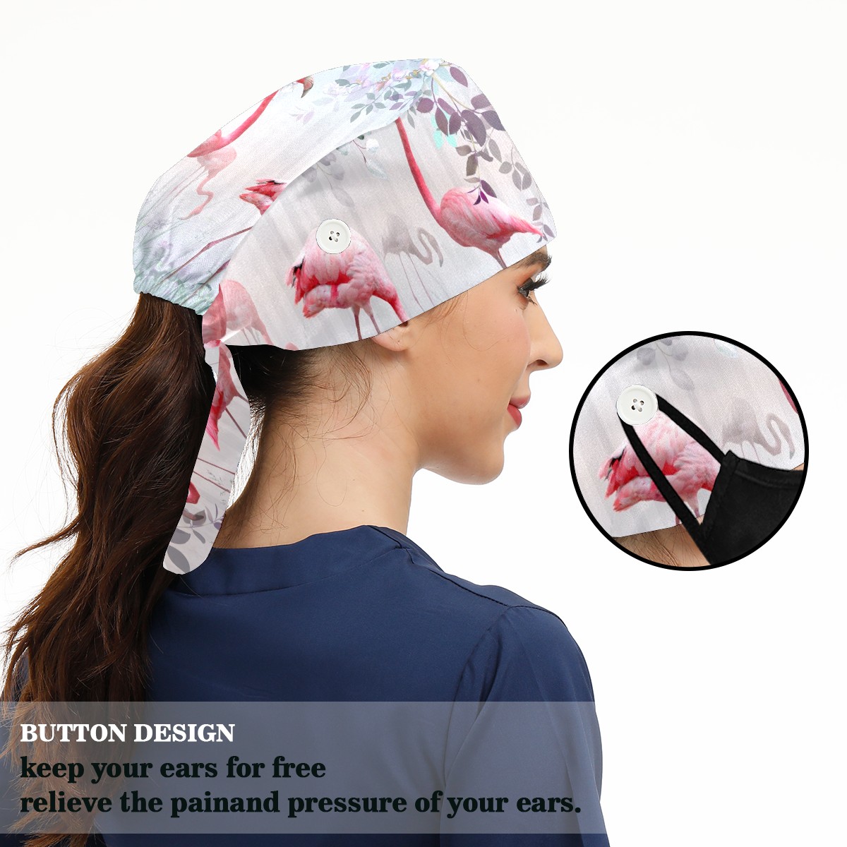 Working Caps with Button & Sweatband Satin Lined Cotton Adjustable Nurse Hats Elastic Band Scrub Cap Surgeon Hat Pink Flamingo In Turquoise Fog
