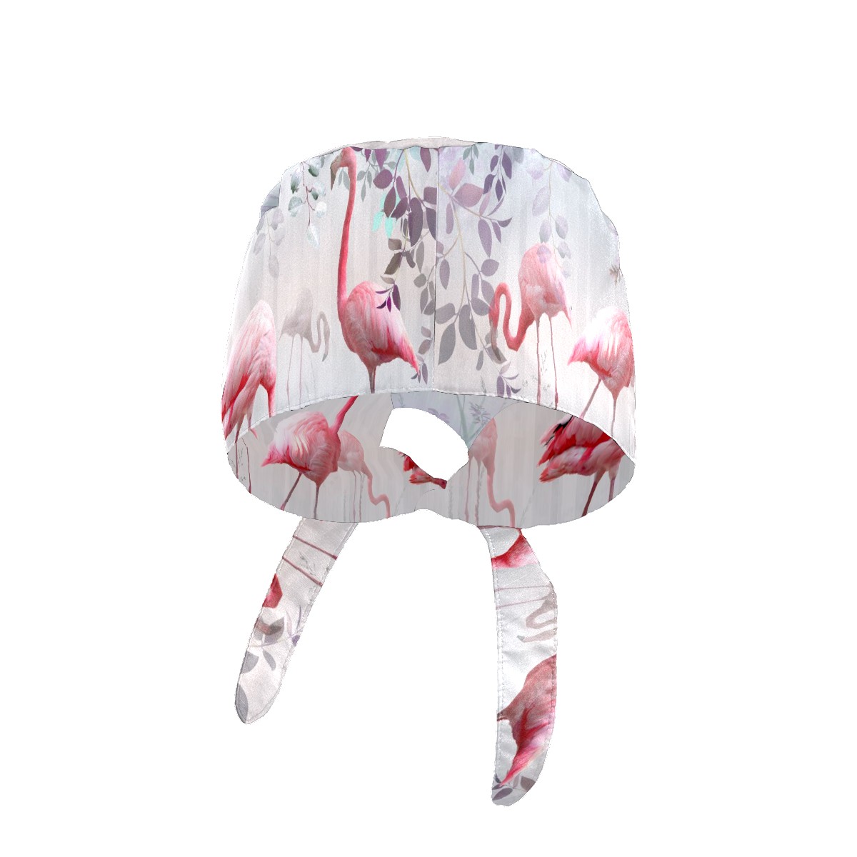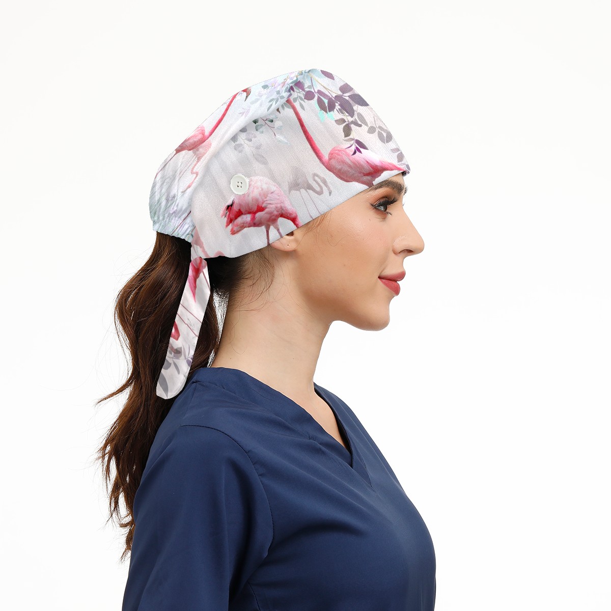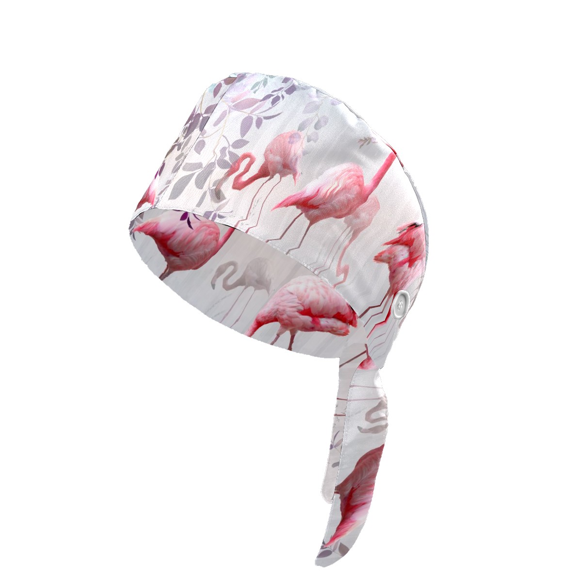 Working Caps with Button & Sweatband Satin Lined Cotton Adjustable Nurse Hats Elastic Band Scrub Cap Surgeon Hat Pink Flamingo In Turquoise Fog
