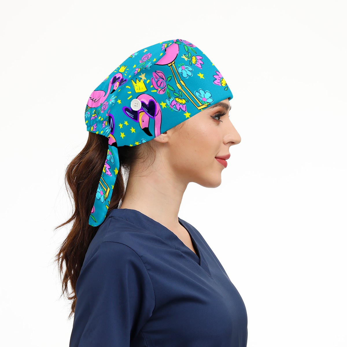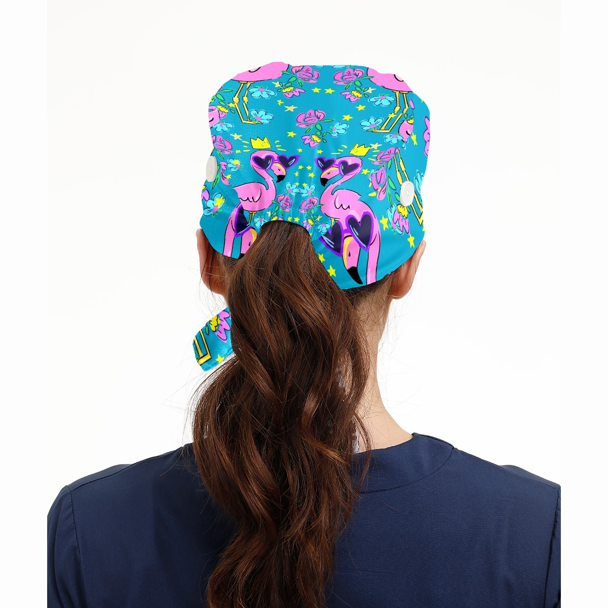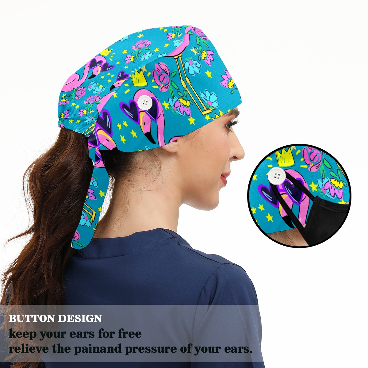 Working Caps with Button & Sweatband Satin Lined Cotton Adjustable Nurse Hats Elastic Band Scrub Cap Surgeon Hat Cute Pink Flamingo Flower