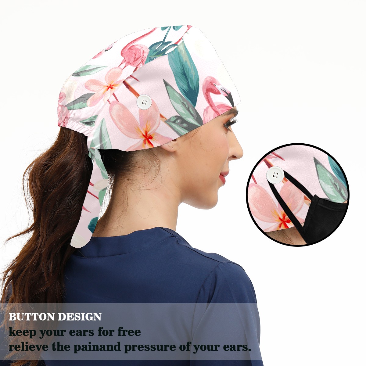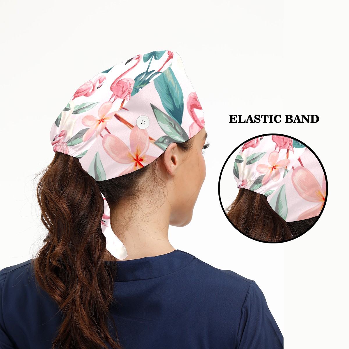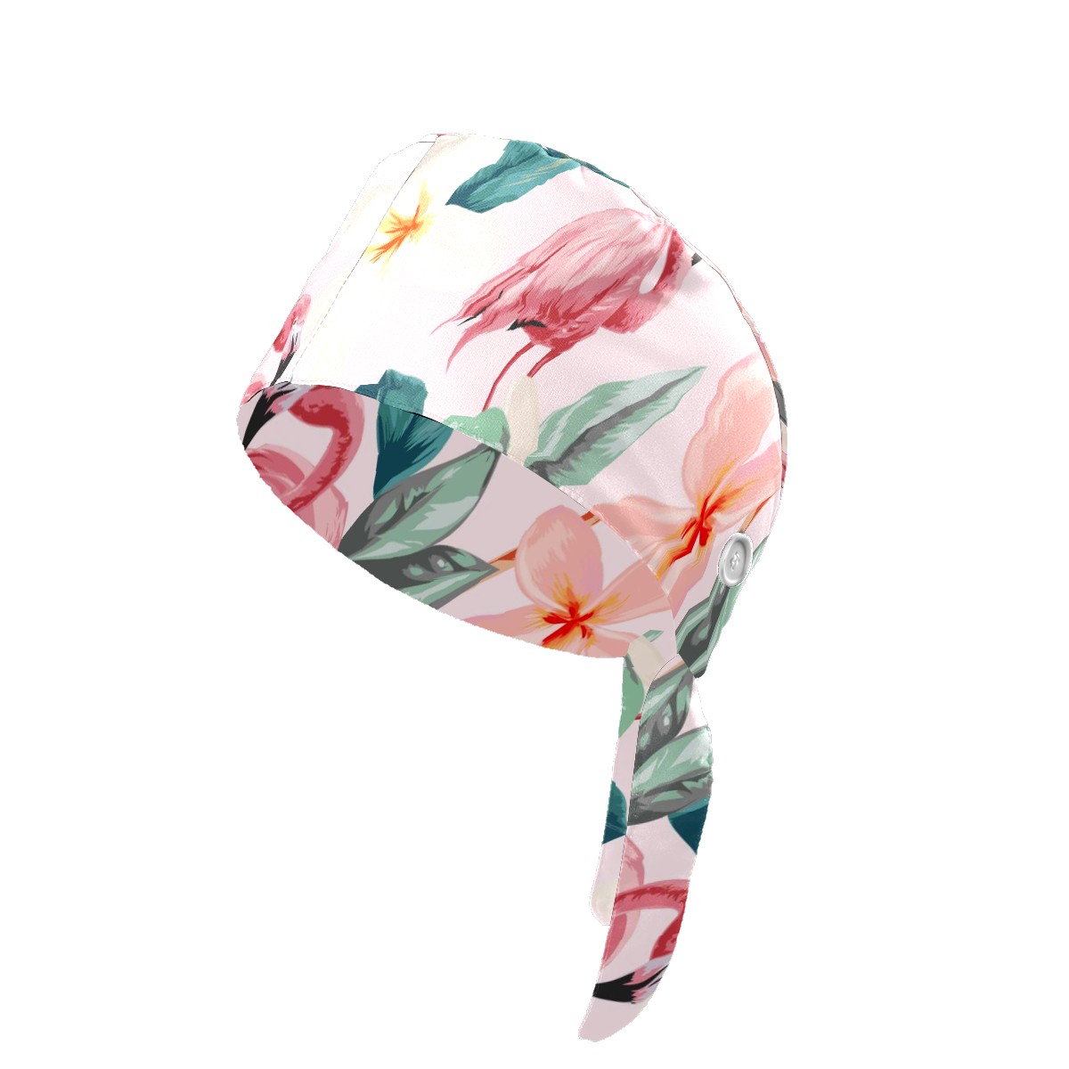 Working Caps with Button & Sweatband Satin Lined Cotton Adjustable Nurse Hats Elastic Band Scrub Cap Surgeon Hat Flamingos And Tropical Flowers