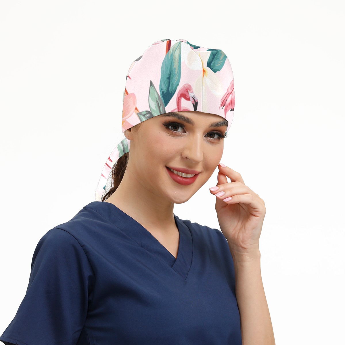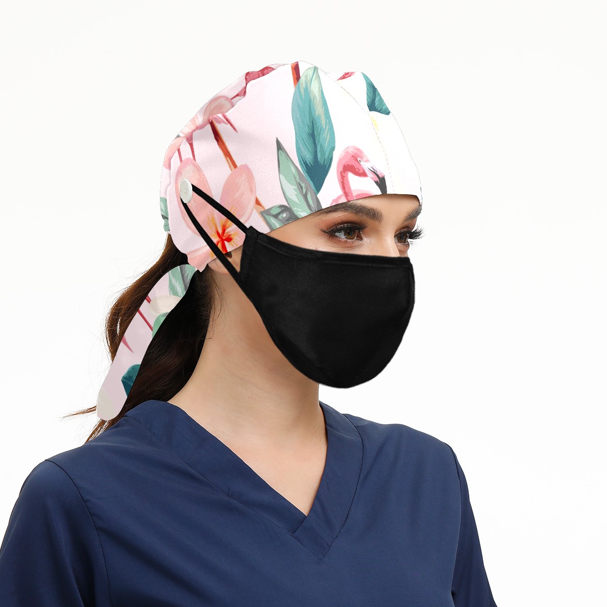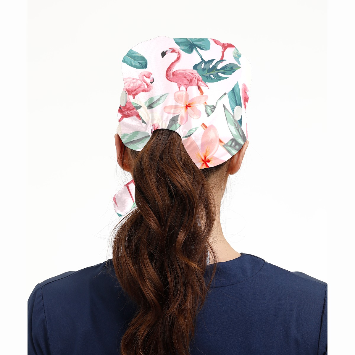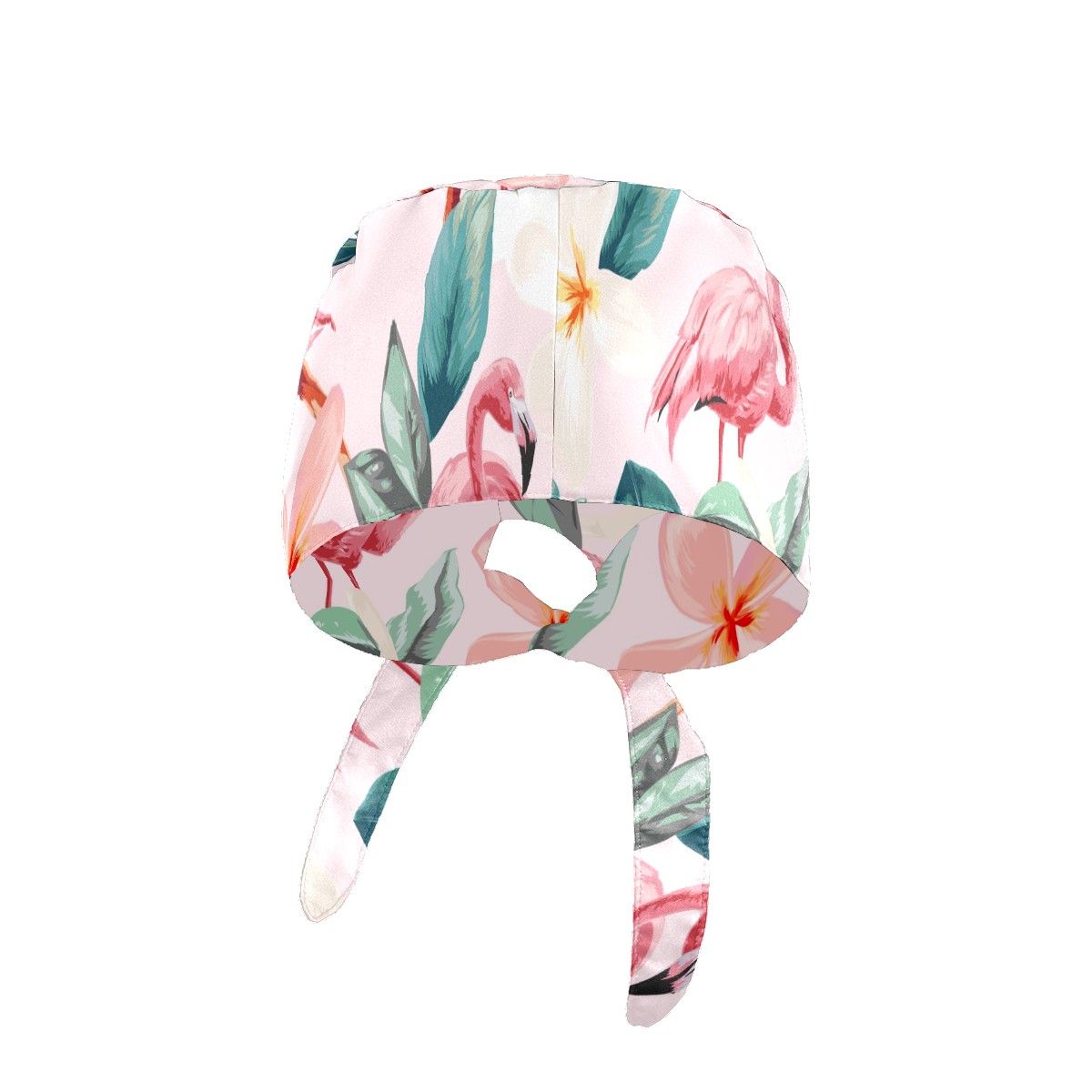 Working Caps with Button & Sweatband Satin Lined Cotton Adjustable Nurse Hats Elastic Band Scrub Cap Surgeon Hat Flamingos And Tropical Flowers