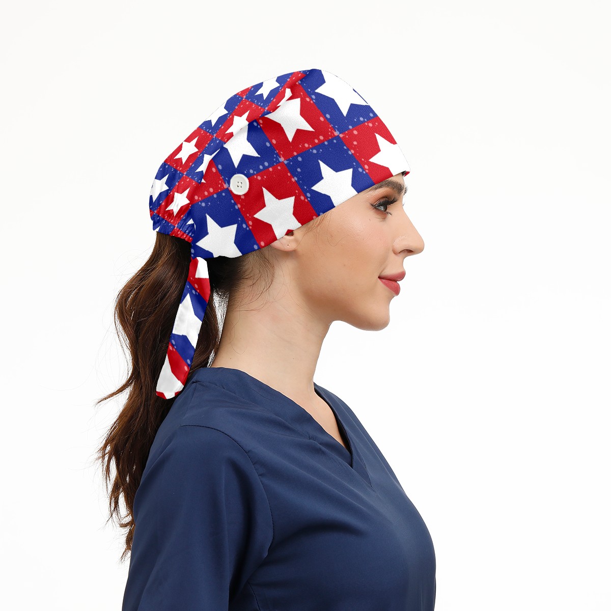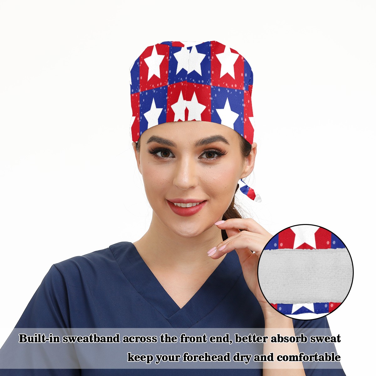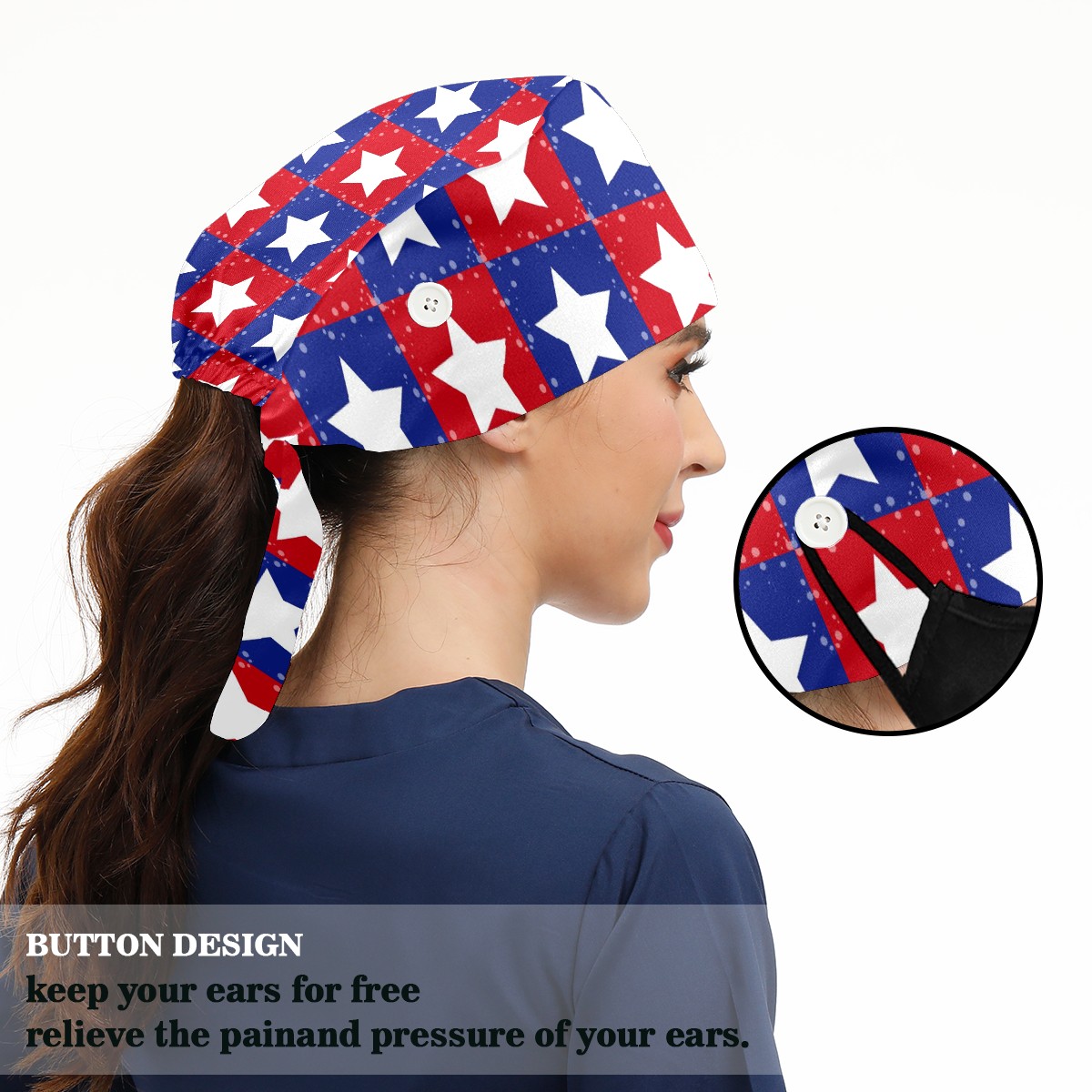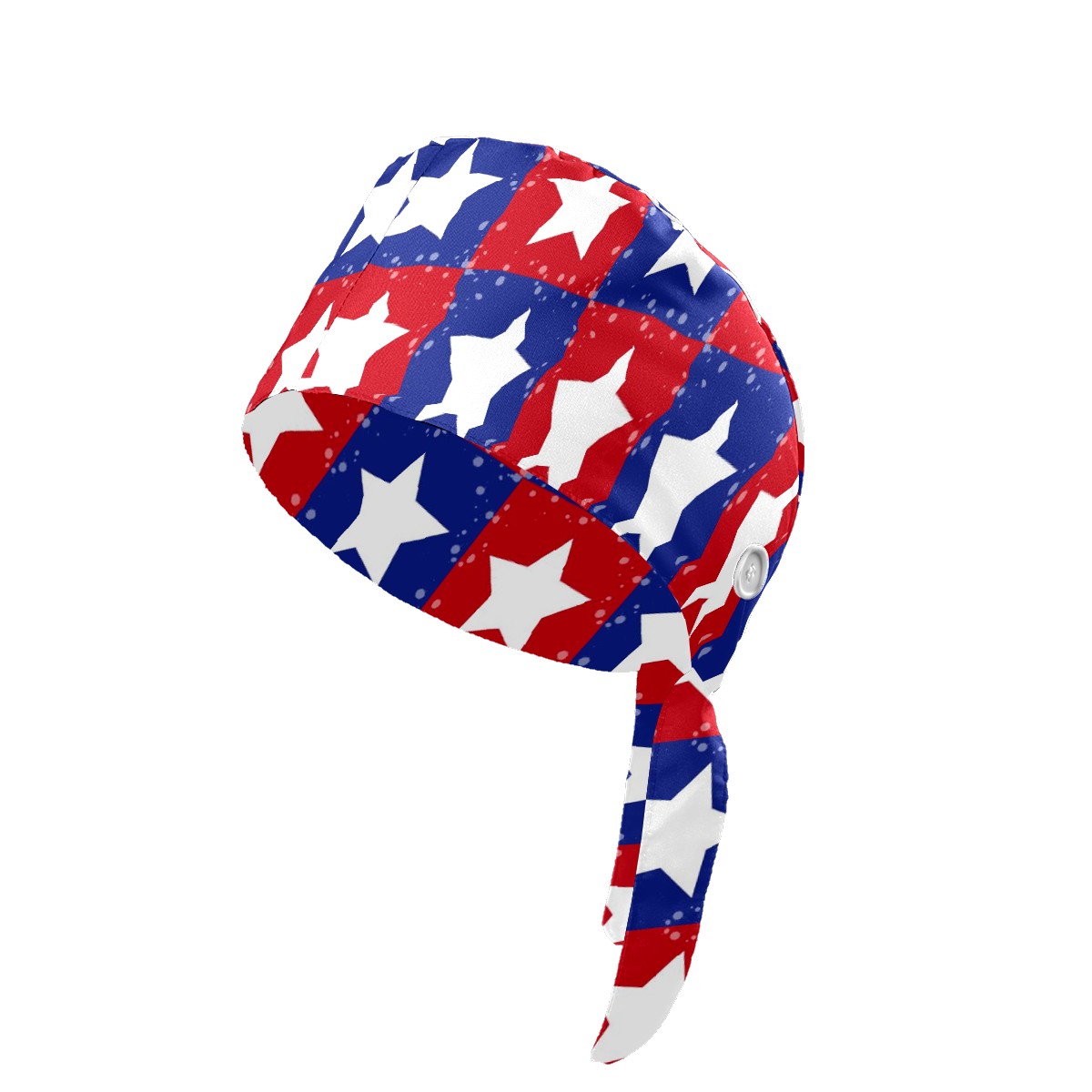Working Caps with Button & Sweatband Satin Lined Cotton Adjustable Nurse Hats Elastic Band Scrub Cap Surgeon Hat Patriotic Stars Grid