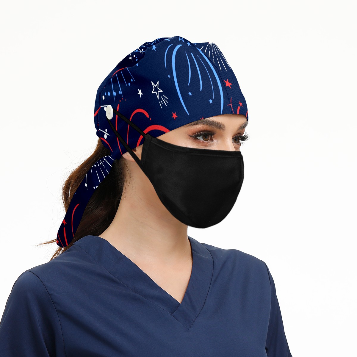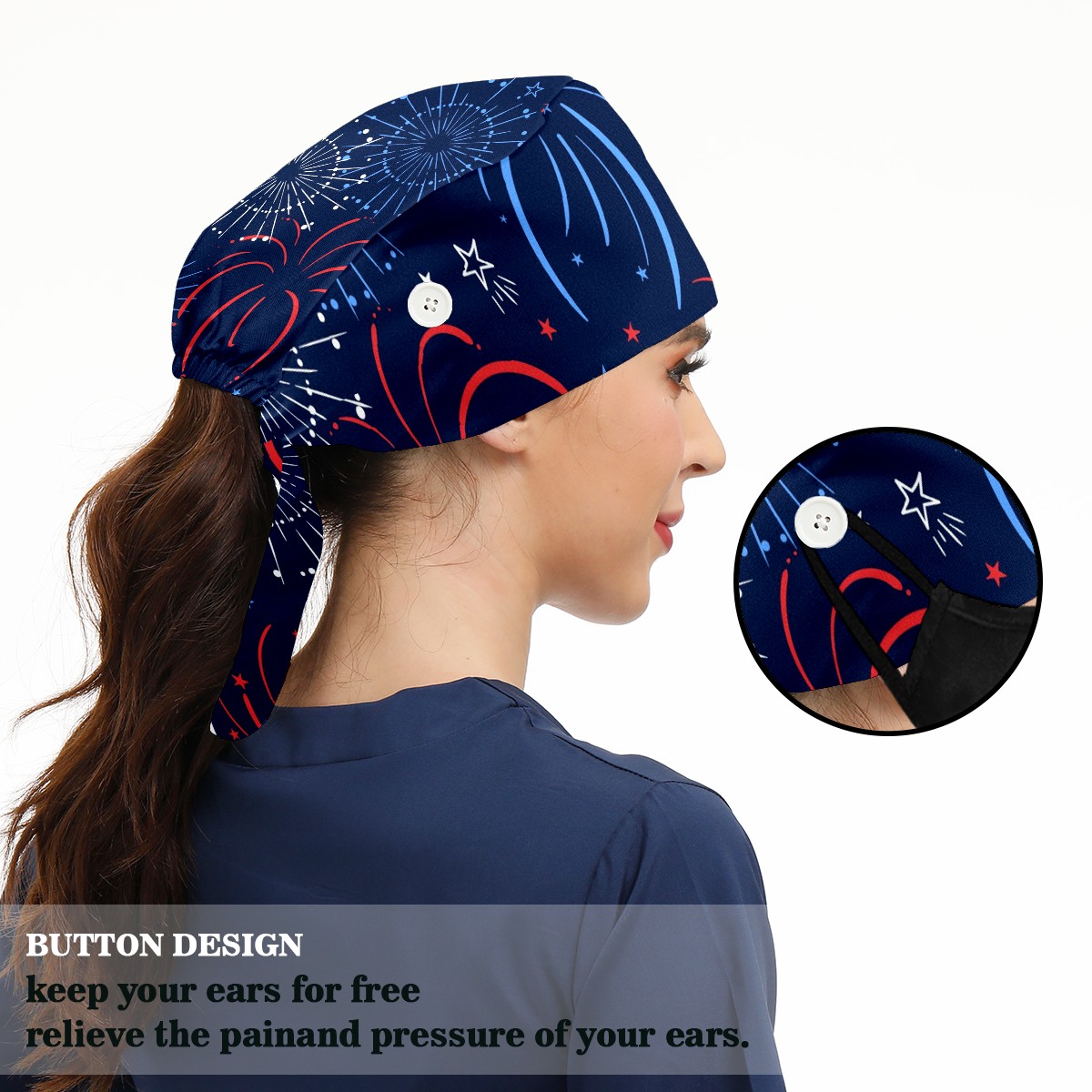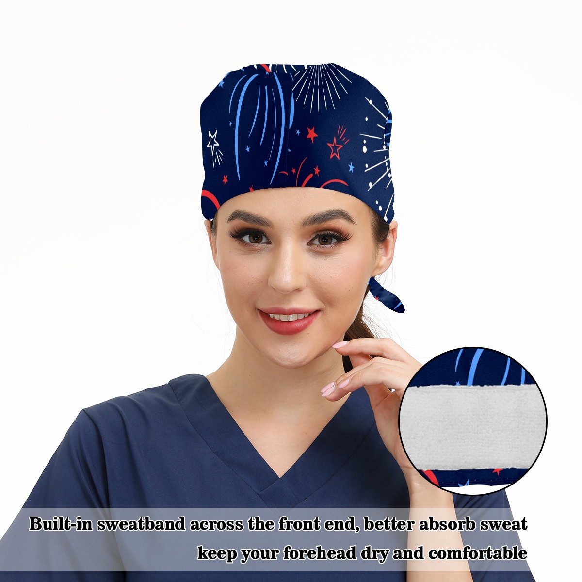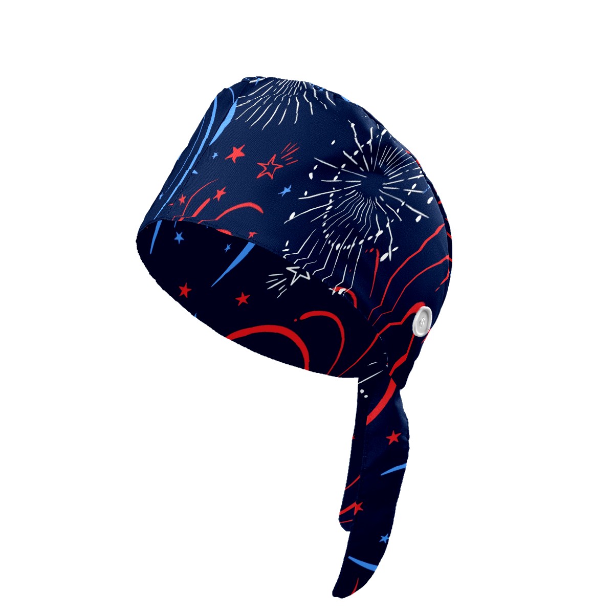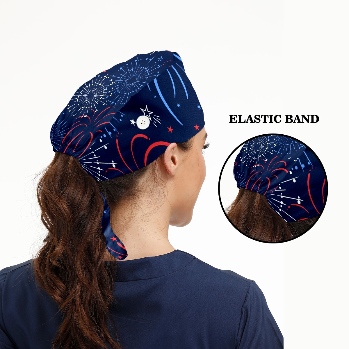 Working Caps with Button & Sweatband Satin Lined Cotton Adjustable Nurse Hats Elastic Band Scrub Cap Surgeon Hat Fun Firework American Independence Day