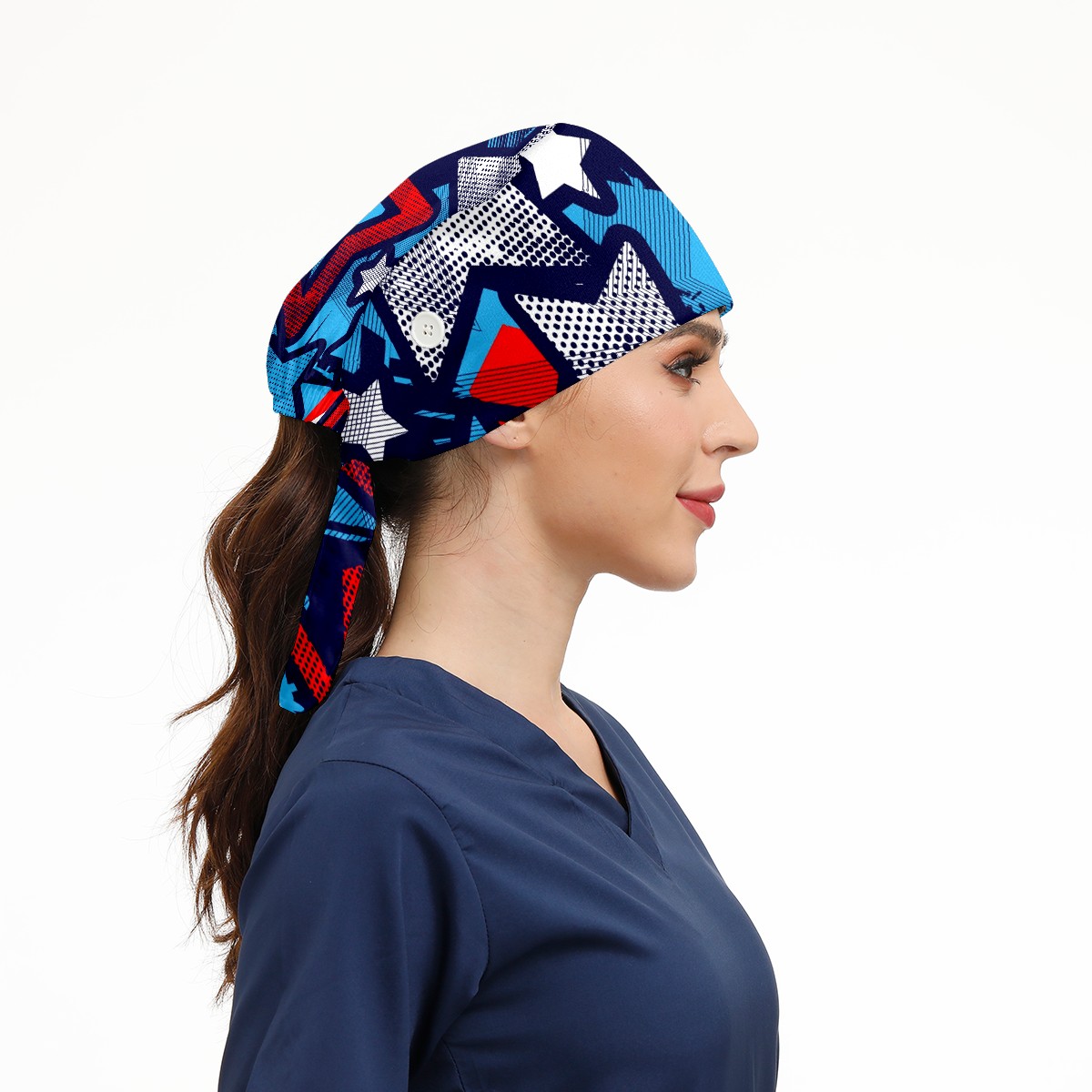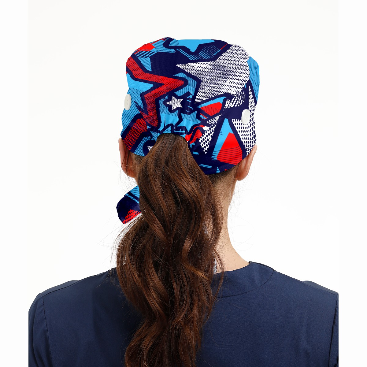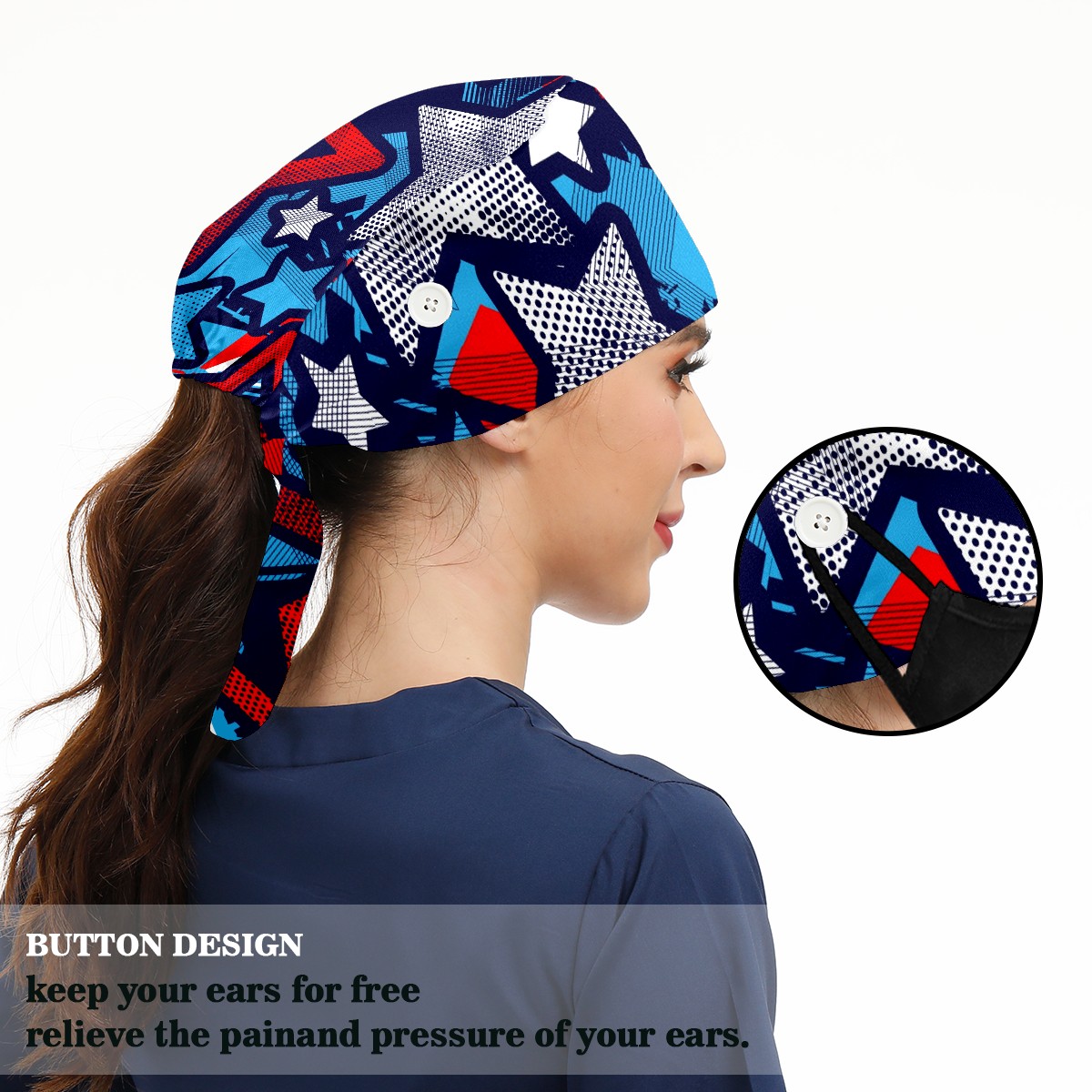 Working Caps with Button & Sweatband Satin Lined Cotton Adjustable Nurse Hats Elastic Band Scrub Cap Surgeon Hat American Independence Day Stars Doodle